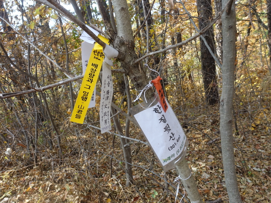 11;32 한질 윗산(301m)정상입니다. 서래야님이 한질 뒷산으로 잘못 코팅판을 달았습니다.