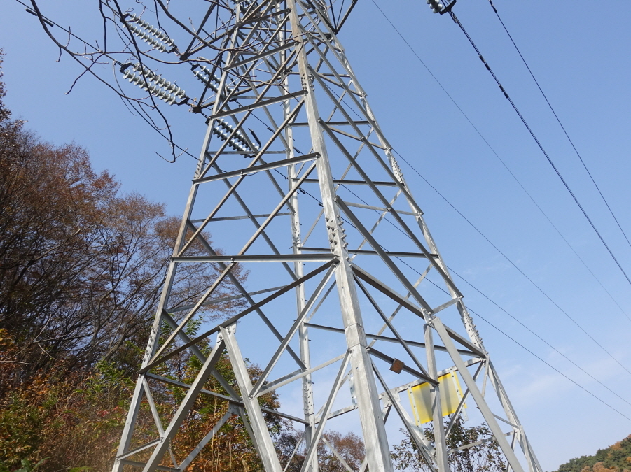 12;11 한전 철탑입니다. 잡목과 거친 등로 헤집고 우측능선으로 내려선후 임도에 올라 주능 우측으로 능선 이어갑니다.
