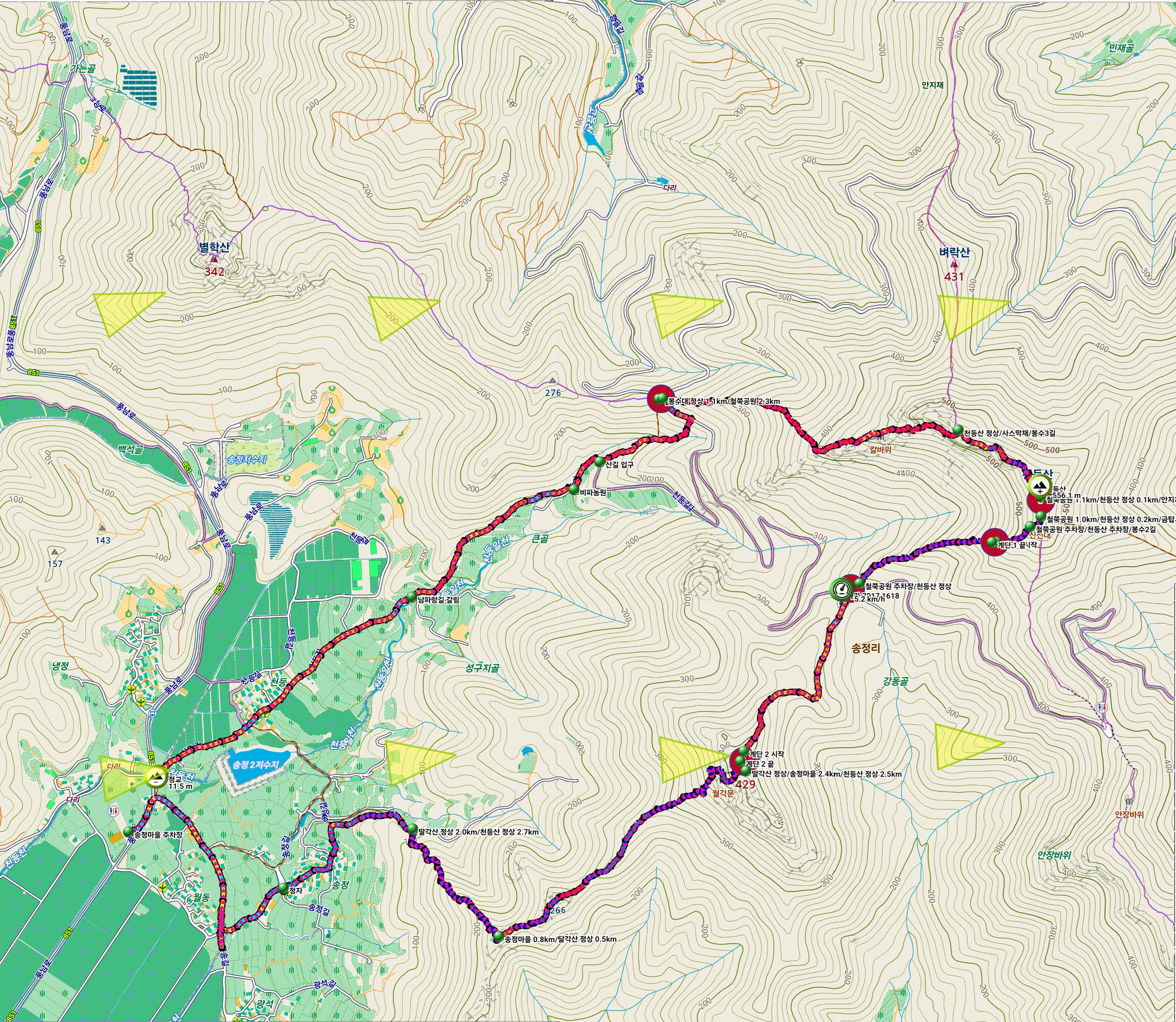 ◈ 코스: 송정교-사스막재 쉼터-천등산-신선대-양천잇재-월각산-송정마을회관-송정마을 주차장