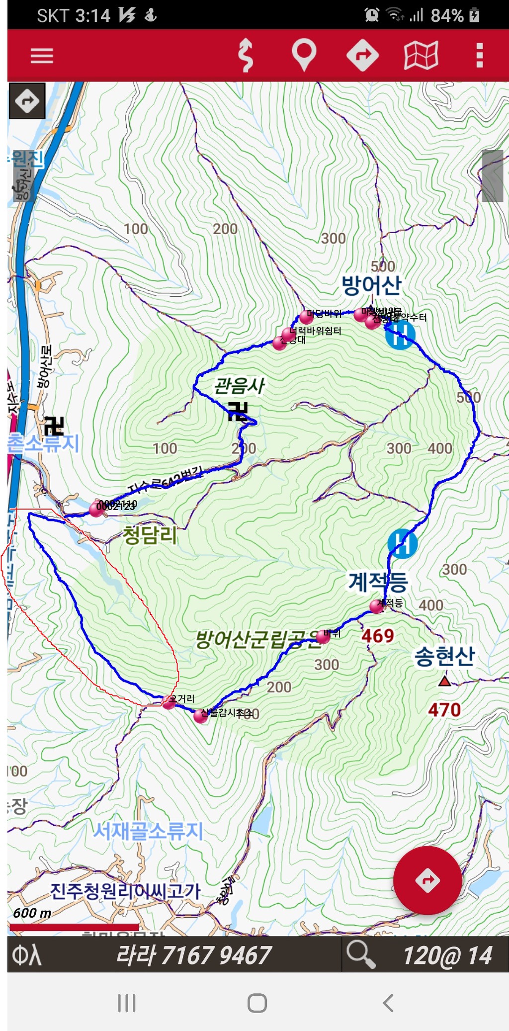 3. 산행코스 : 들말마을→관음사→매봉들(갈미봉)→삼거리 마당바위→마당바위→약수터→방어산 정상→필설산→마애불갈림길→계적등→산불감시초소(330m)→오거리→들말마을