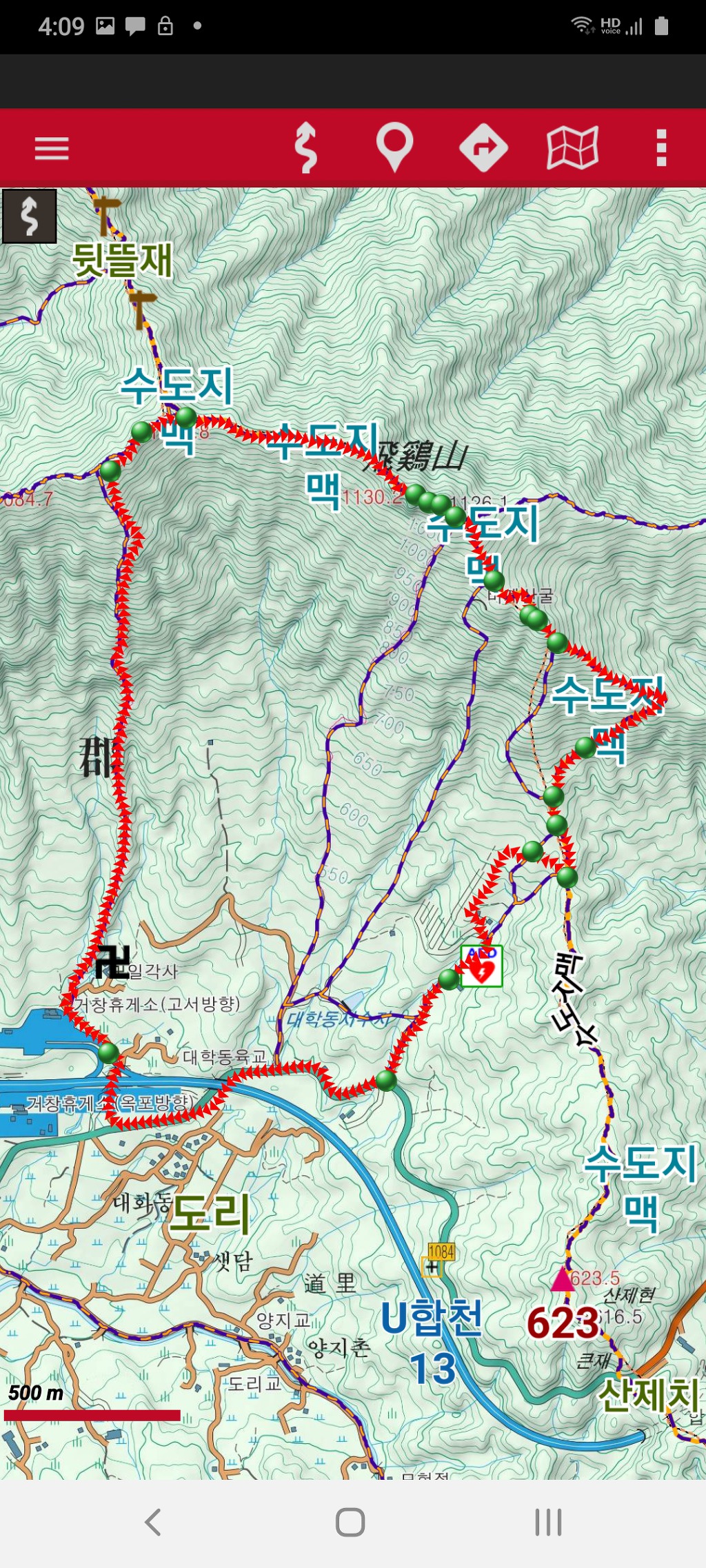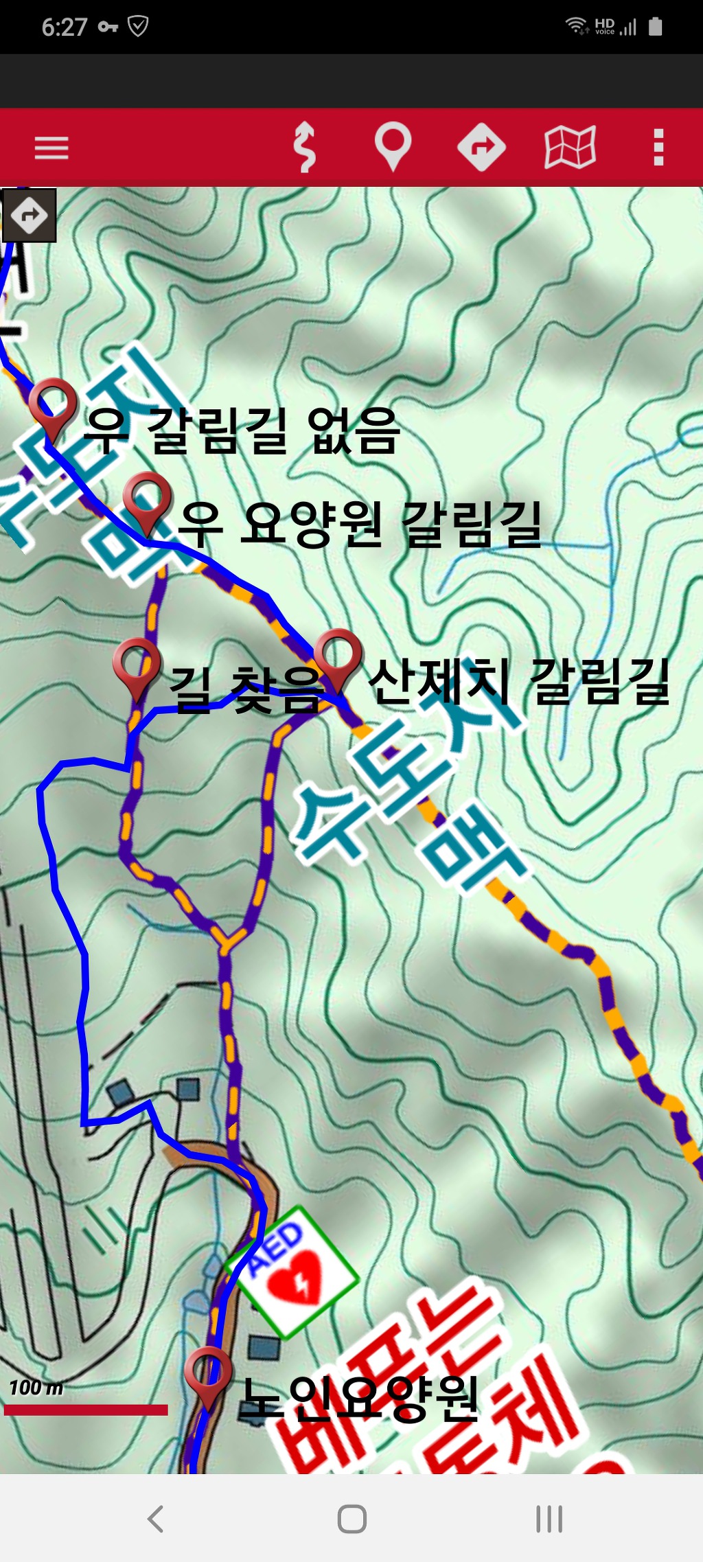 「산제치 갈림길」부터 「길 찾음」까지는 알바한 길이고, 그 전의 「우 요양원 갈림길」에서 「길 찾음」으로 하산하면 좋은 등산로 이고, 등산지도에 표시된 등산로는 희미하거나 없어진 등산로임.