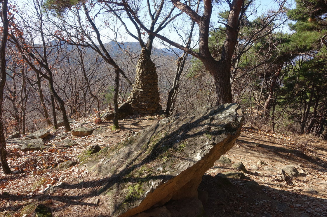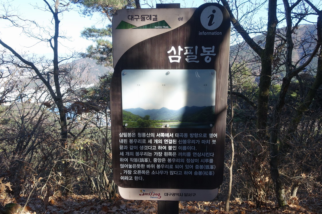 ※ 팁: ① 일필봉(273m)은 삼각점(대구 480)만 있고, 약산골산은 특이점이 없으며 이필봉(담봉 421m)은 “삼필봉 안내에 누군가 써놓은