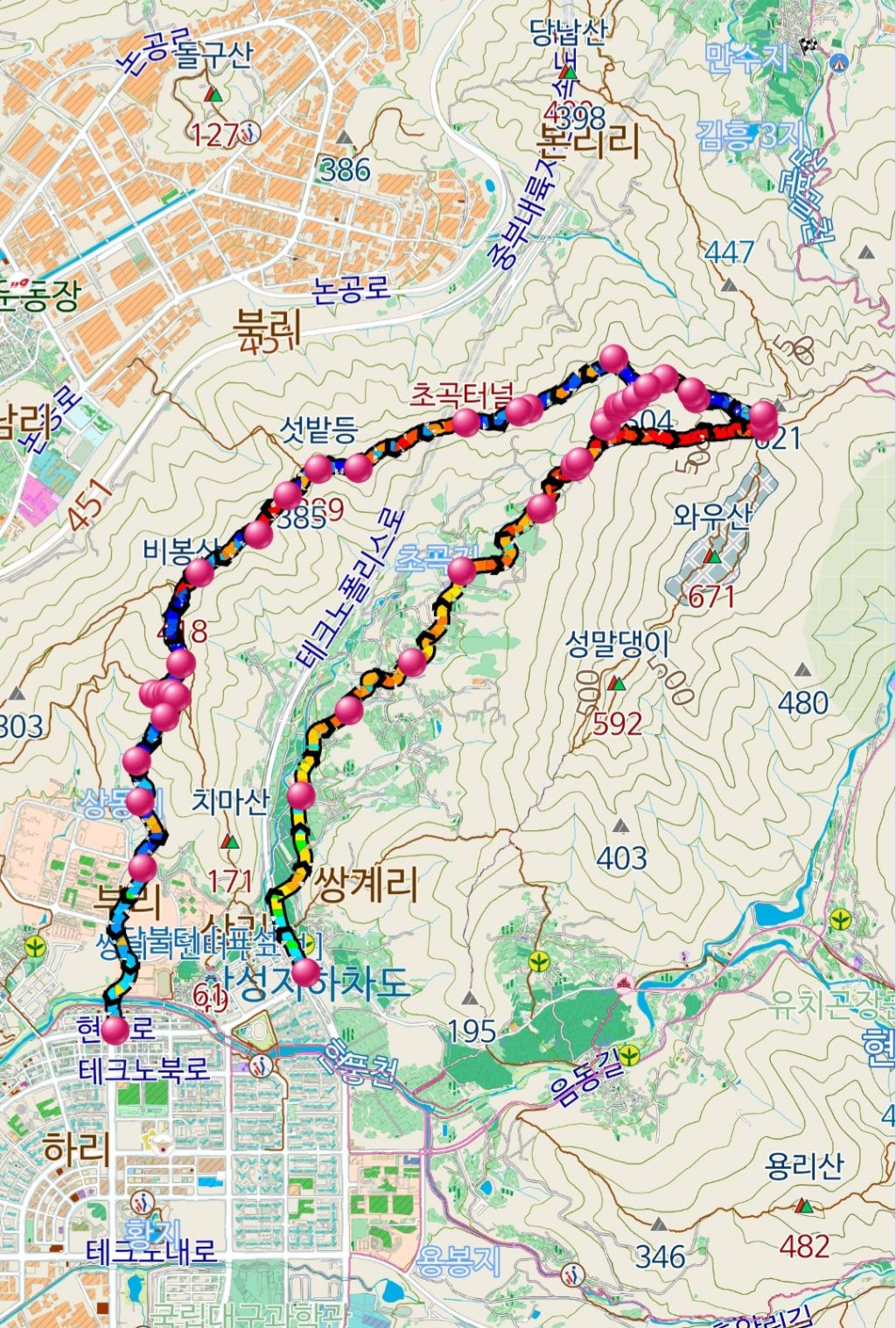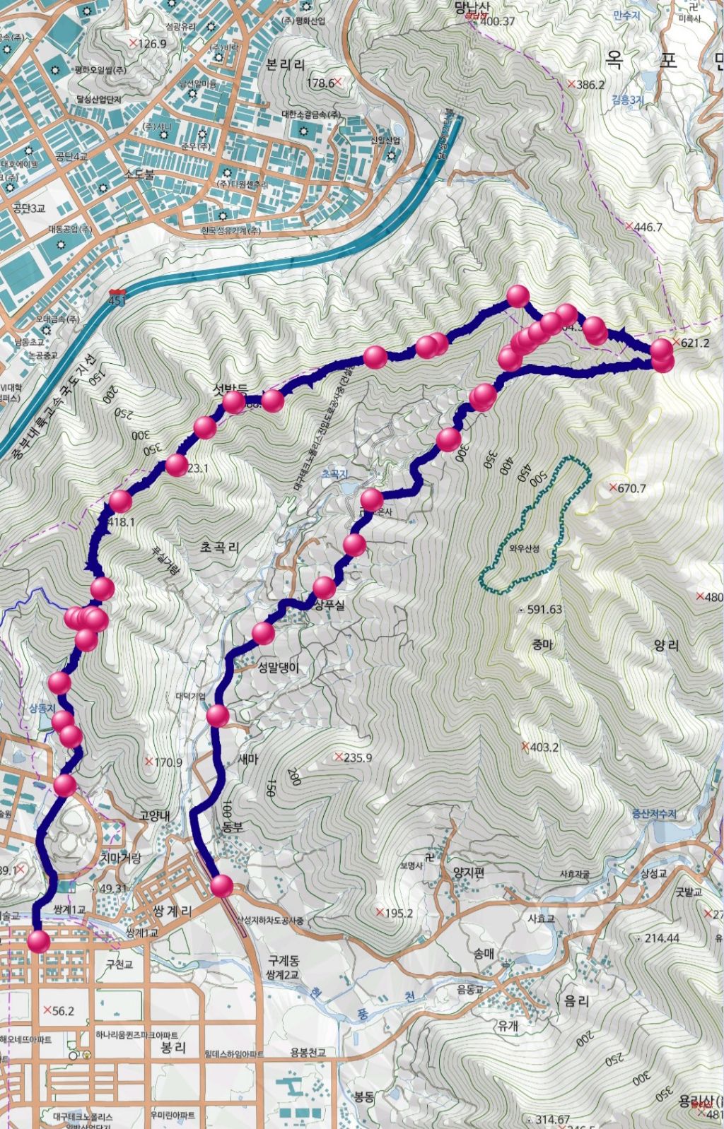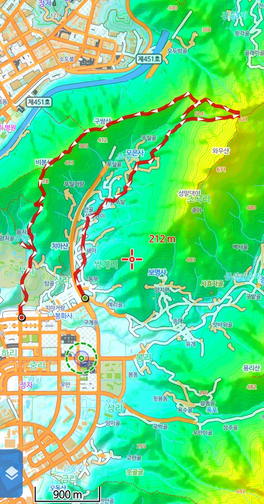 산행코스: 초곡리 입구/드라마촬영지 '우주메리미'/초곡리 마을회관/모은사/능선 삼거리/504.3봉(뚱글뱅이)/문방우(문암)/504.3봉(뚱글뱅이)/창녕428/비봉산/디지스트 대학 입구
