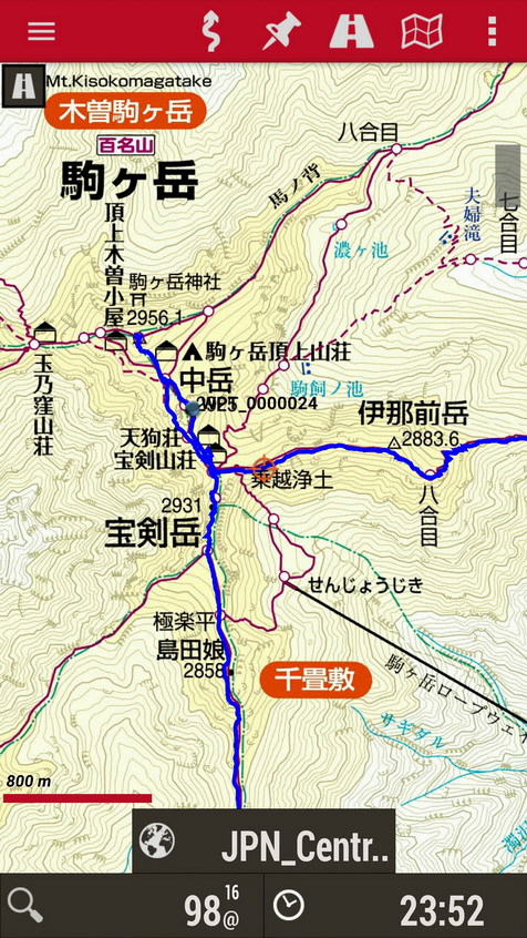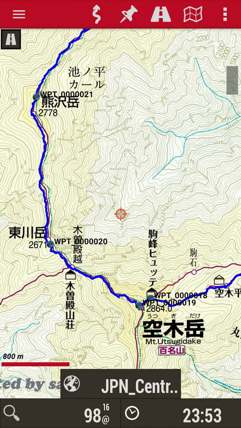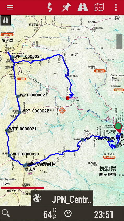 ▼ 상기 트랙을 중앙알프스 지형도상에 올려보니 아래와 같이 자동으로 올라오며, 산행중