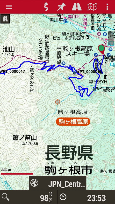 ▼ 도착 키소코마가다케 고원 부근의 등산로와 기록된 트랙의 일치성 상태