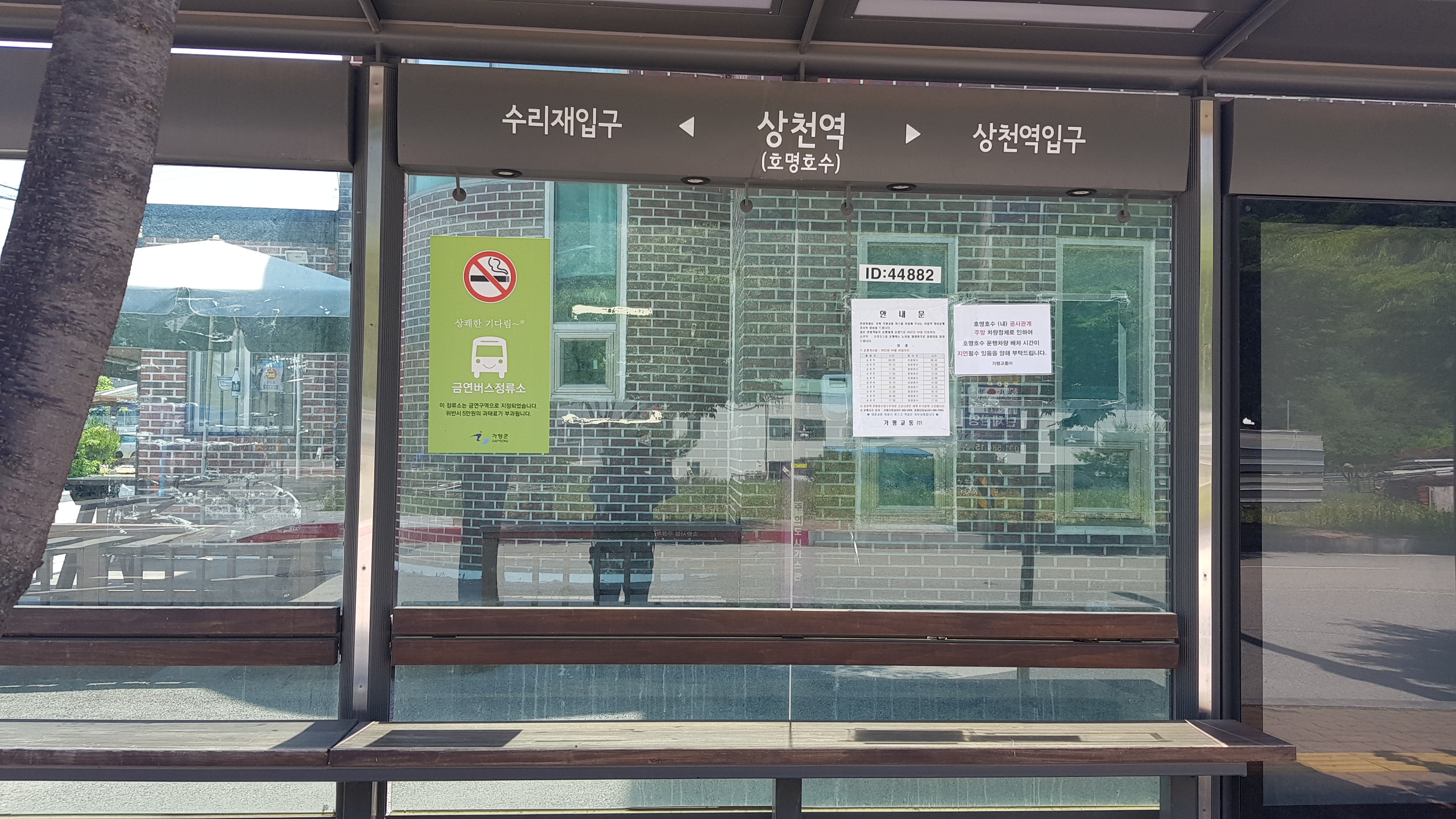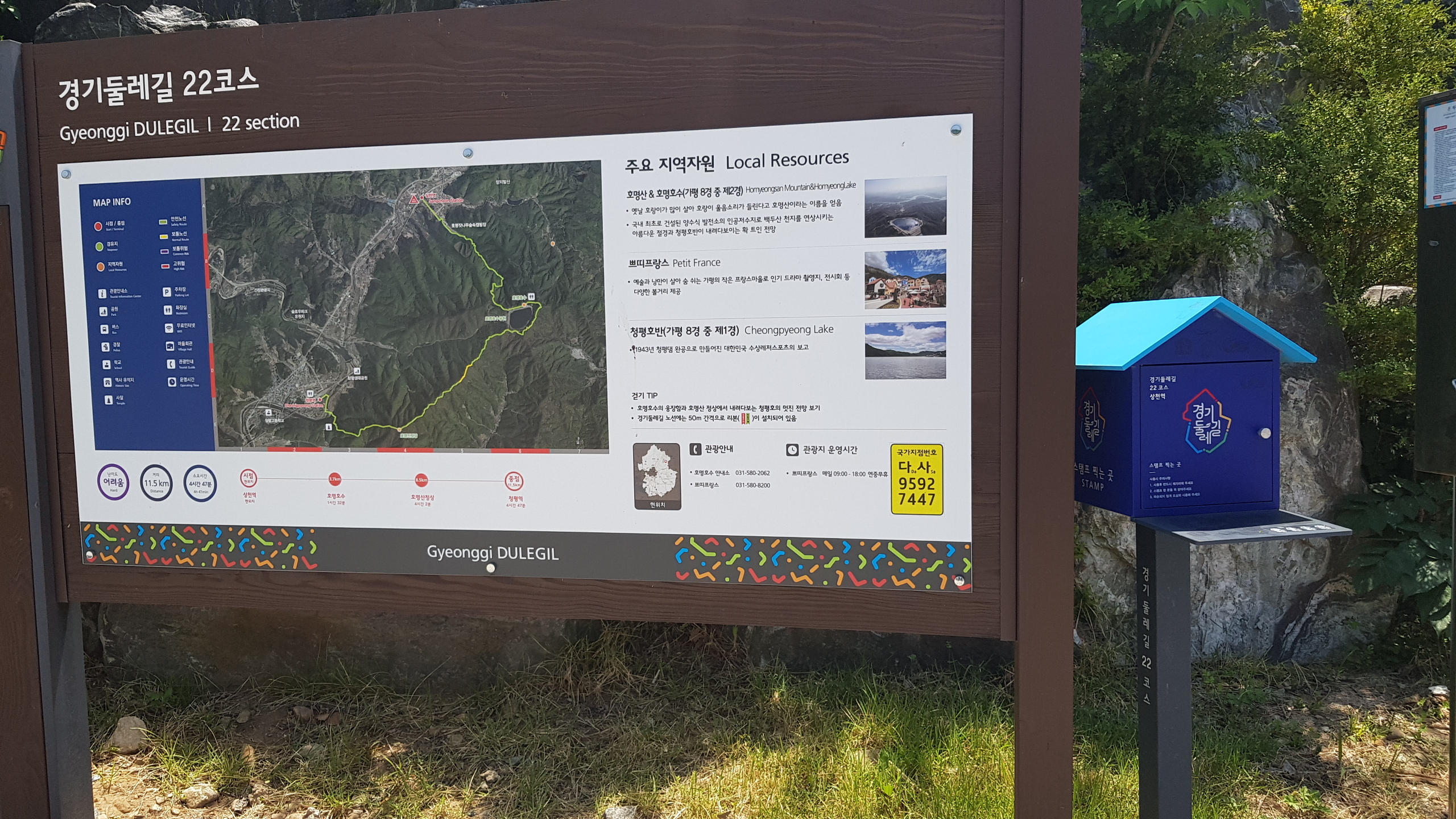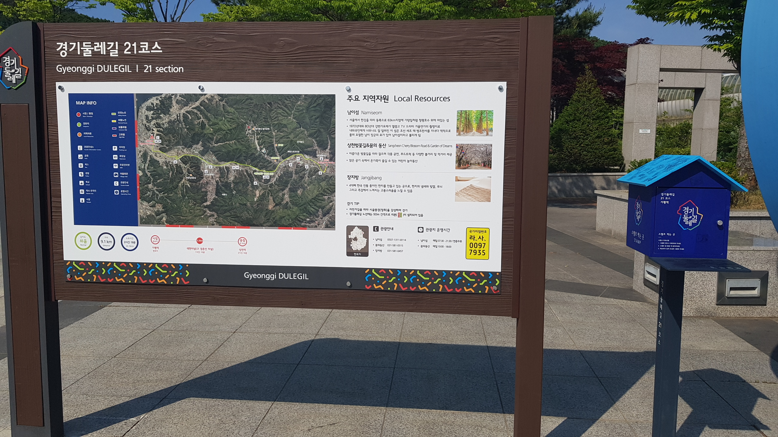 가평역 (자라섬.남이섬) 1번출구로 나오면 광장 오른편의 광광안내소 옆에 경기둘레길 21코스 스탬프 박스가 있다.