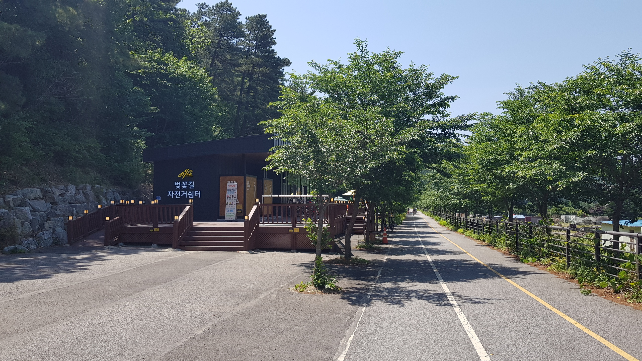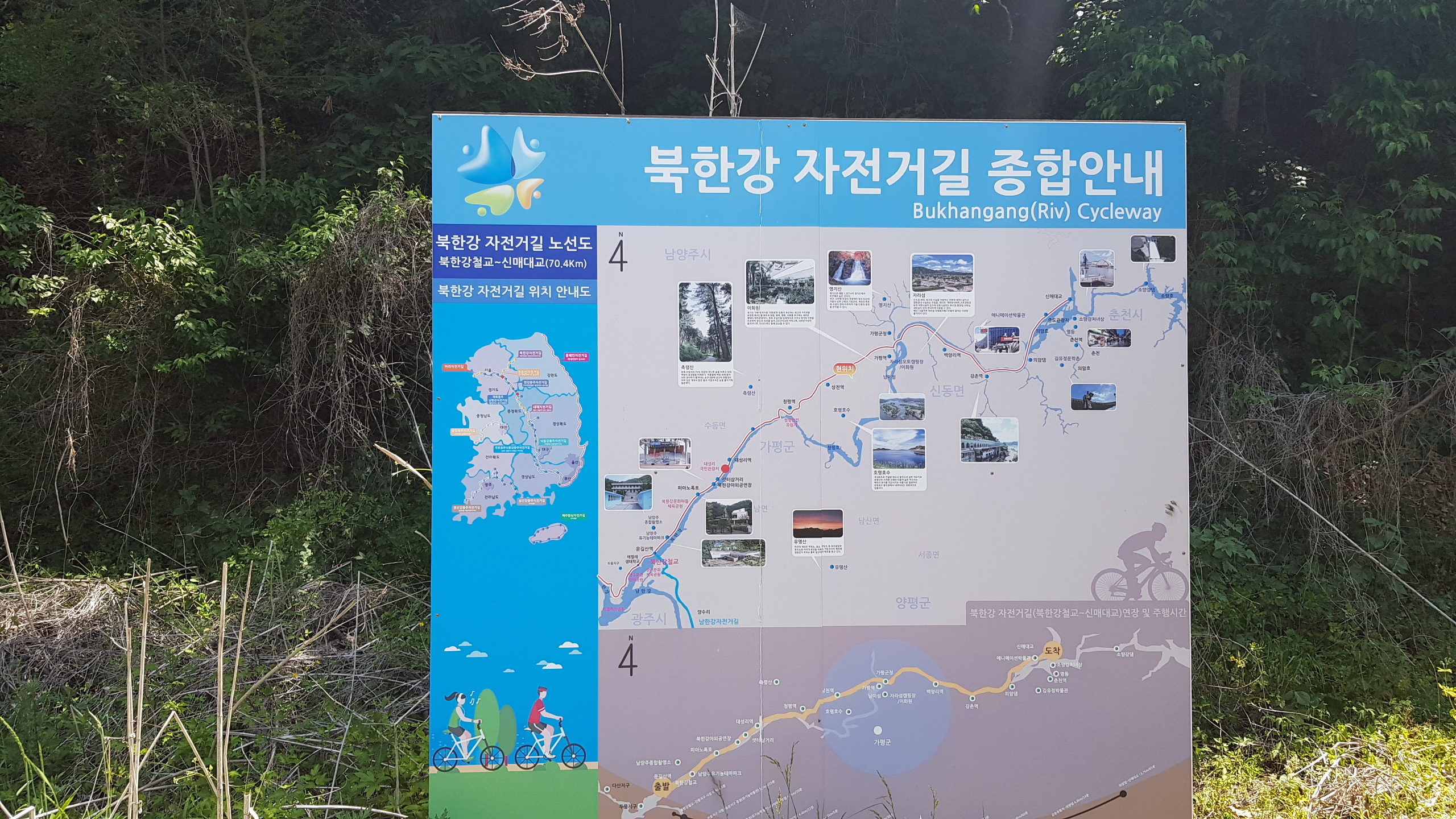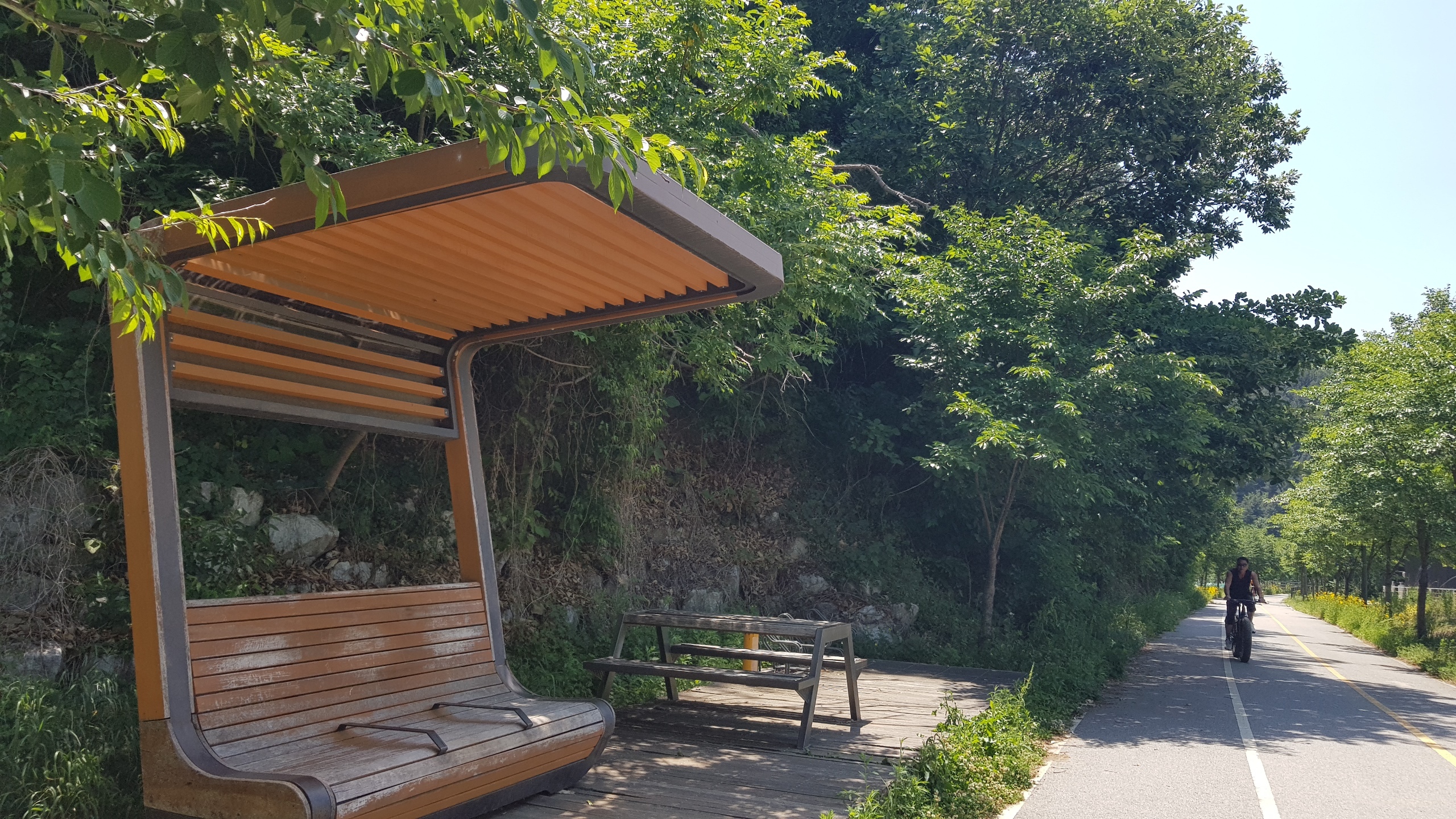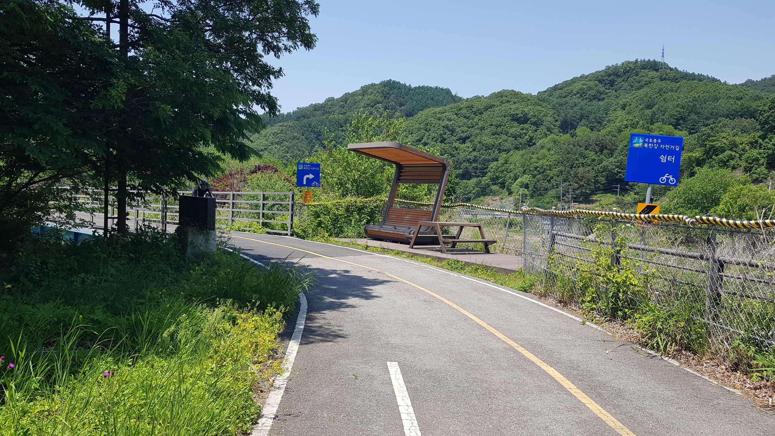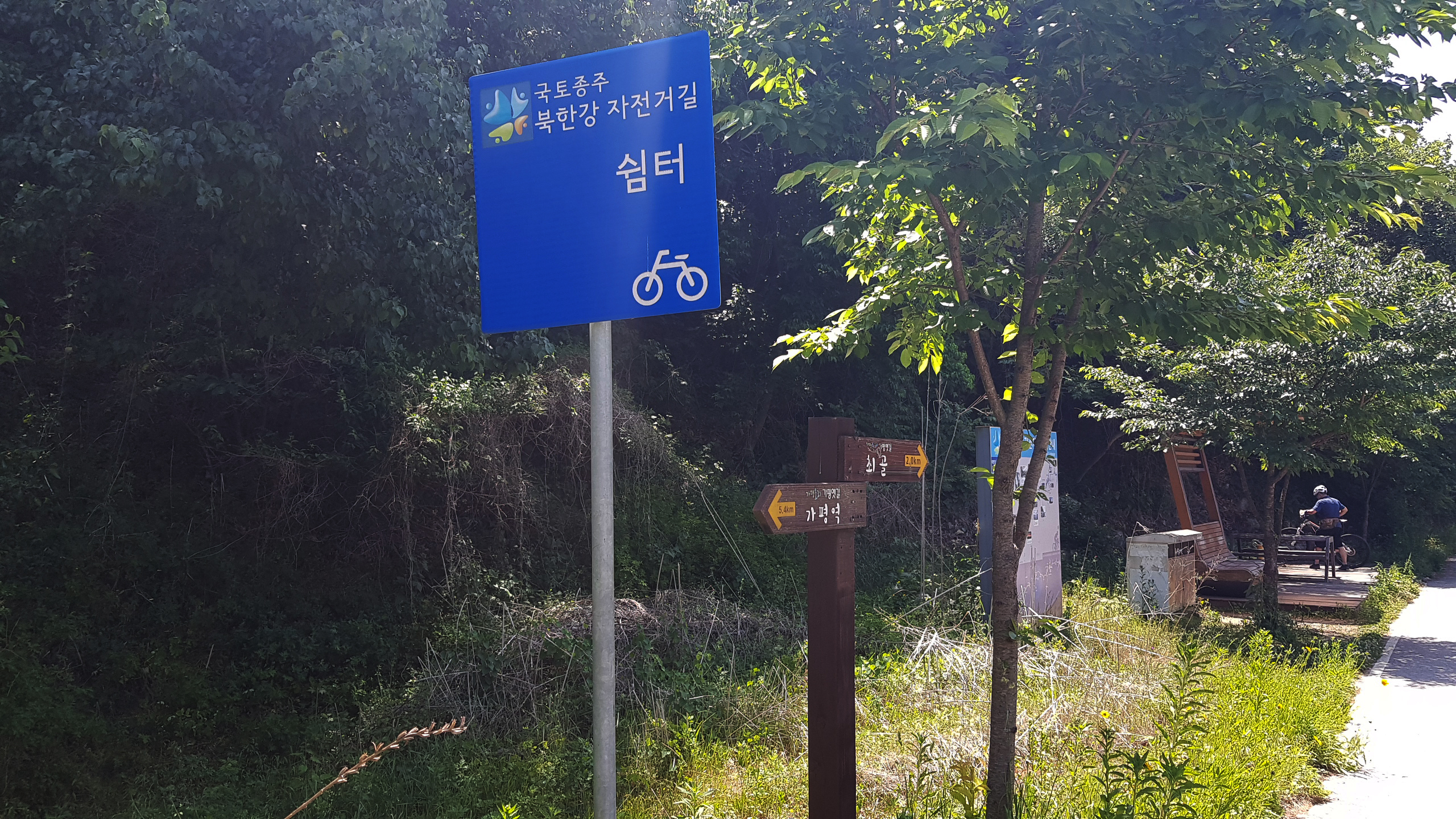 계속 북한강 자전거길을 따라 진행 하색교를 건너고 상천역 5.9km지점을 지나 세븐일레븐 편의점도 지나(가평자전거테마파크) 상천역 5.1km 지점에 도착하면 사각정자가 있는 쉼터를 만나 휴식을 취한다.