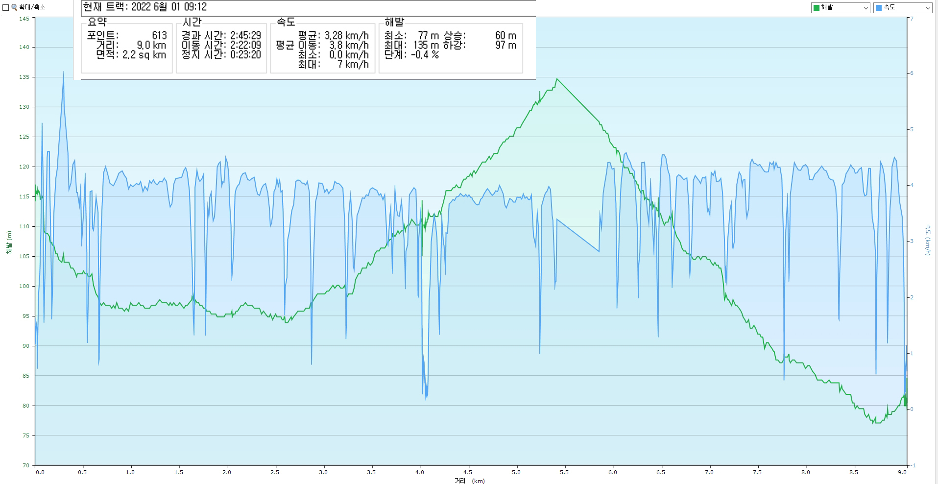 | 이동시간 | 2:22:09 | 3.8 km/h | ||