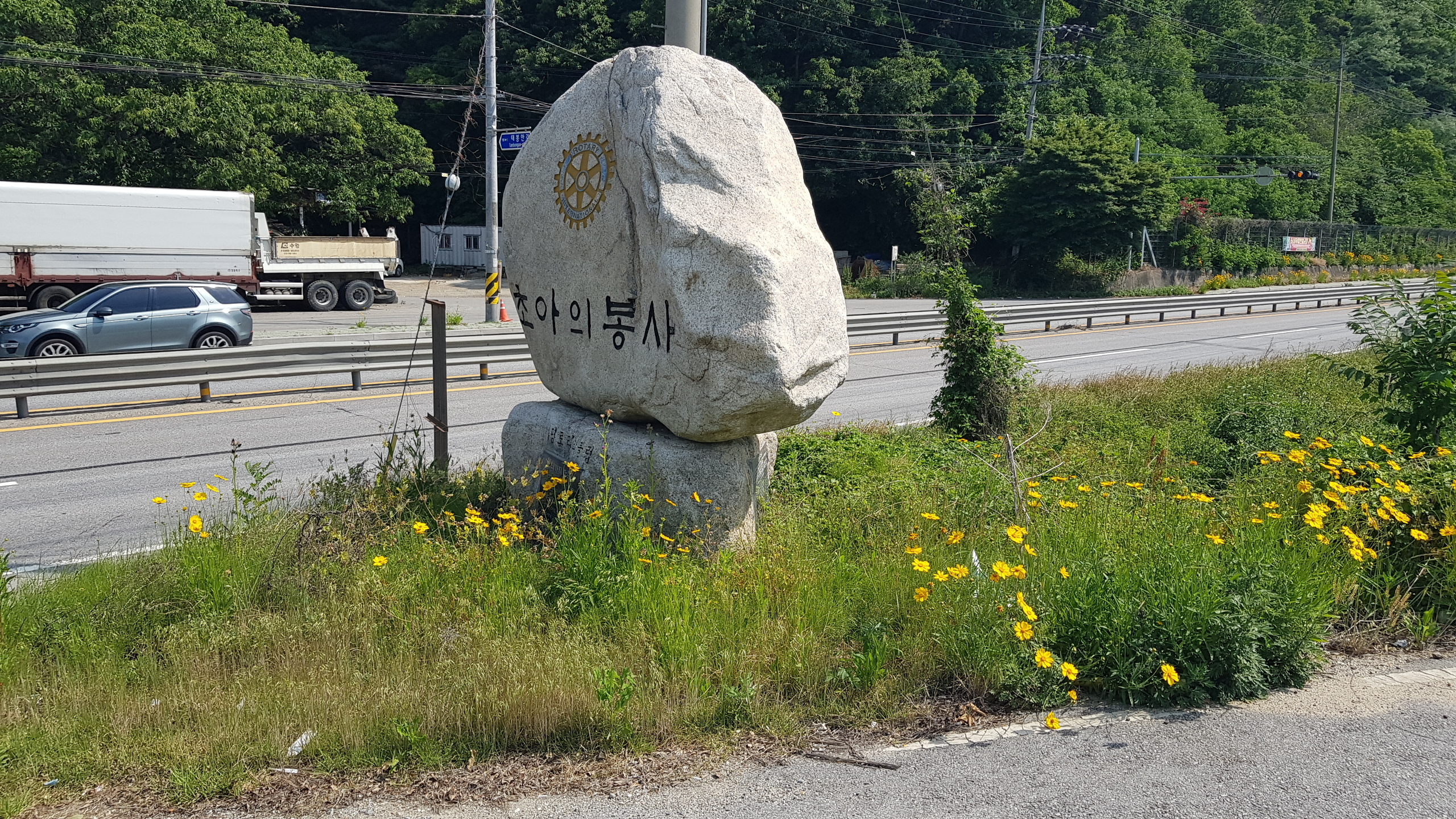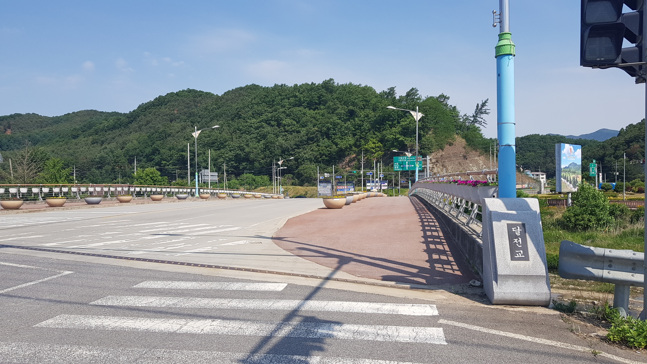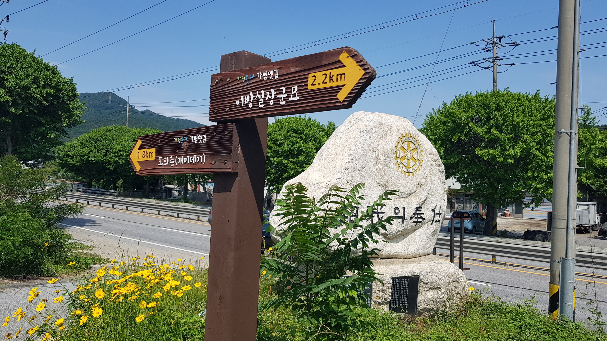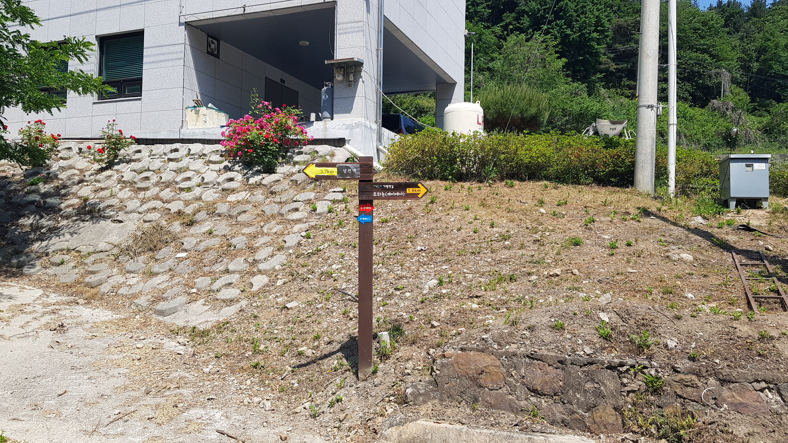 스탬프정리를 하고 길 건너 버스정류장에서 목동터미널 가는 버스시간을 검색하고 우회전하여 현대건설(힐스테이트) 쪽으로 이동하여 터널을 지나서 달전천의 달전교에 까지 이동하고 좌회전하면 상천역 8.5km 가평역 0.5km 이정목을 만나고 달정천 벛꽃길 따라 진행하여 하색1교에 도착하고 하색1교를 건너면 상천역 7.5km 이정목이 있는 북한강자전거길 삼거리에 도착하여 좌회전하여 자전거길 옆의 산책로로 이어가다 이방실장군묘 2.0km 알곡종합운동장 20.km 갈림길(이정목)을 지나고 포회촌(개미데미) 1.8km 이정목에 도착하면 초아의봉사라 새겨진 입석이 있다.