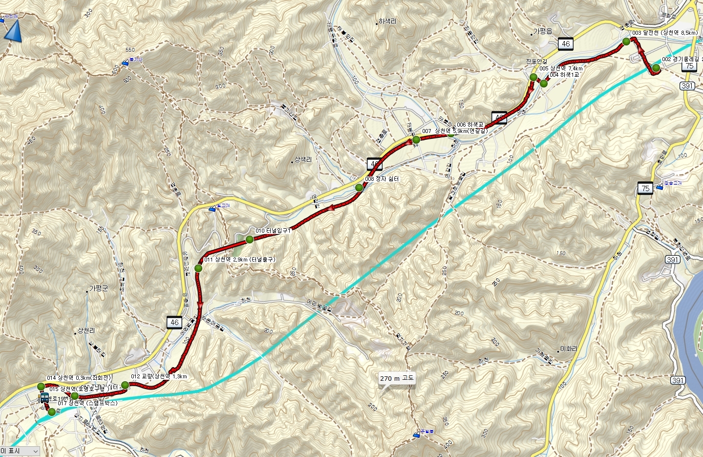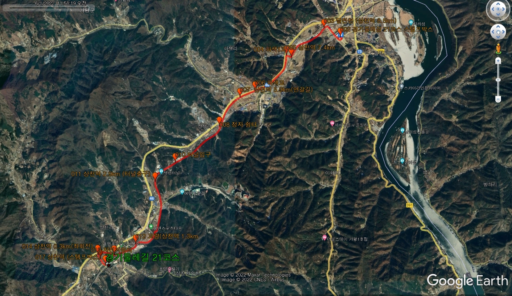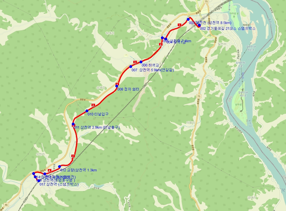 가평역(스탬프박스)-하색1교-하색교=-정자쉼터-터널-자전거길쉼터-상천역(스탬프박스)
