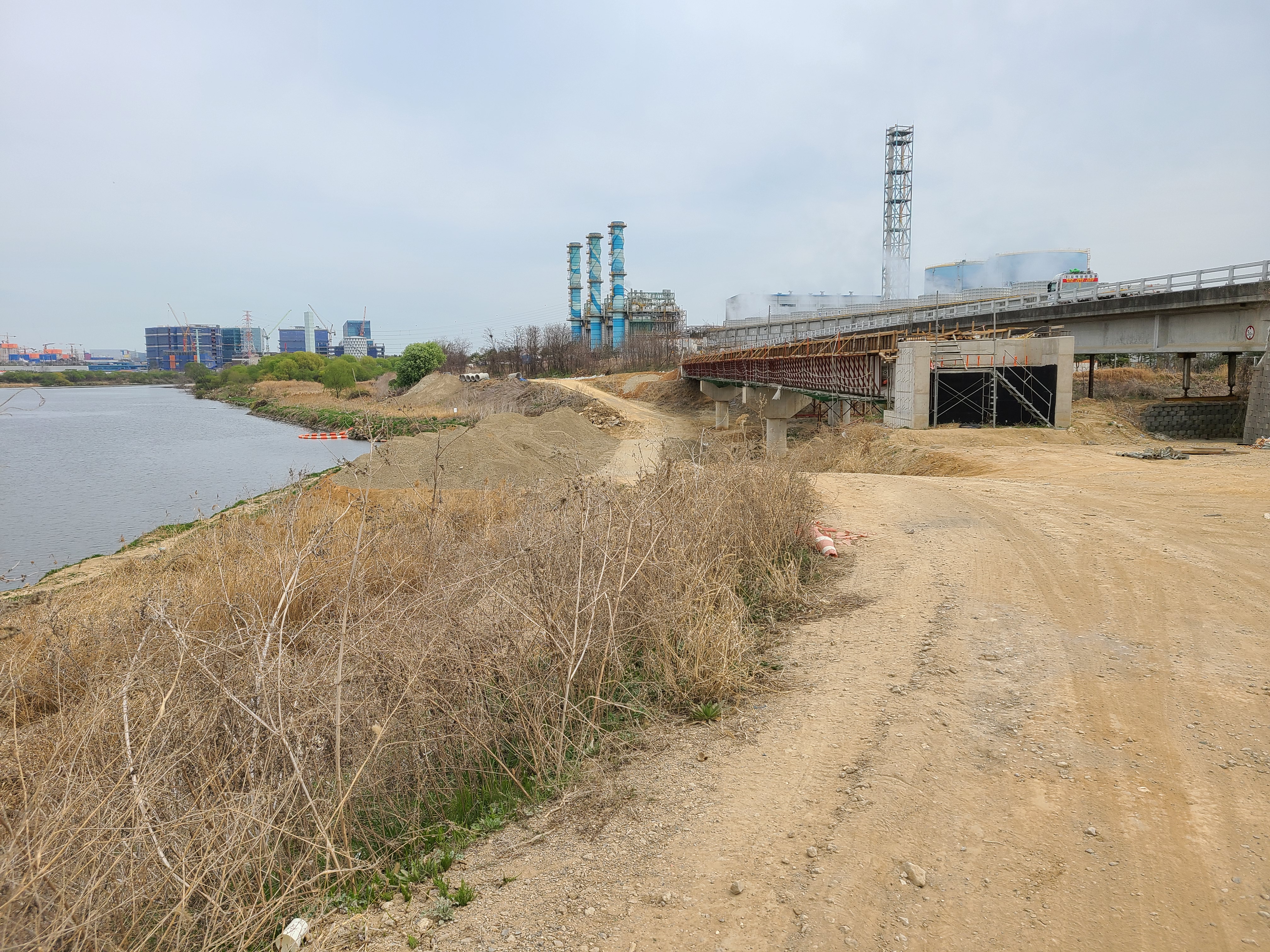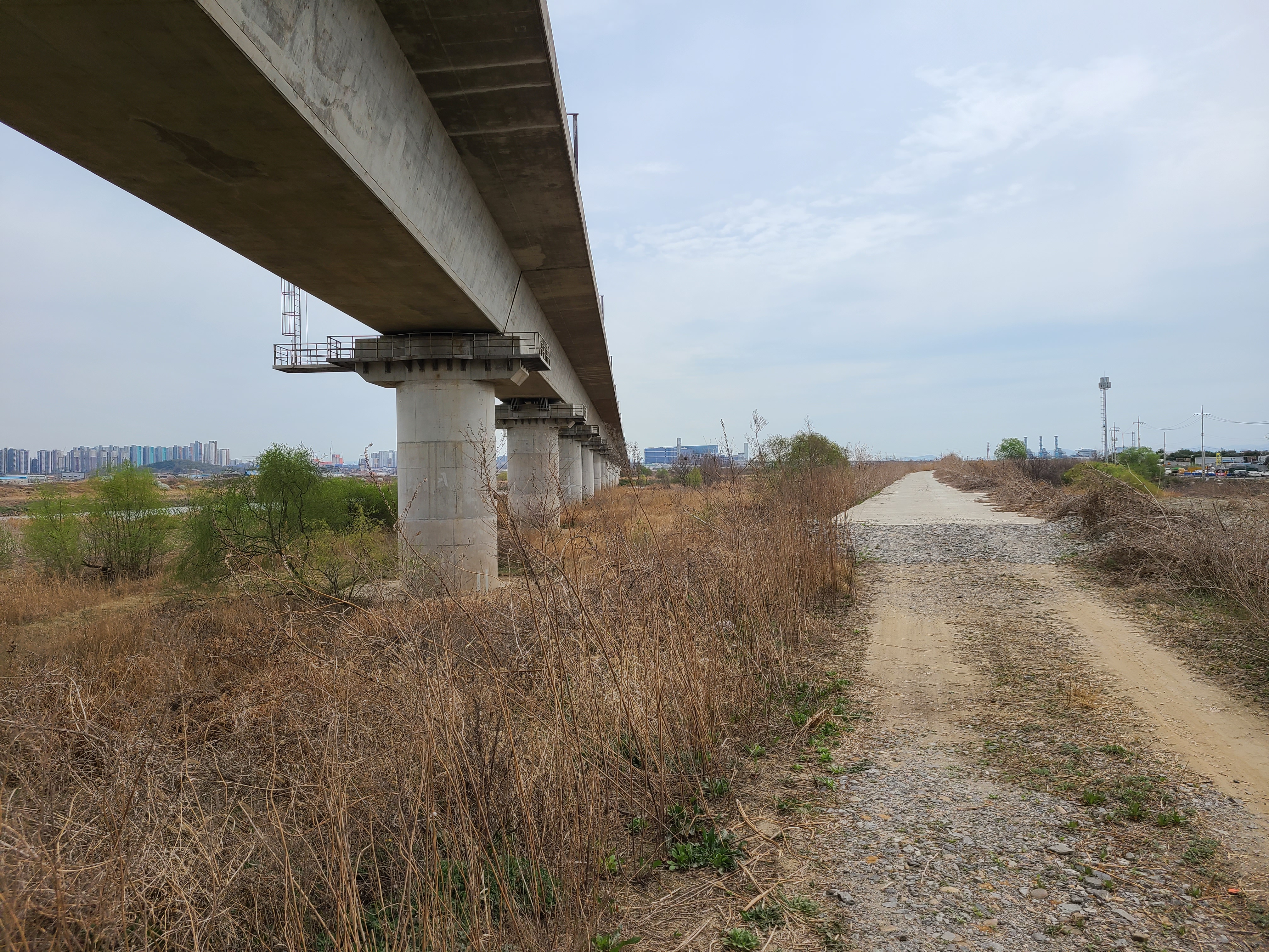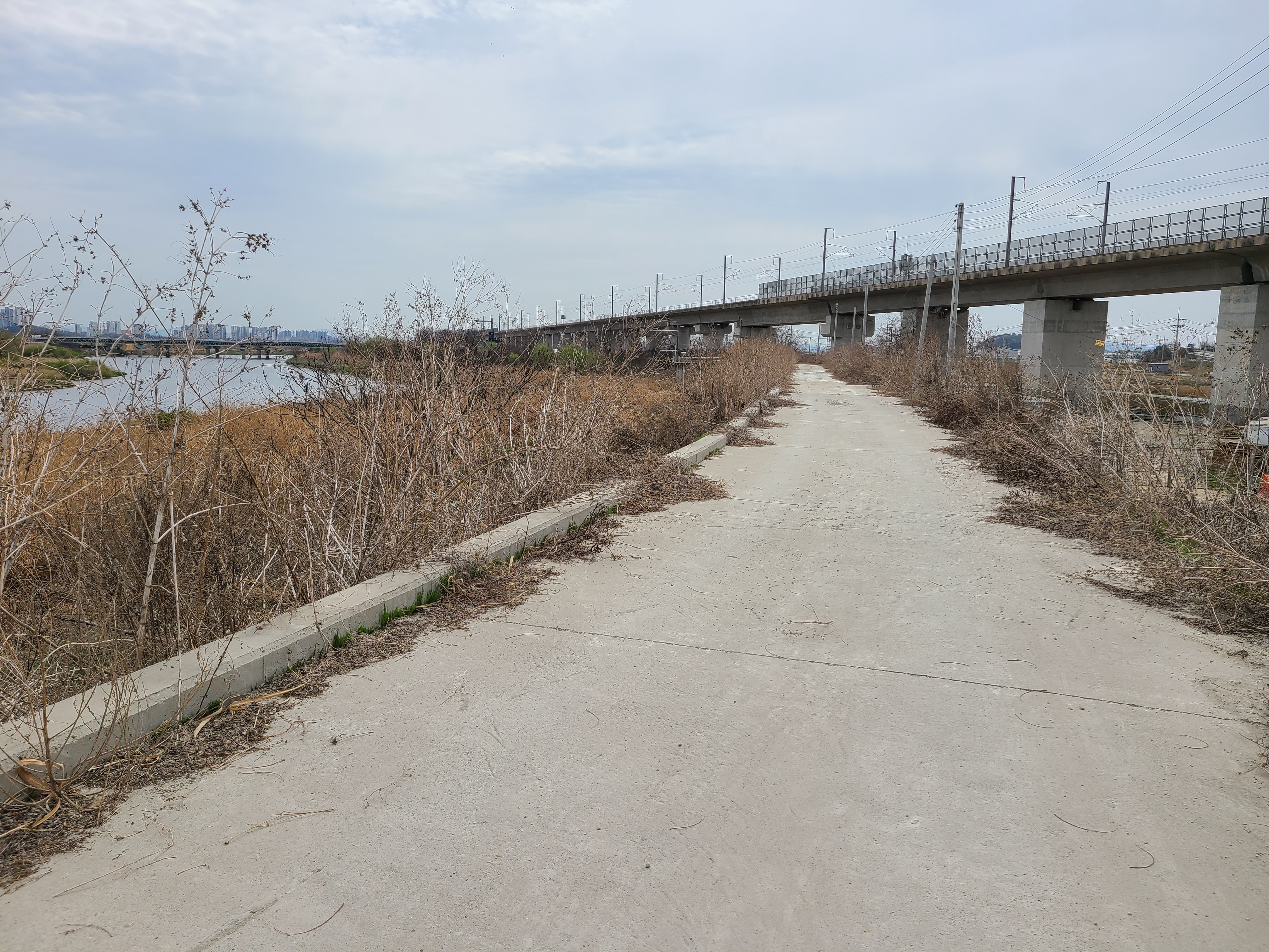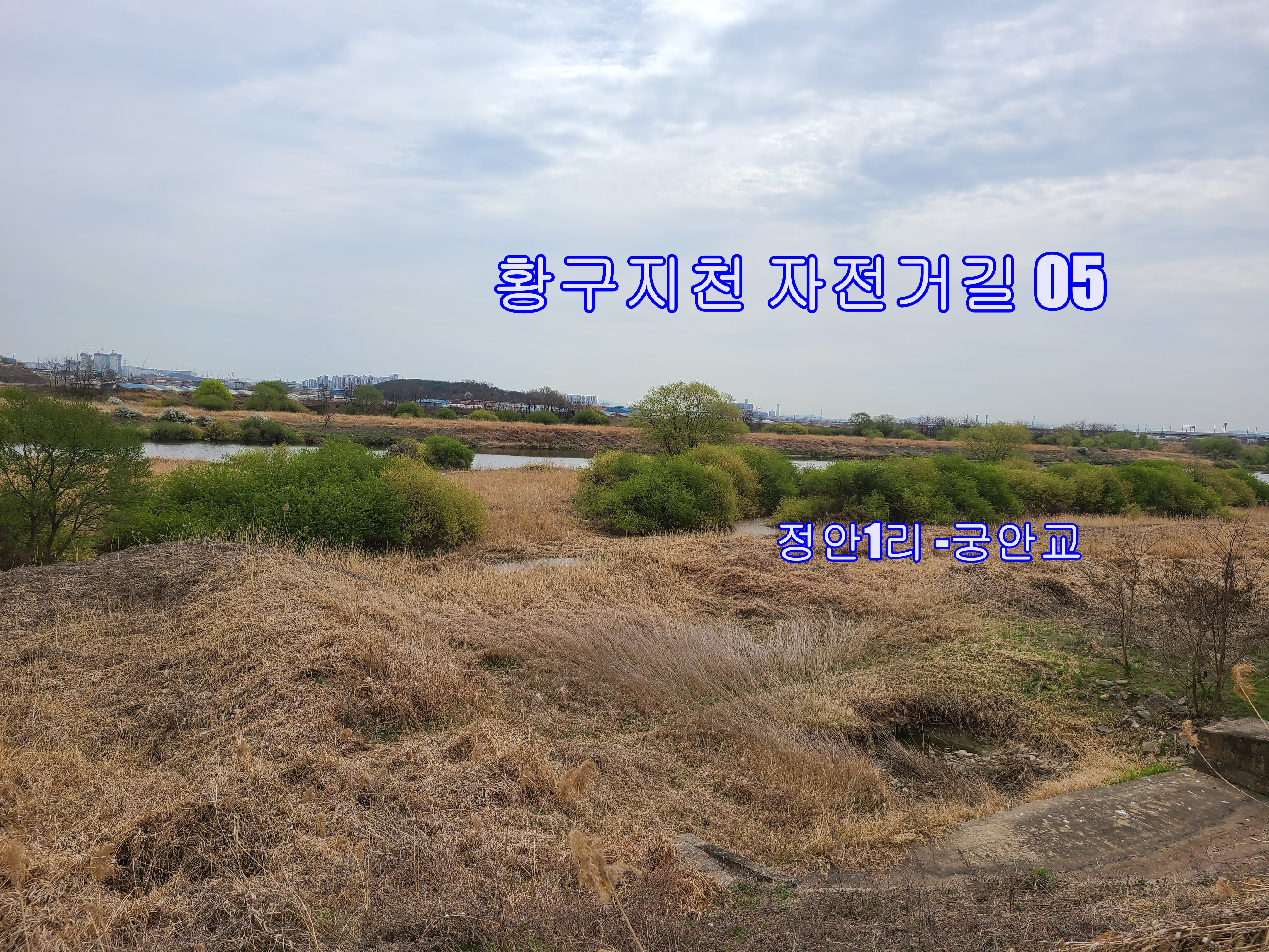 둑길로 이동하다 황구지교를 만나 다리아래로 이동하고 계속 둑길로 이동하면 우측의 315번도로로 진입하는 갈림목을 지나고 우측 길 건너에 보이는 한일이동타워도 지나고 율북1배수문 율북2배수문 율북3배수문도지나 동연교에 도착하여 동연교차로를 지나 철로 아래에서 휴식을 취한다.