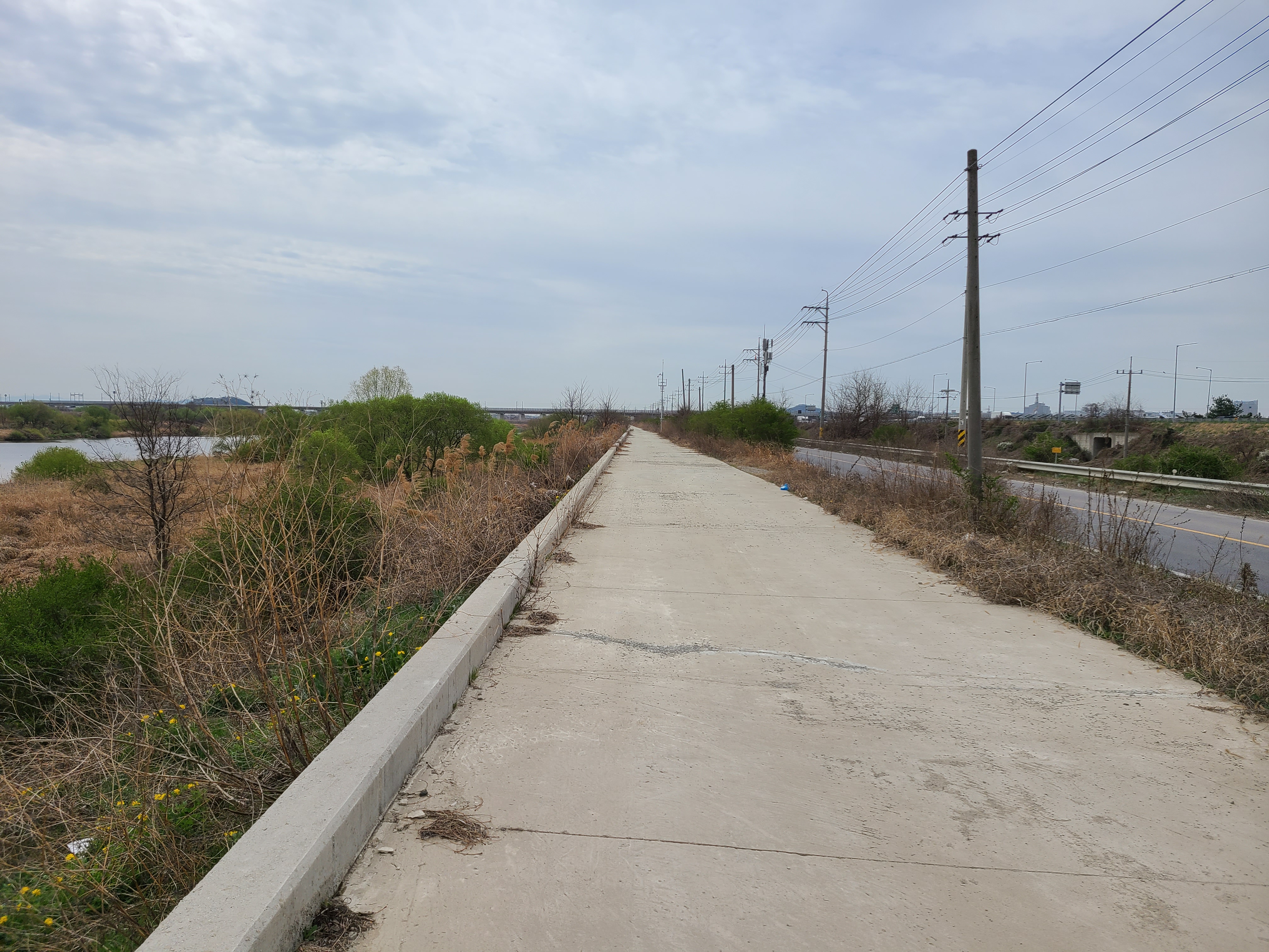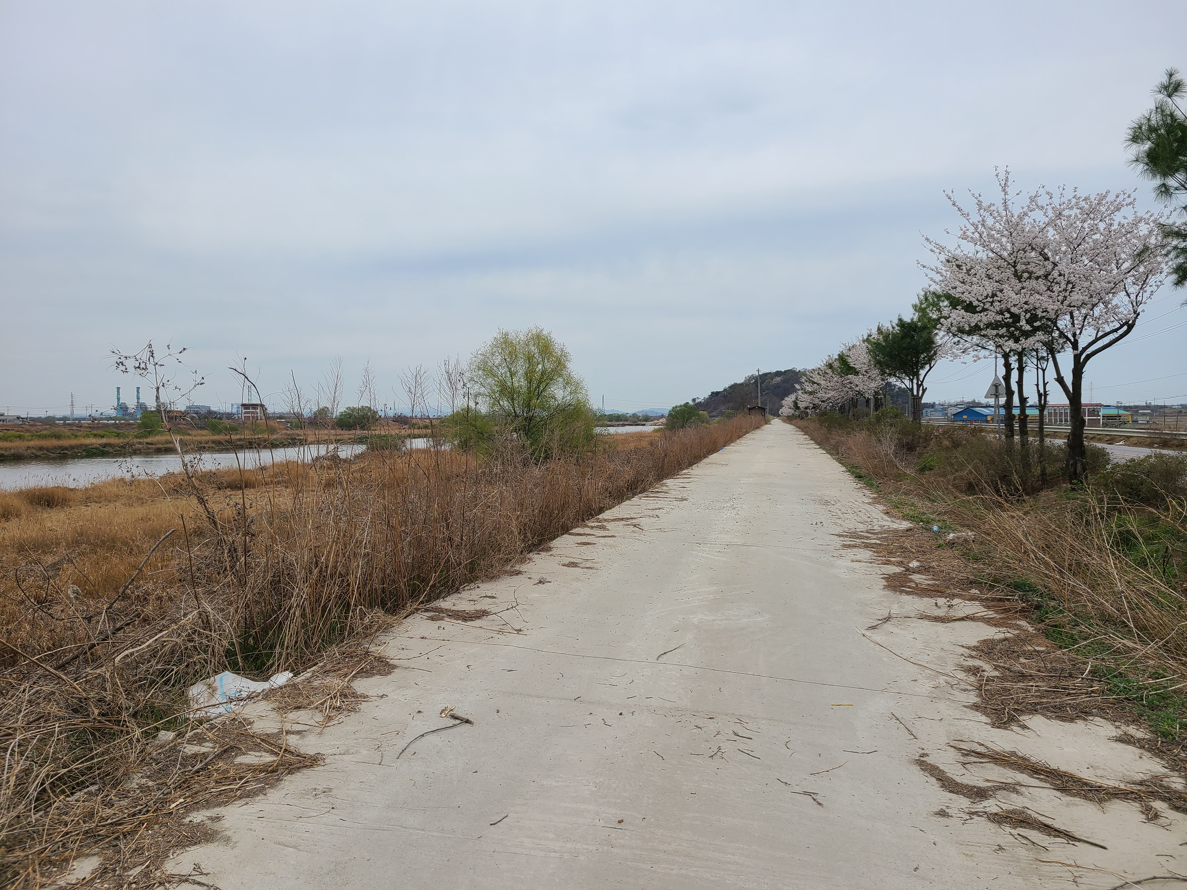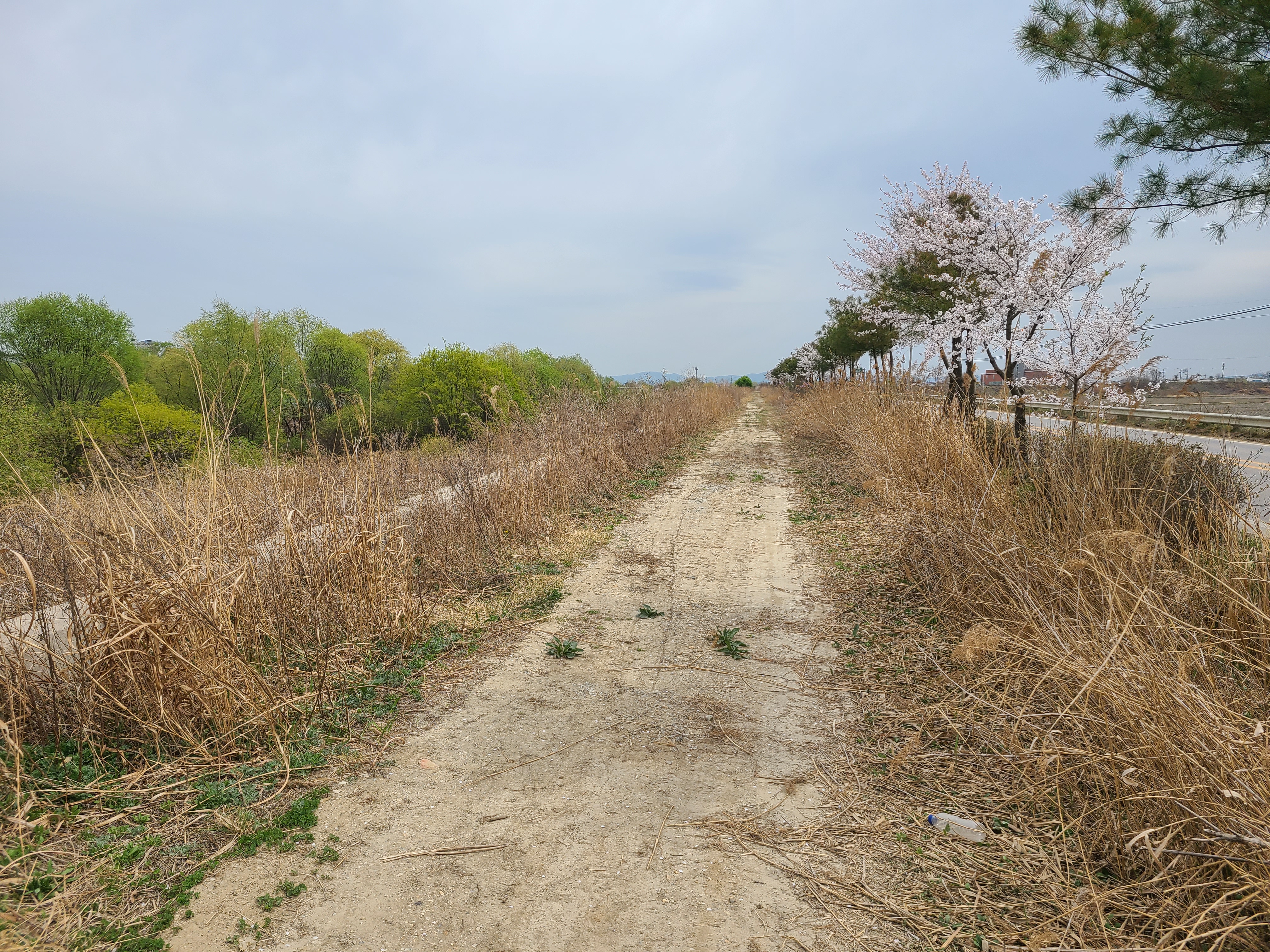 벗나무와 소나무가 섞여 있는 가로수길을 걸어 낚시허용구역의 삼거리에서 자동차길의 우측길로 길을 잡고 가다 건널목이 있는 지점에서 자동차길을 건너 다시 강변길로 접어들고 안화교에 도착하여 공사구역을 어렵게 통과하면 낚시허용구역이 끝 나는 지점에 도착하면 우측 멀리에 농협연합장례식장이 보이고 둑길은 잡풀로 얽혀 진행을 방해하고 잡풀을 헤치며 진행하여 장레식장의 뒤쪽에 도착하면 장례식장의 초록 담장에 쪽문이 있어 쪽문으로 들어가 경내로 진입하여 장례식장을 빠져나오면 버스정거장에 도착하는데 창네리 방향 정류장이라 길 건너 버스정류장으로 이동 98번버스를 타고 평택역까지 이동 하여 오늘의 일정을 마무리한다.