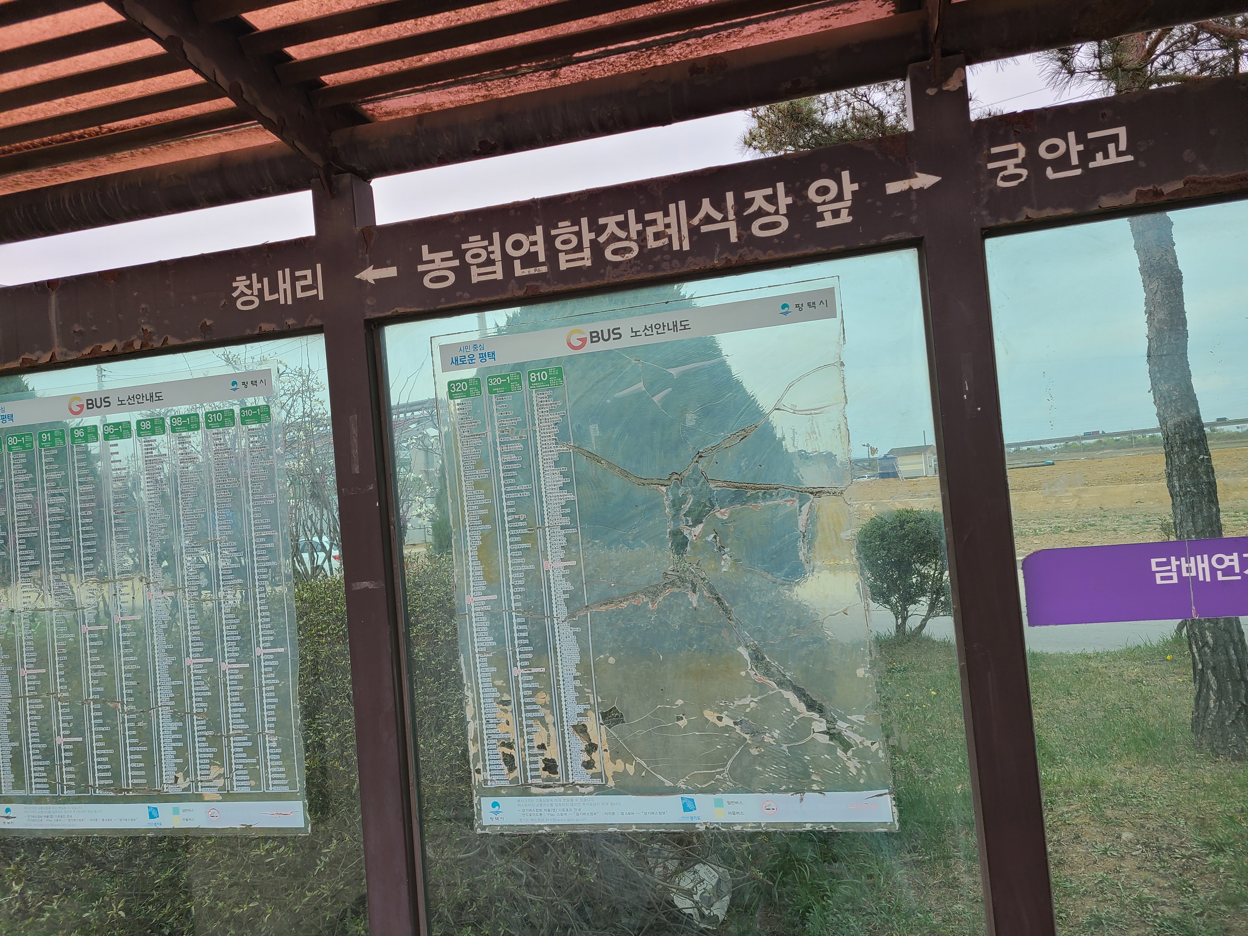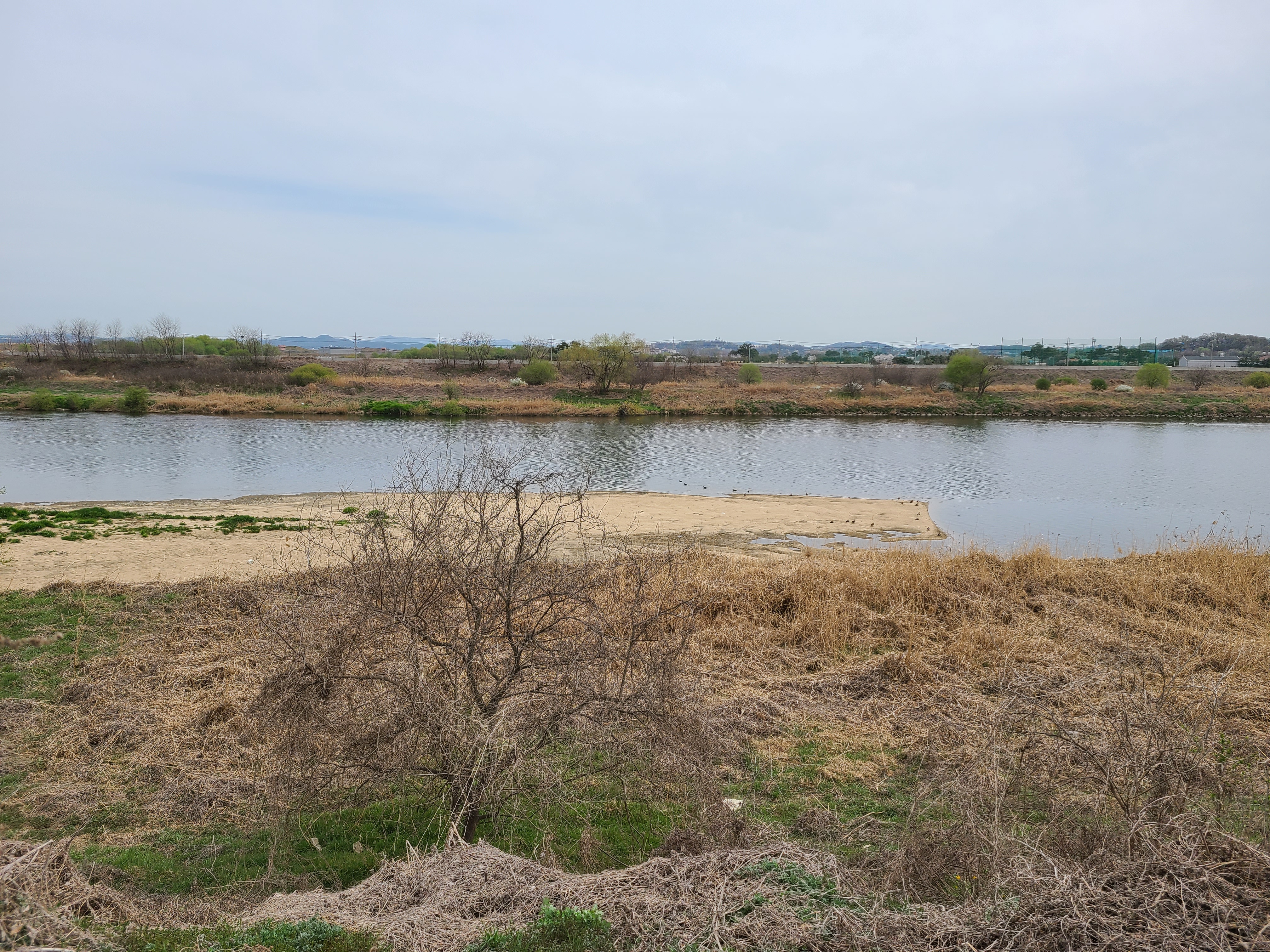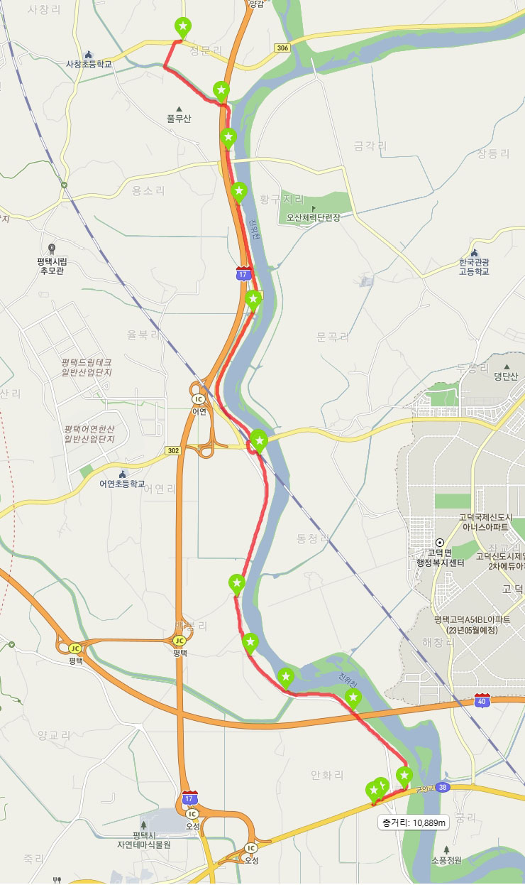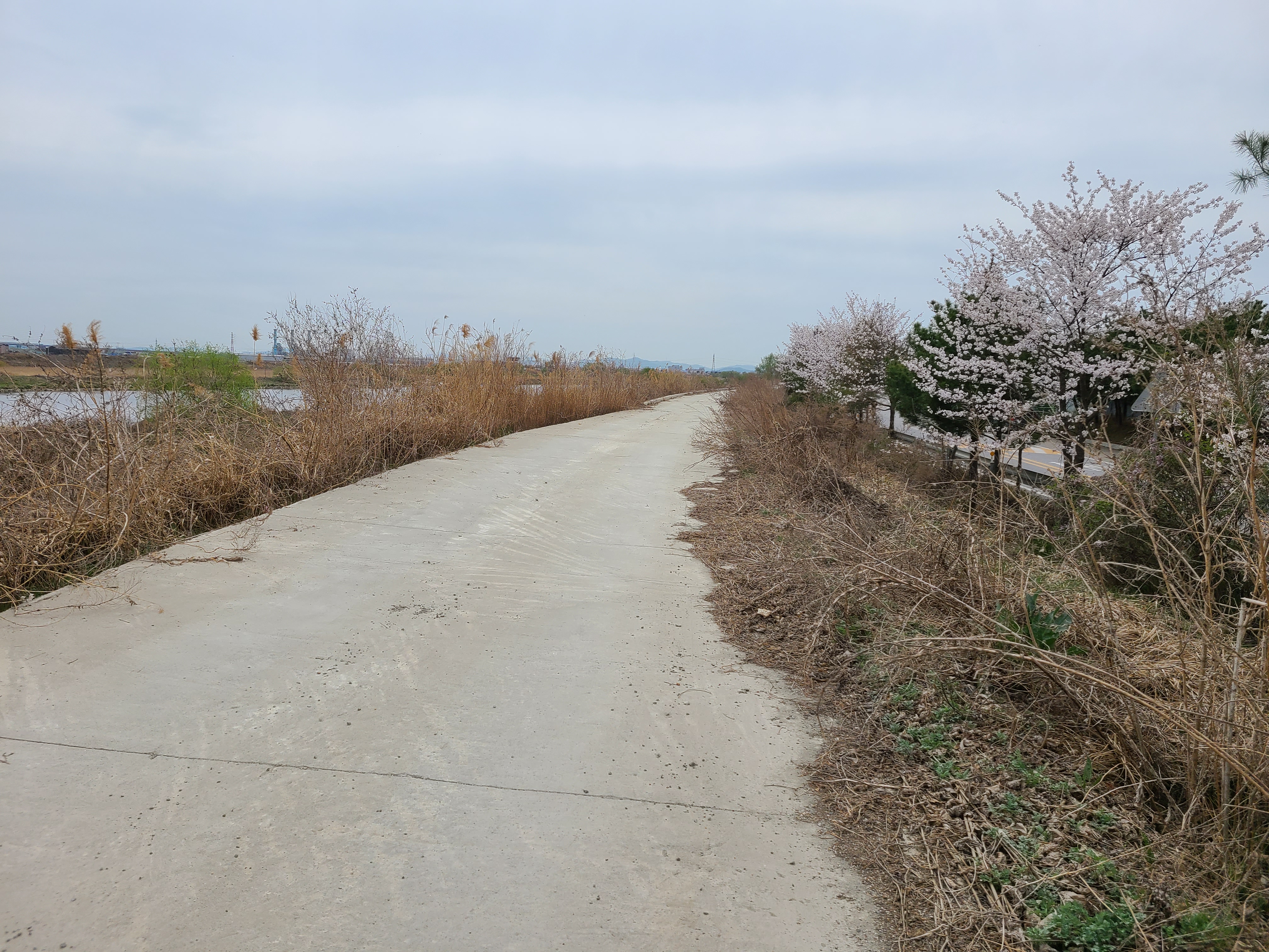 벗나무와 소나무가 섞여 있는 가로수길을 걸어 낚시허용구역의 삼거리에서 자동차길의 우측길로 길을 잡고 가다 건널목이 있는 지점에서 자동차길을 건너 다시 강변길로 접어들고 안화교에 도착하여 공사구역을 어렵게 통과하면 낚시허용구역이 끝 나는 지점에 도착하면 우측 멀리에 농협연합장례식장이 보이고 둑길은 잡풀로 얽혀 진행을 방해하고 잡풀을 헤치며 진행하여 장레식장의 뒤쪽에 도착하면 장례식장의 초록 담장에 쪽문이 있어 쪽문으로 들어가 경내로 진입하여 장례식장을 빠져나오면 버스정거장에 도착하는데 창네리 방향 정류장이라 길 건너 버스정류장으로 이동 98번버스를 타고 평택역까지 이동 하여 오늘의 일정을 마무리한다.