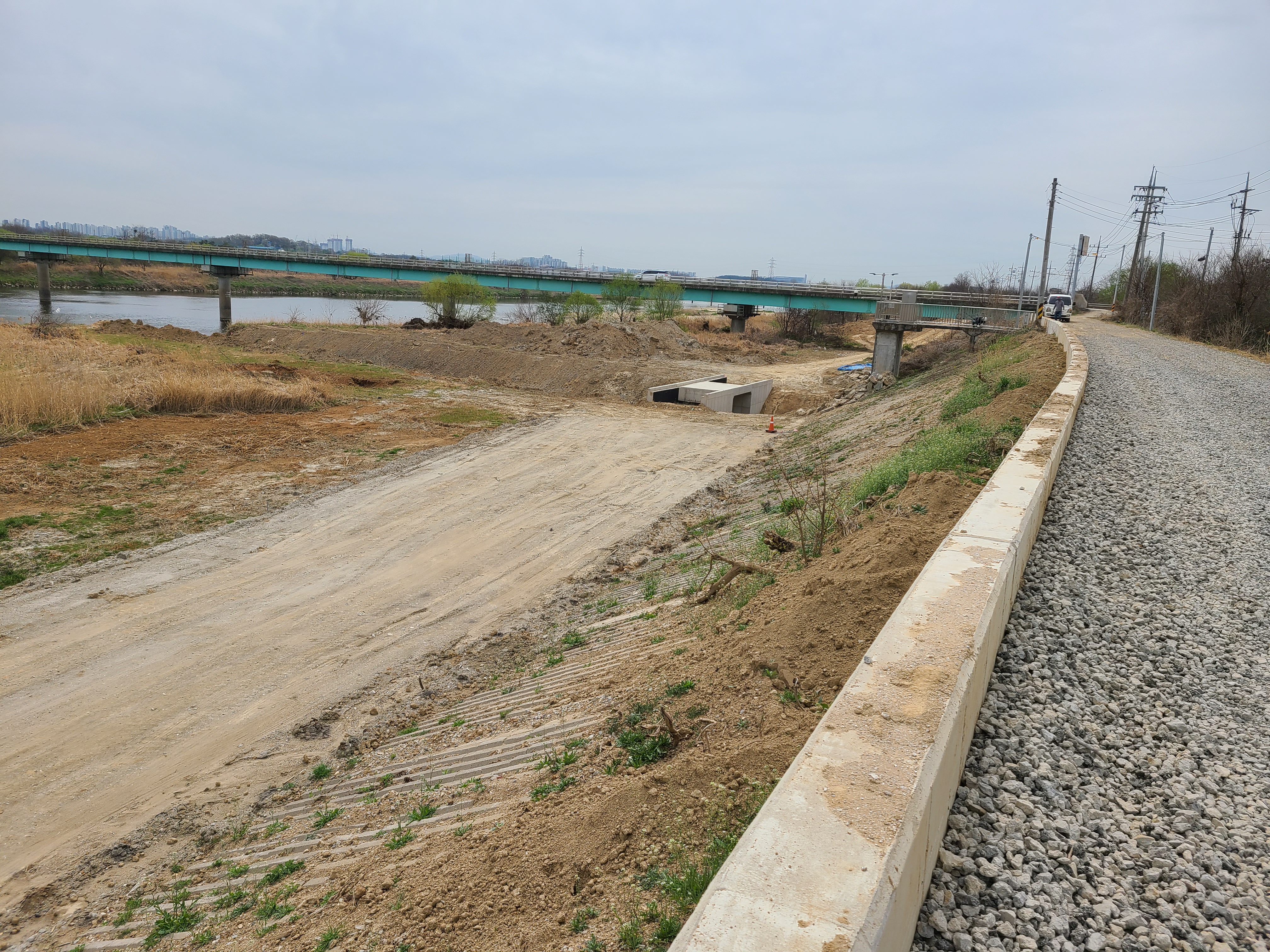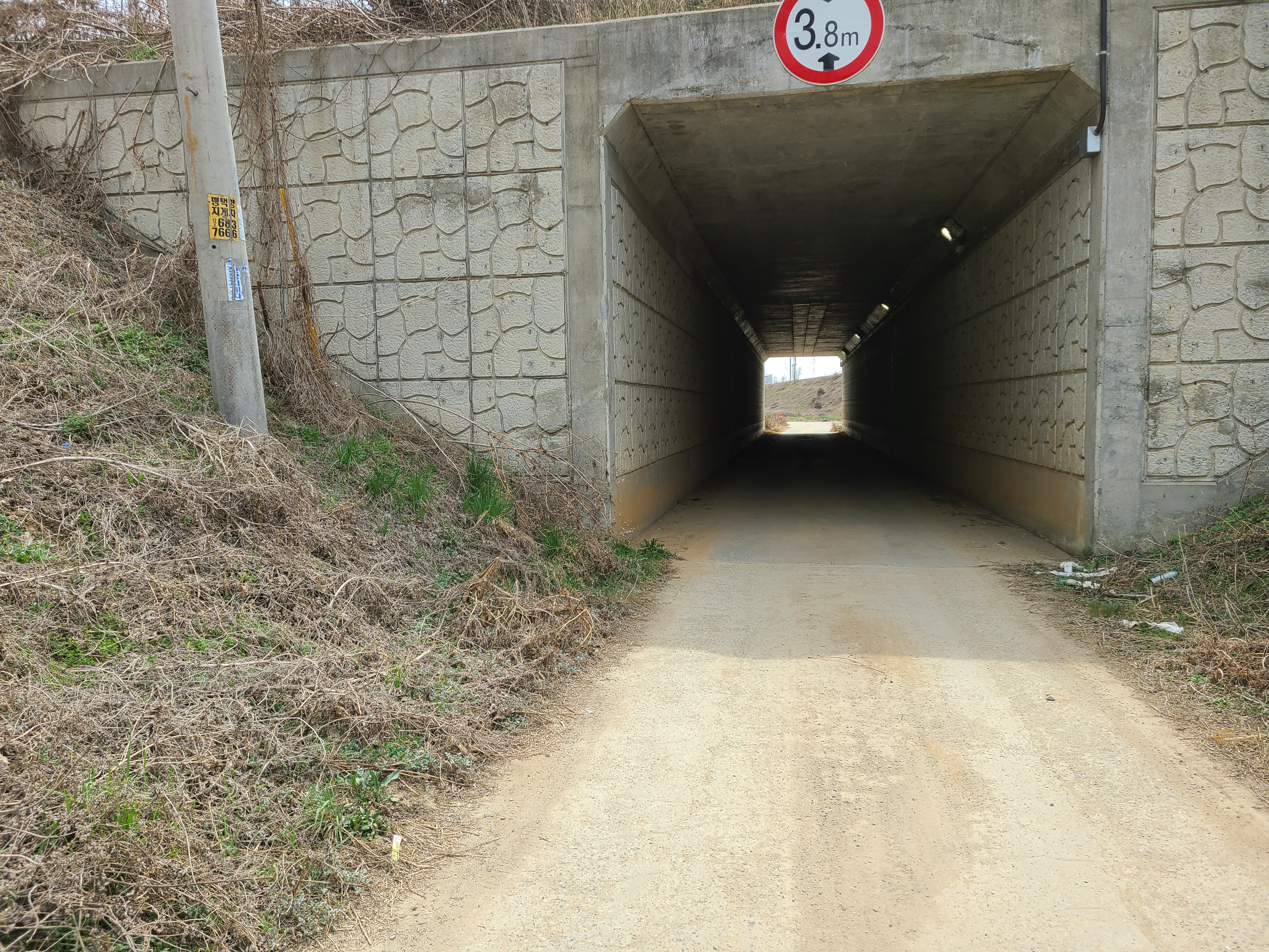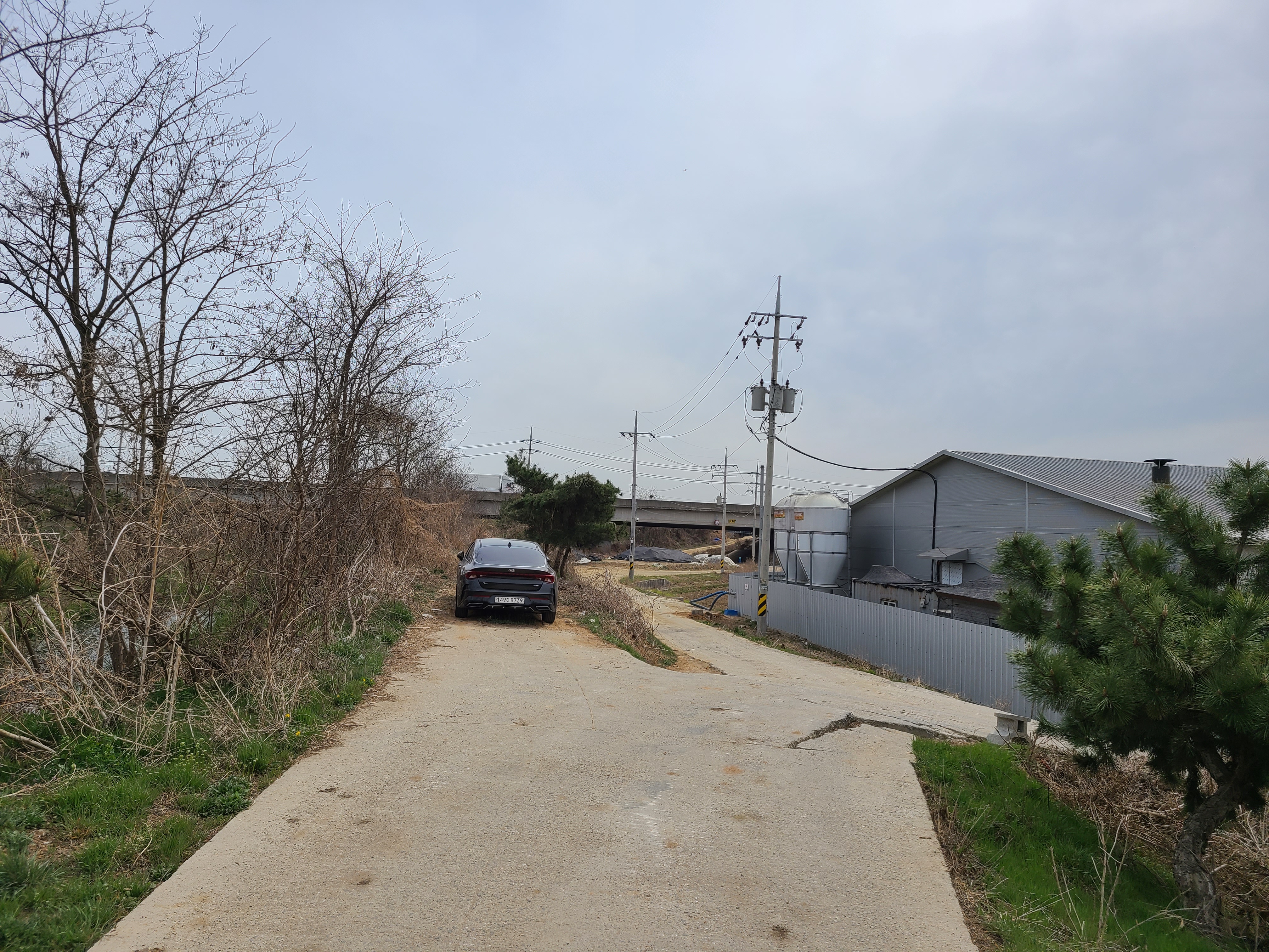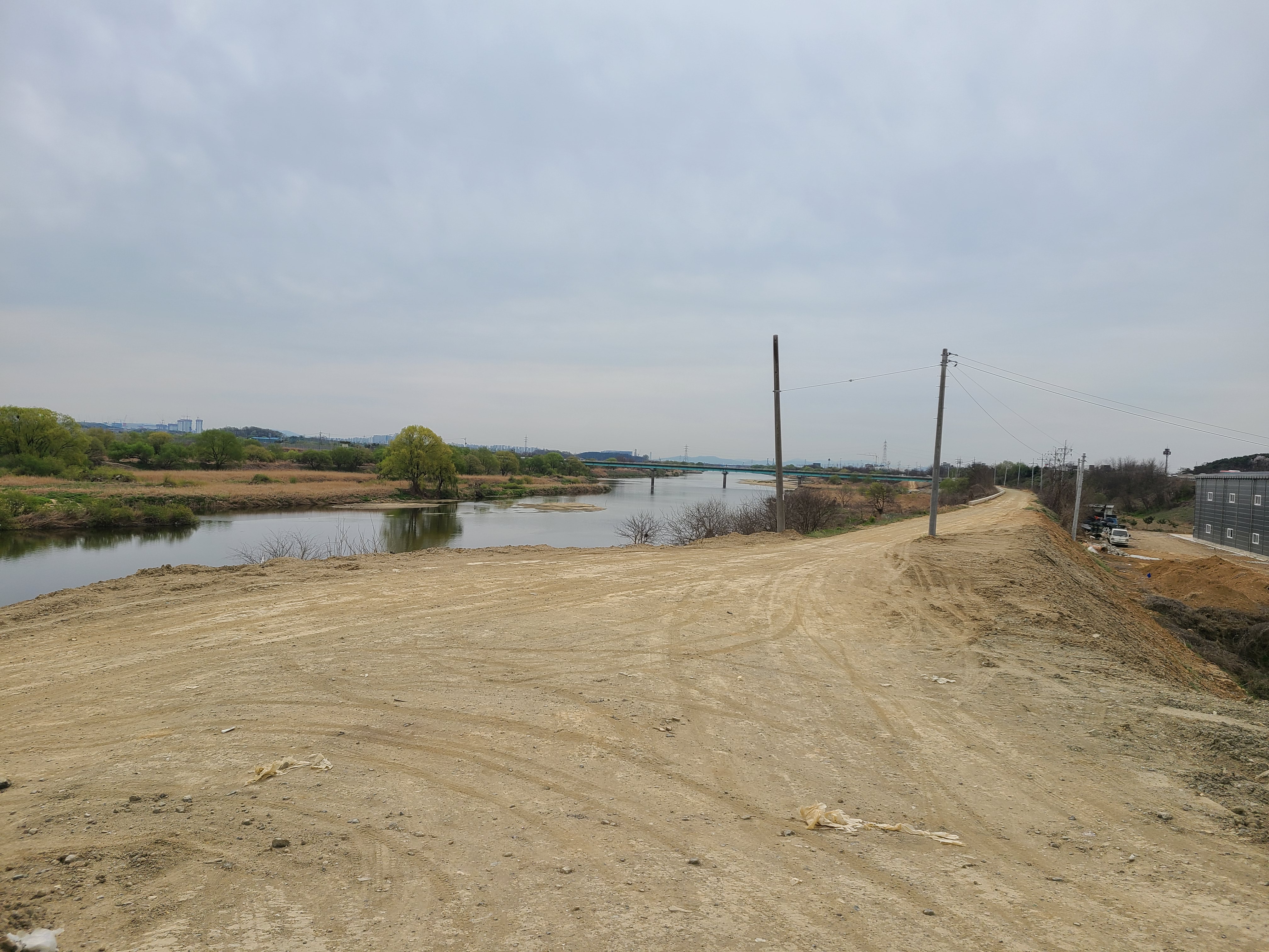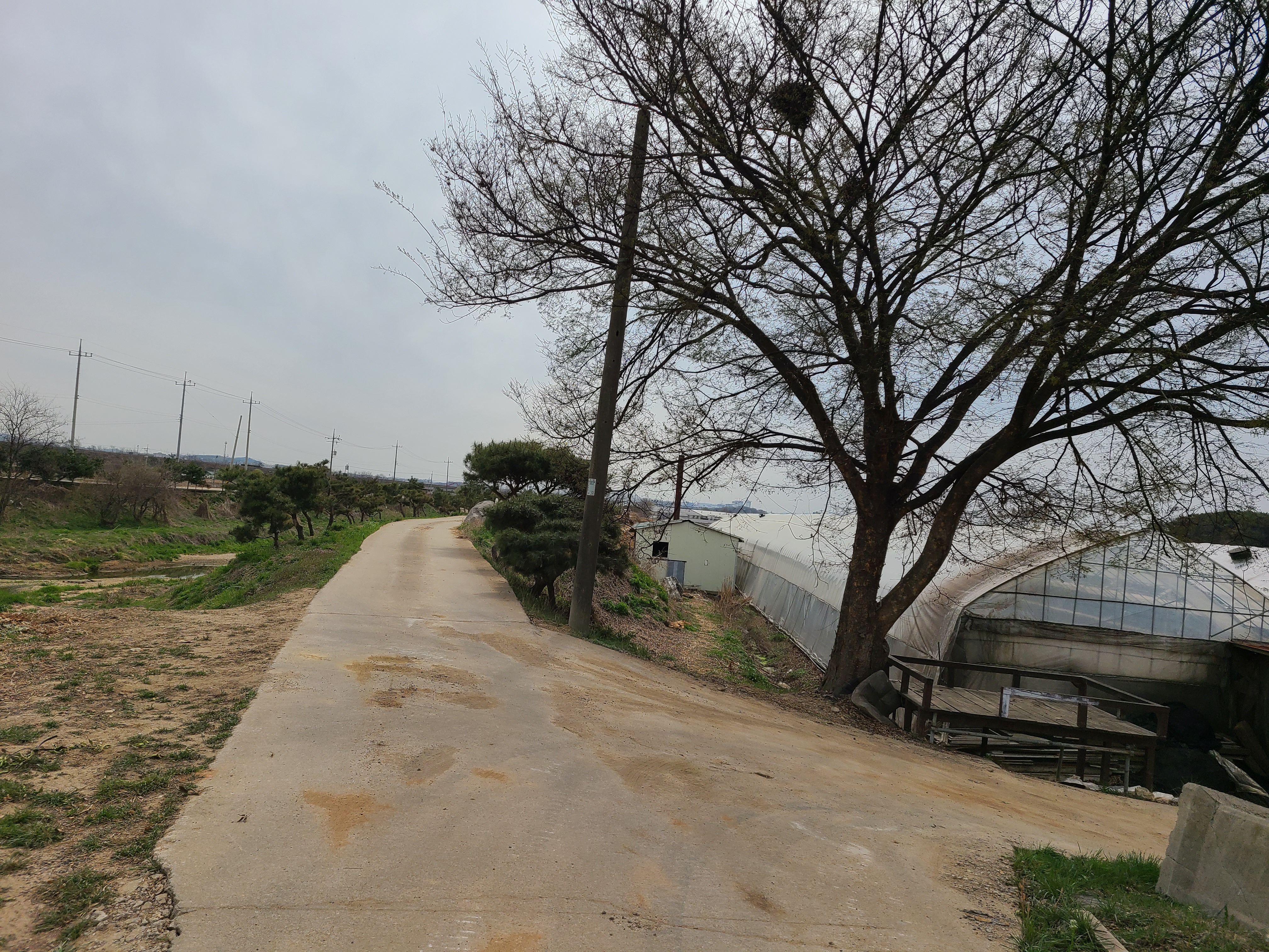 버스정류장에서 길 건너 농로를 따라 이동하여 길목길 다리를 건너 좌회전하여 비닐하우스를 끼고 둑길로 이동하여 평택-화성고속도로 아래를 지나 공사중인 진위천 둑길로 올라선다.