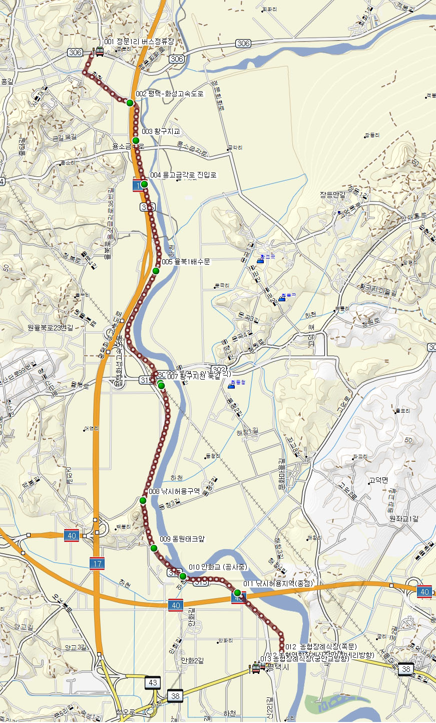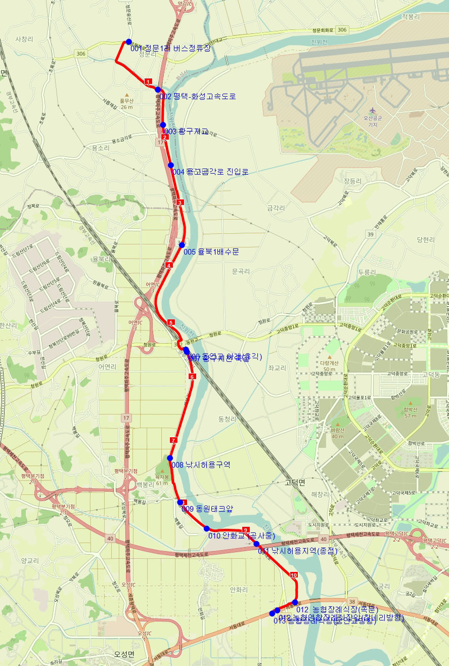 정문1리버스정류장-평택-화성고속도로 아래-황구지교-율북배수로-동원태크-안화교-농협장례식당 쪽문-농협장례식장 버스정류장