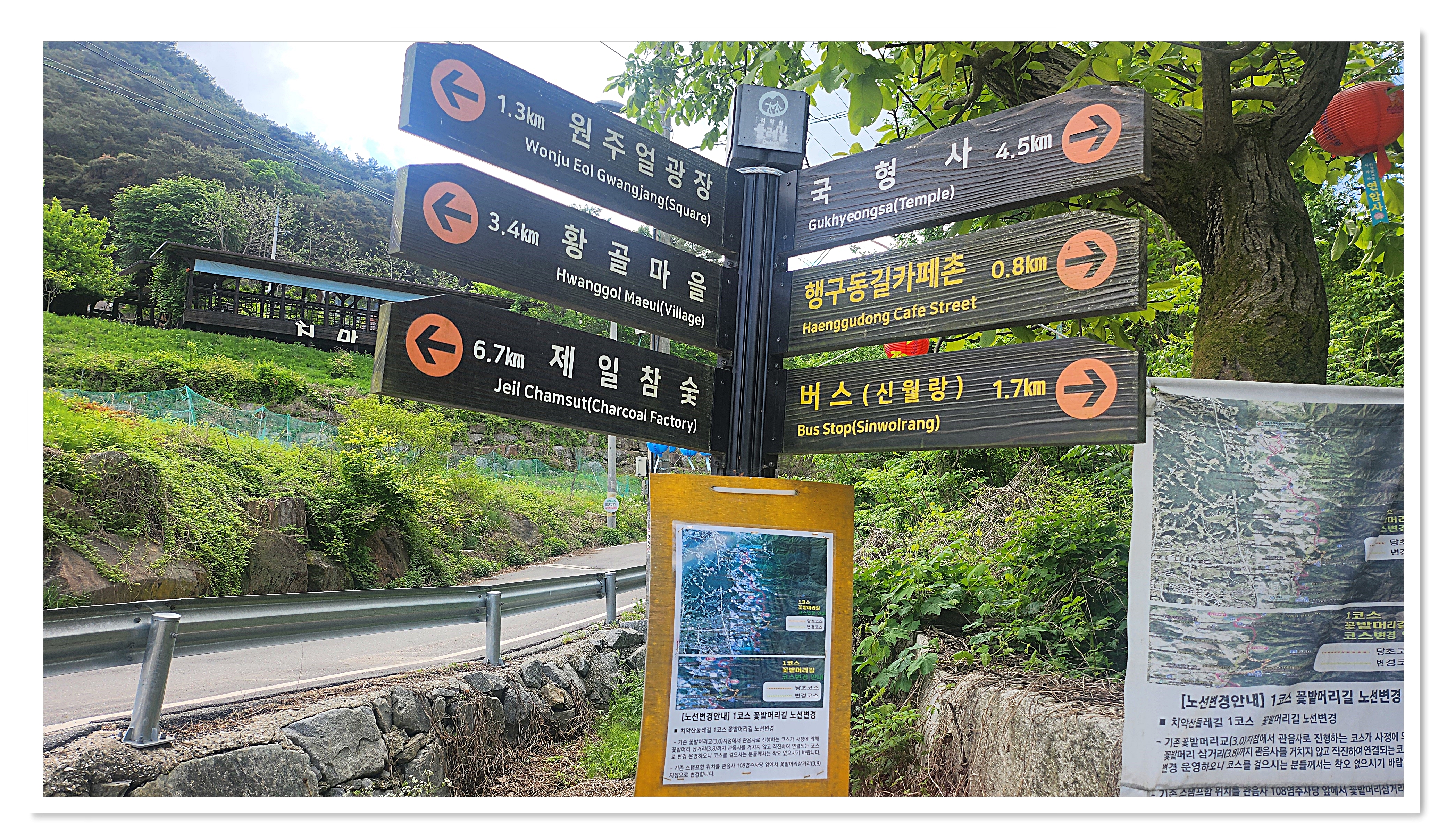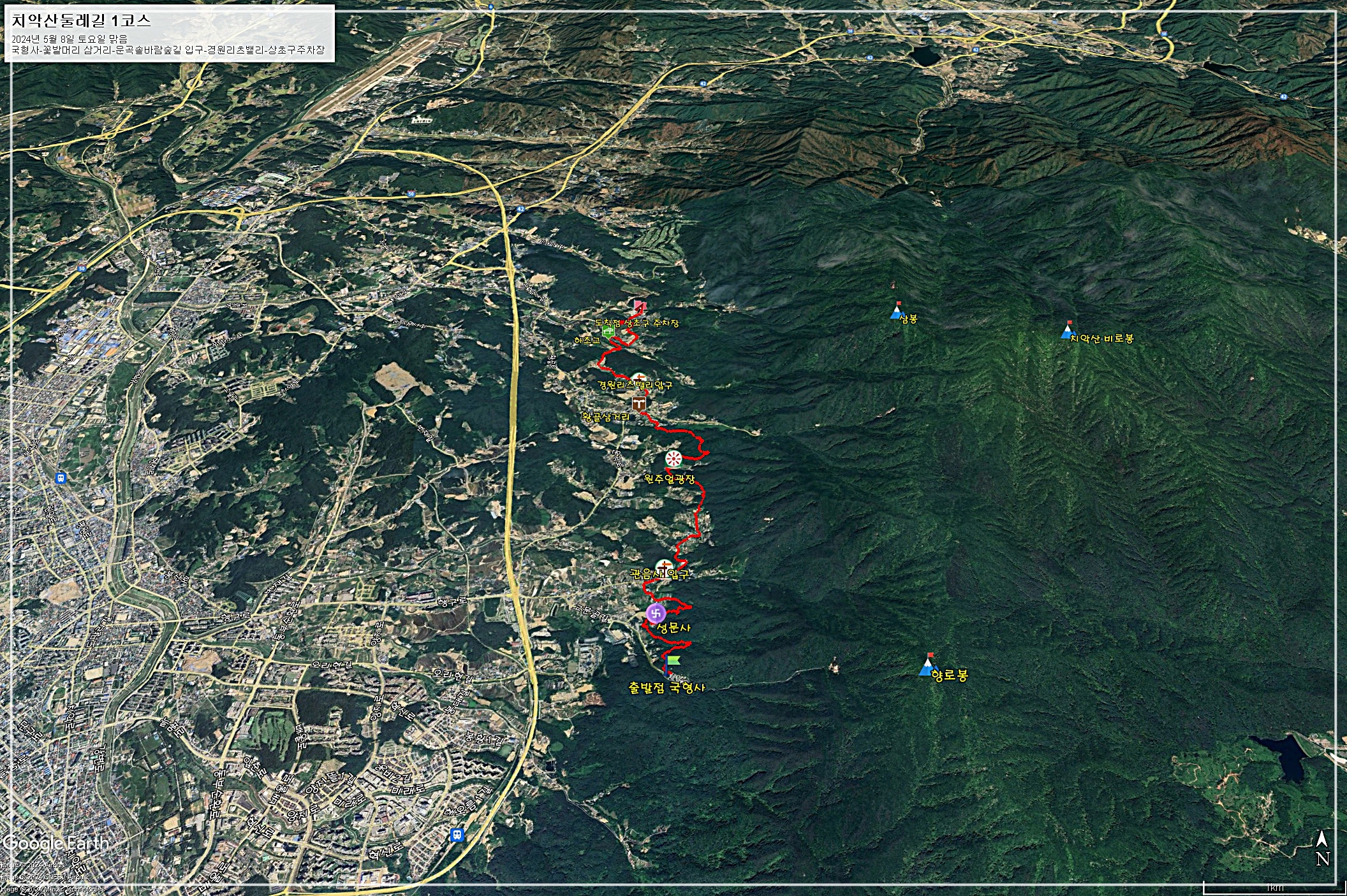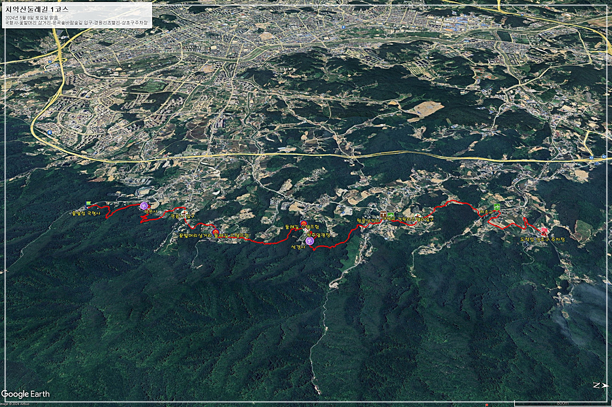 □ 코 스 : 국형사-성문사-관음사입구-꽃밭머리삼거리 스탬프함-운곡솔바람숲길-둘레길 스탬프함-원주얼광장-석경사-황골삼거리-대왕교-경원리츠밸리입구-하초교-상초구주차장