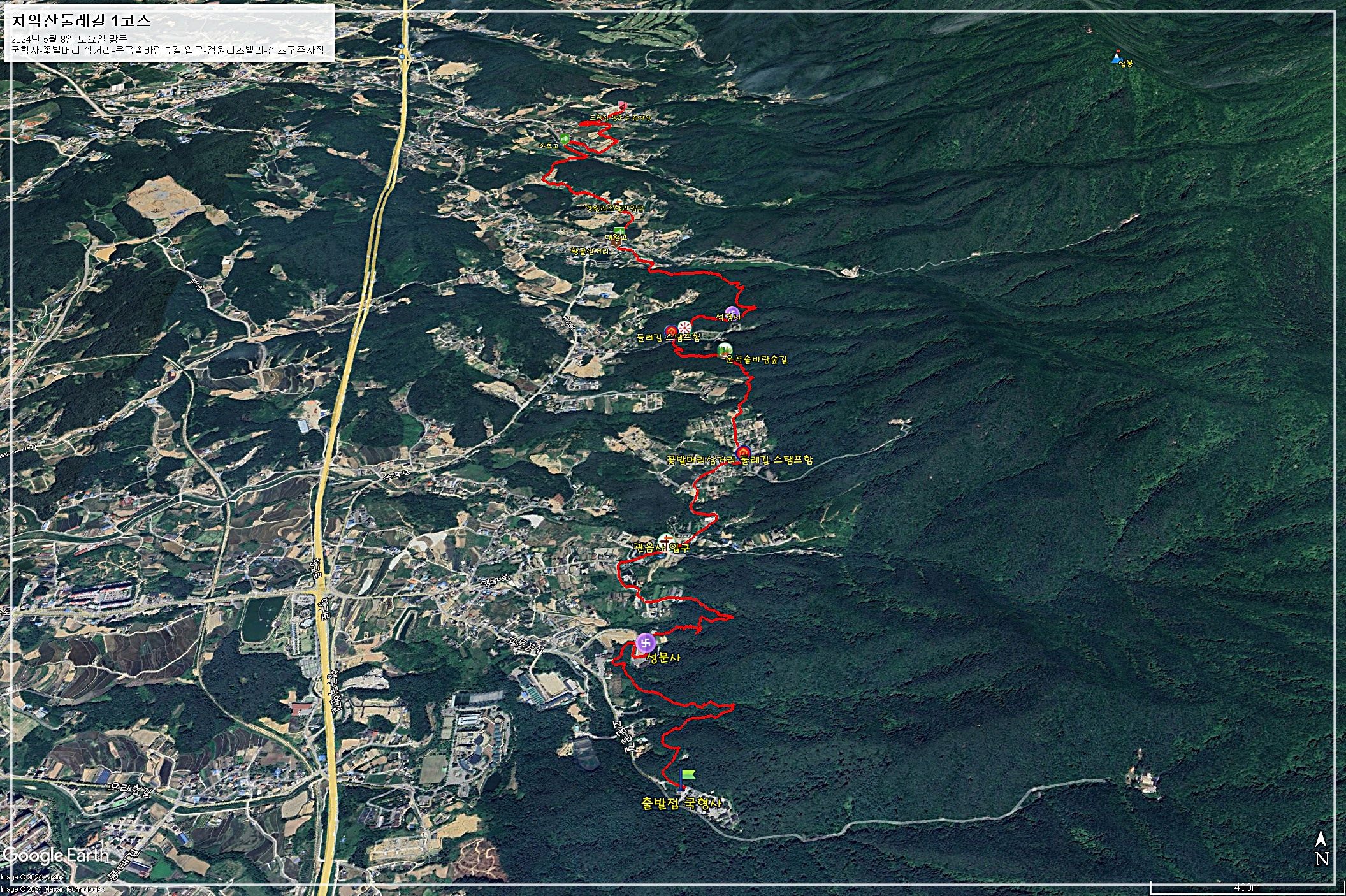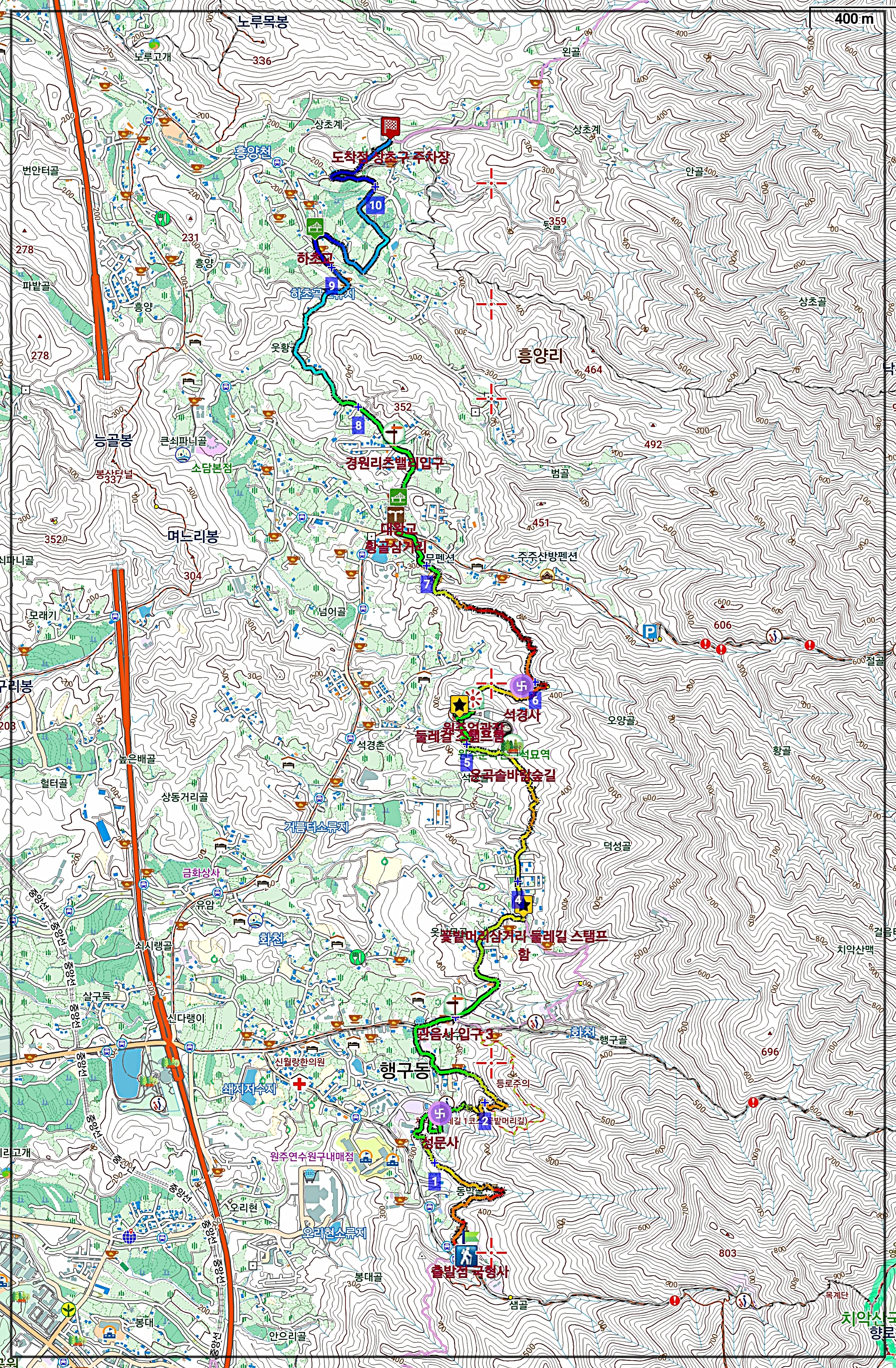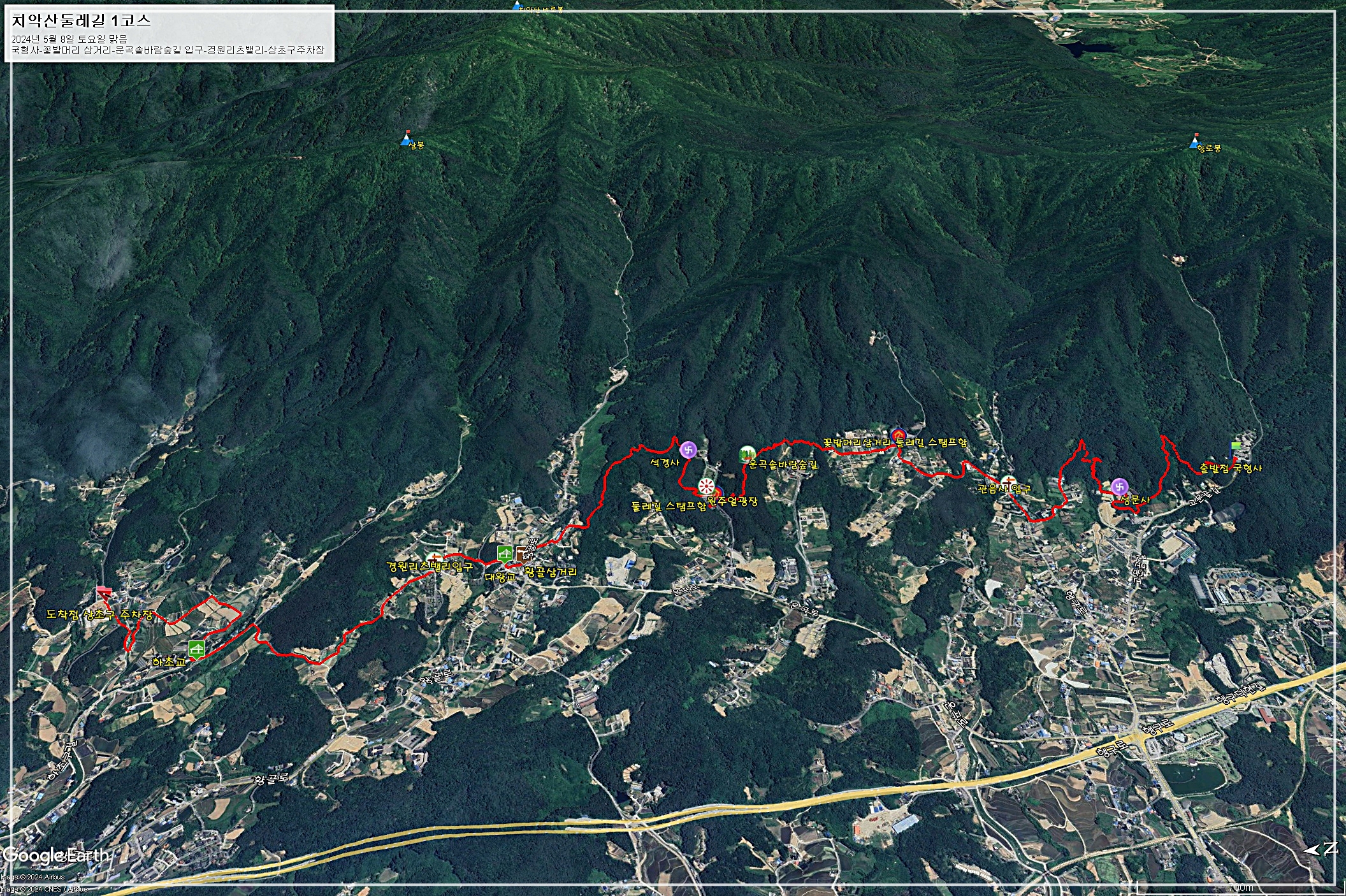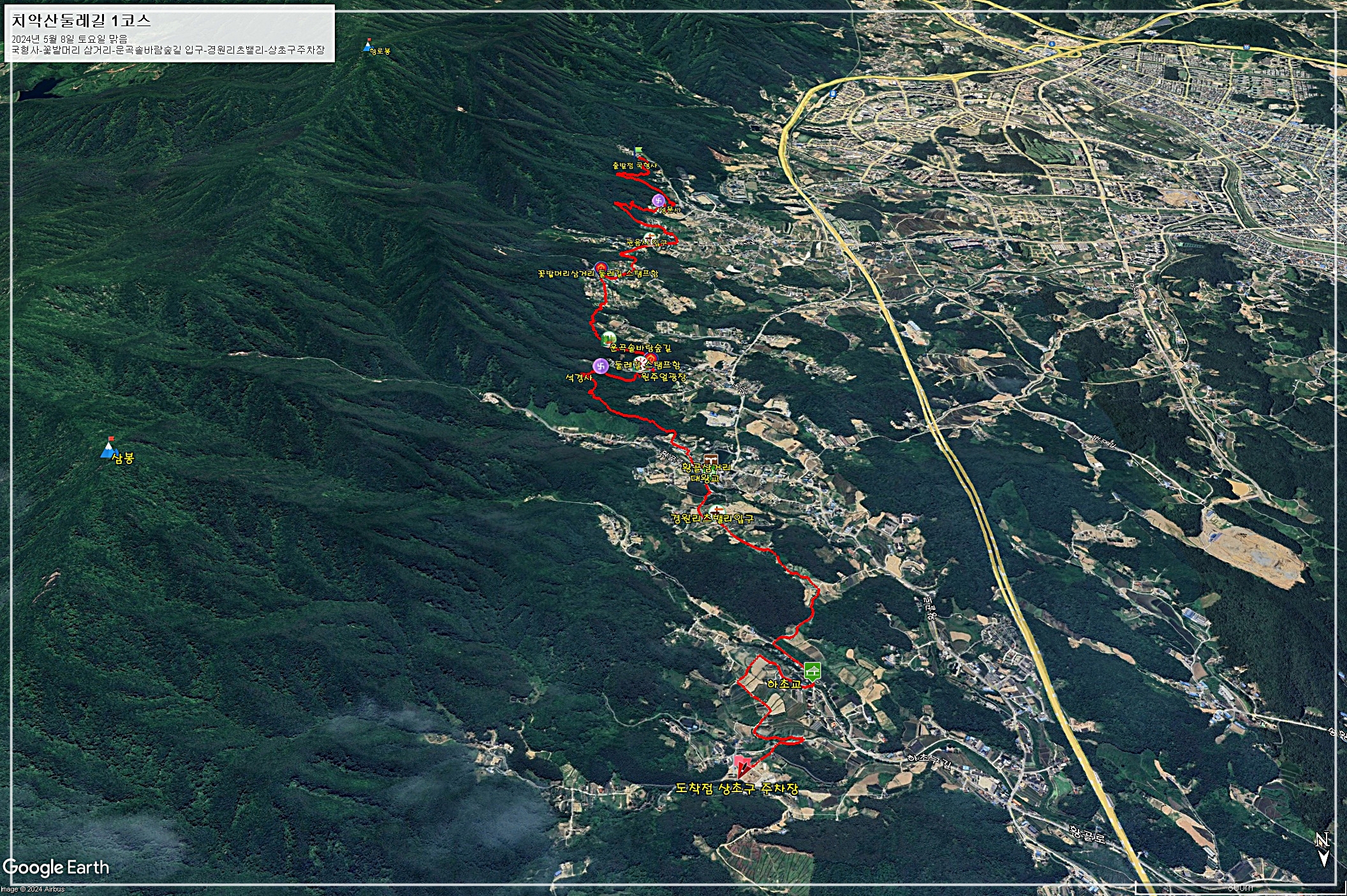□ 코 스 : 국형사-성문사-관음사입구-꽃밭머리삼거리 스탬프함-운곡솔바람숲길-둘레길 스탬프함-원주얼광장-석경사-황골삼거리-대왕교-경원리츠밸리입구-하초교-상초구주차장