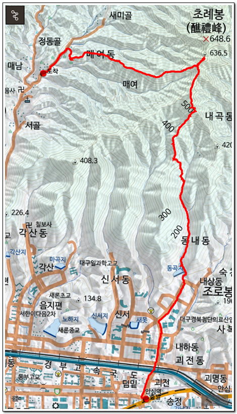 3. 산행코스 : 안심역~동곡지~초레봉~경북대학술림~매여동