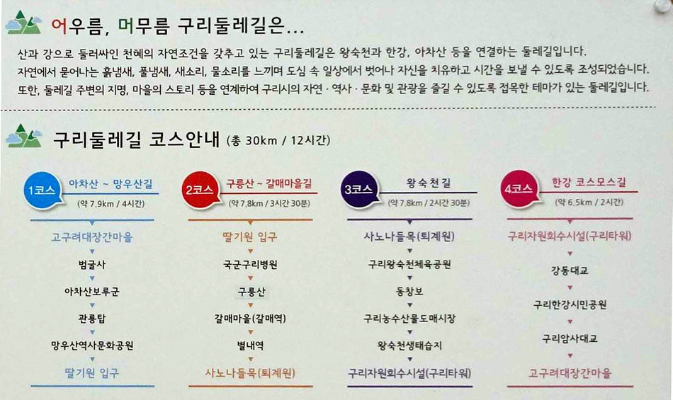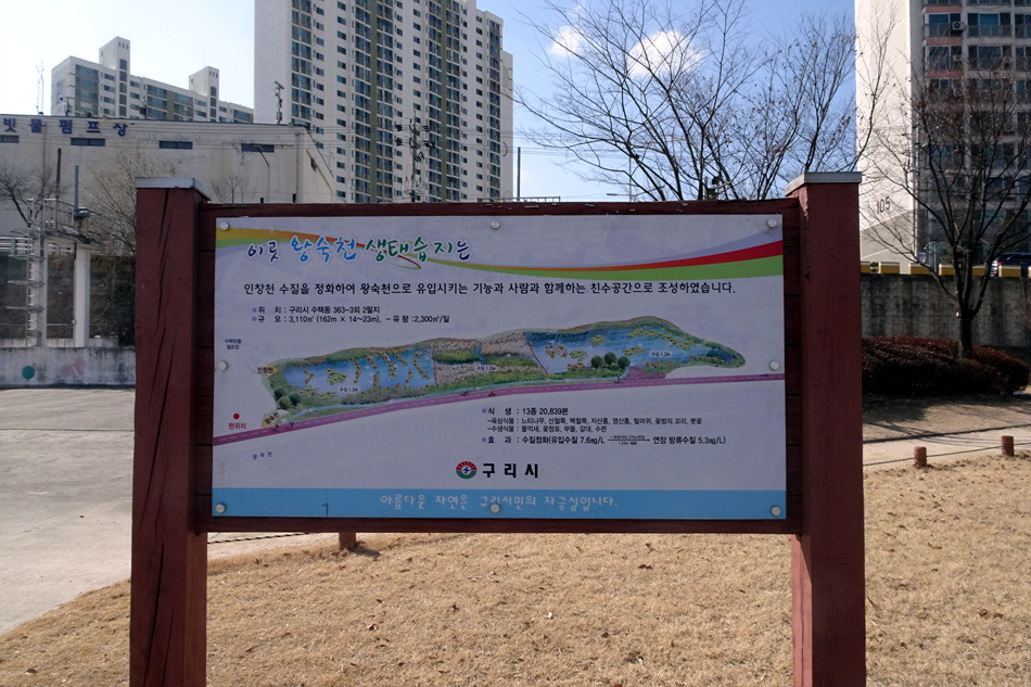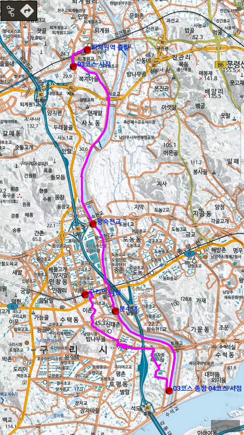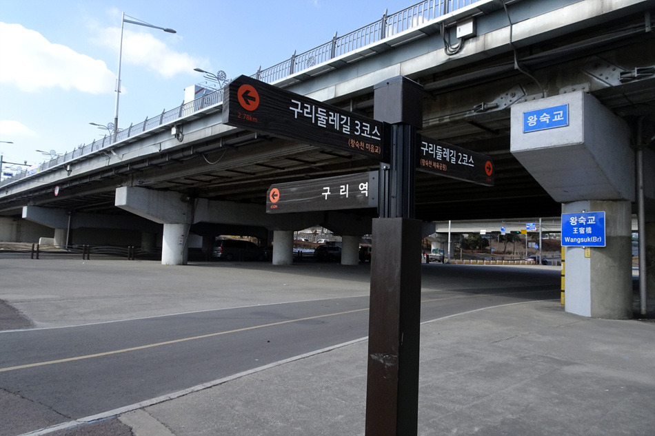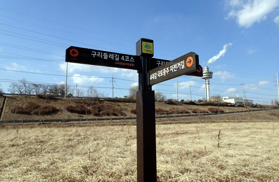 ♣구리시 둘레길03코스(왕숙천)답사걷기[2018/02/12/]위 치: 경기도 구리시 남양주시 촬영일시:2018년02월12일(월요일), 날씨기상:흐림(영하0.6도 체감0.9도 미세먼지) 걷기코스:퇴계원역~사노나들목~구리왕숙천체육공원~동창보~구리농수산물도매시장~구리자원회수시설(구리타워)~구리역 총소요시간:04시간21분(사진촬영 휴식(식사44분)시간포함)(이동거리 13.29km)[함께한사람~(뚜벅이 뚜심이 대중교통이용)] 시작=11시41분=퇴계원역에서*****마침=14시05분=구리역까지 [이시간은 답사 사진촬영과 휴식시간 포함이오니 개인의 걷기 실력으로 달라질수 있습니다.]제 1400회▶구리시 둘레길03코스(왕숙천길)이란???▶ ▶구리시 둘레길04코스(왕숙천길)에 대하여◀ ♣개 요♣ 그동안 이용하던 구리시 둘레길이 17년 새롭게정비하여 구리시 경계을 걷은걷는 04코스로 열였다는 소식에 접하고 18년01월28일 한강나루길에 우연히 04코스(한강코모스길)을 걷고 끝지점 대장간마을이 종점과 01코스시작점이어서 이기회에 구리둘레길을 답 사합니다 오늘은03코스(왕숙천길)을 찾아 퇴계원역에서 내려 구리둘레길03코스을 시작하여 사노나들목(퇴계원교)~왕숙천공원~ 동창보~농수산물도매시장~생태습지~구리자원회시설~마음교에서 전구간둘레길완주을 마치고 구리역으로 가려고 약4.5km 걸어 시내을 통하여 구리역에서 오늘에 걷기을 마무리 합니다.