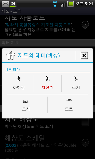 지도의 테마 - 벡터지도 테마를 (내부 테마, 외부 테마를 사용하거나 로커스 스토어에서 테마를 검색)을 선택합니다.