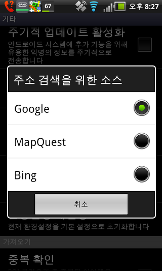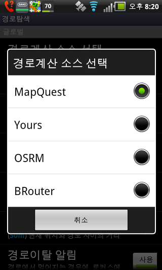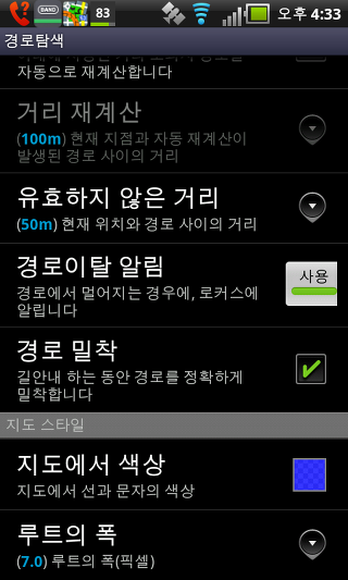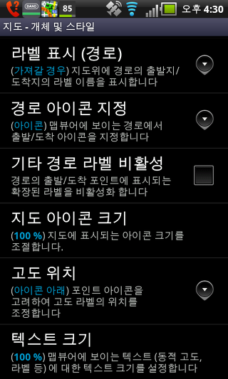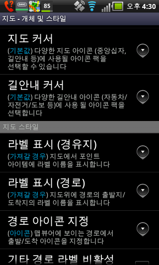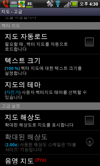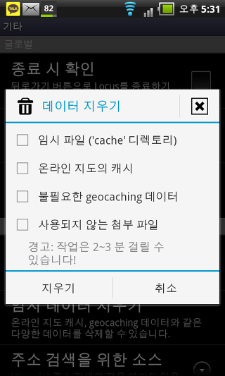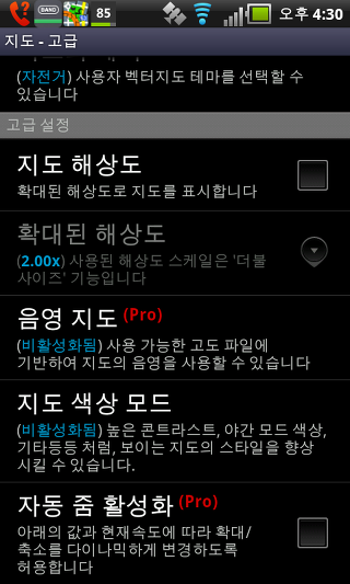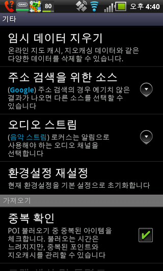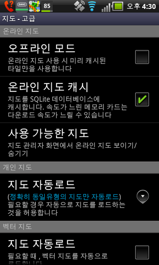 온라인 지도 캐시 - 이 설정는 온라인 지도를 임시로 저장할 수 있습니다. 만일 당신이 SD 카드에 공간이 부족하다면, 이 설정을 비활성화 할 수 있습니다.