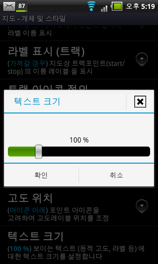 텍스트 크기 - 벡터 지도의 텍스트 크기를 설정합니다. 표시 방법을 변경하려면 슬라이더를 이동합니다.