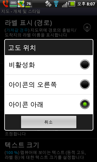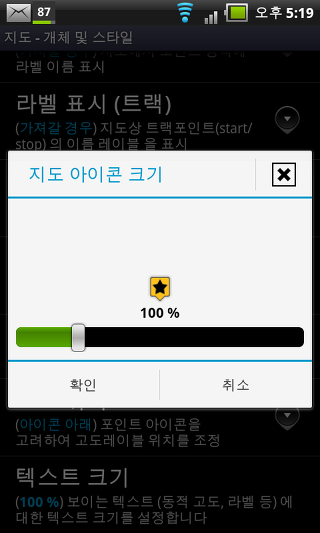 텍스트 크기 -지도에 표시된 지점 이름의 글꼴 크기를 설정합니다. 이 설정은 시간 반지, 동적 고도 및 레이블에 반영됩니다. 표시 방법을 변경하려면 슬라이더를 이동합니다.