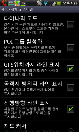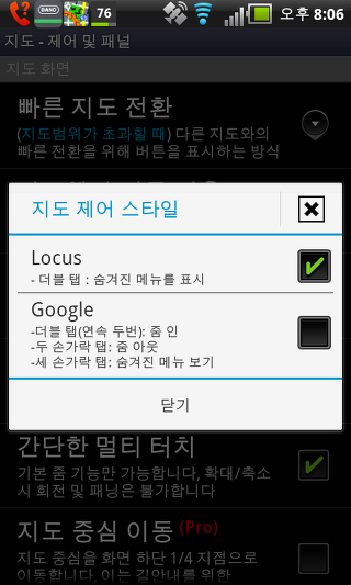 지도 제어 스타일 - 손가락으로 지도 화면의 기본적인 기능을 제어하는 방법을 선택할 수 있습니다