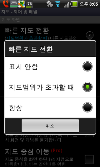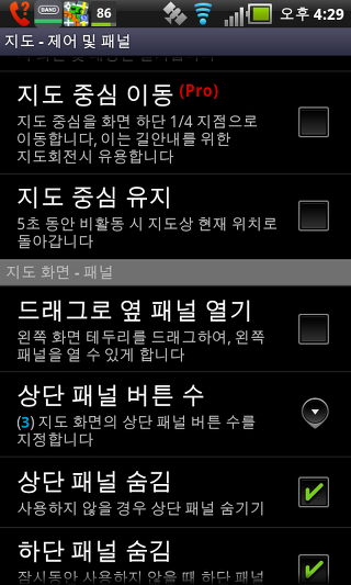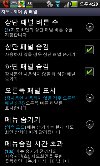 하단 패널 숨김 -이 비활성 상태 일 경우 잠시 동안 하단 패널을 숨길 수 있습니다. 다시 표시하려면 (세 손가락 탭하면 "구글"에 "스타일 맵 컨트롤"을 설정 한 경우) 지도 화면을 더블 클릭합니다.