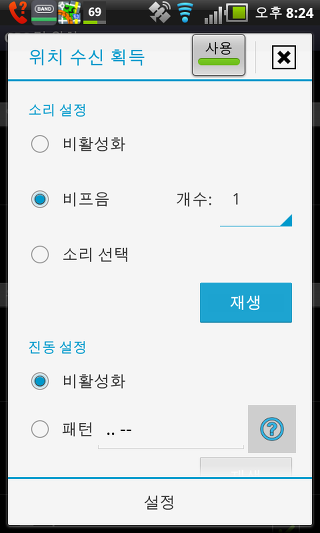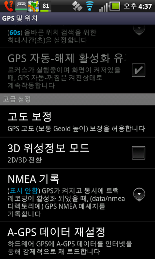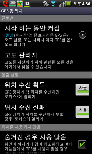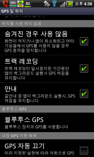 숨겨진 경우 사용 안함 - 자동으로 GPS를 끄기; 화면이 꺼진 경우 또는 애플리케이션이 최소화 되고 GPS는 다른 기능을 사용하지 않을 경우.
