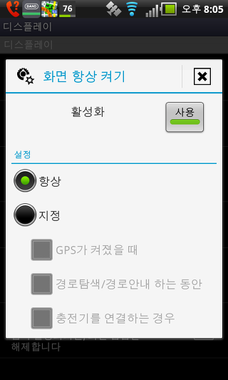 항상 화면 켜기 - 백라이트가 항상 켜져 유지