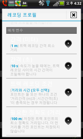 최소 정확도 - GPS 위치 (100미터) 최소 요구되는 정확도를 설정합니다. 그런 다음 GPS가 꺼집니다.