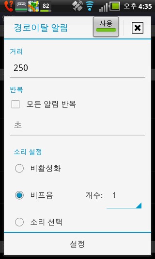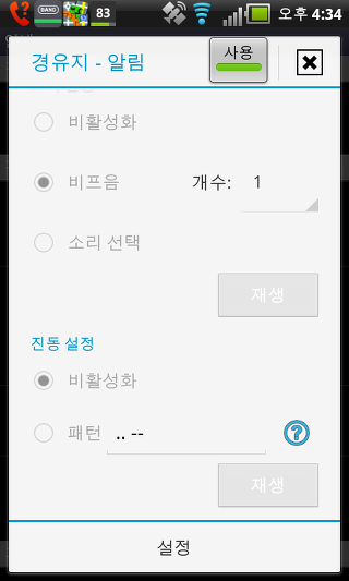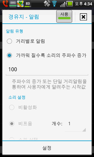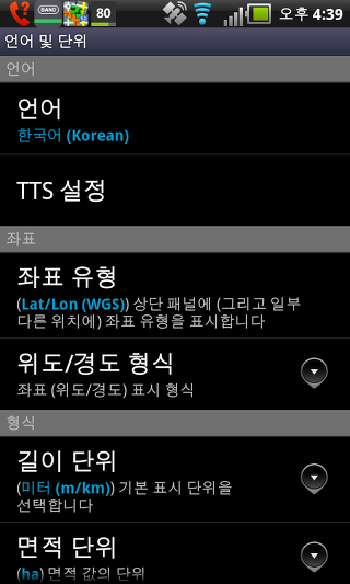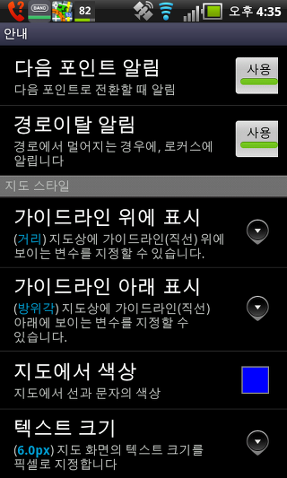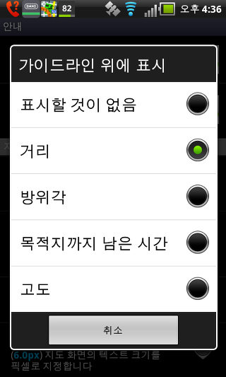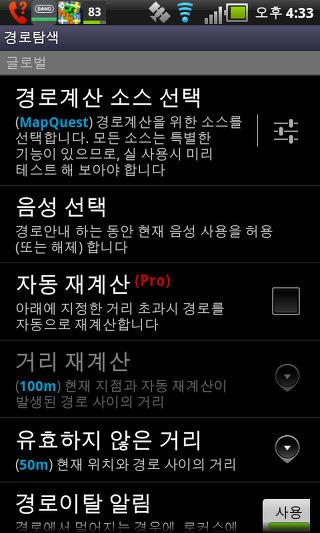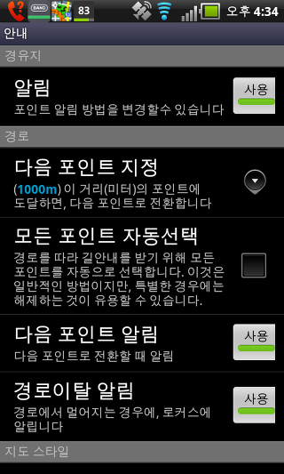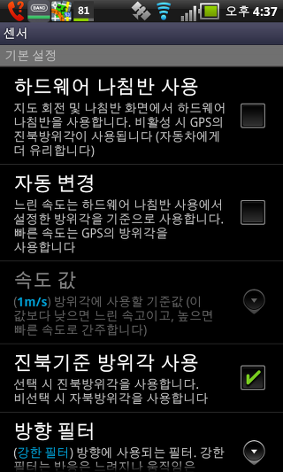 하드웨어 나침반 사용 - 이 설정은 휴대폰에 붙박이 되어있는 하드웨어 나침과 GPS 방위 중 하나를 선택할 수 있습니다. 두 옵션은 지도의 회전 및 나침반 화면의 사용을 위해 사용됩니다.