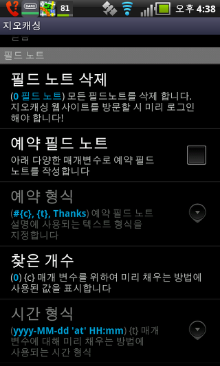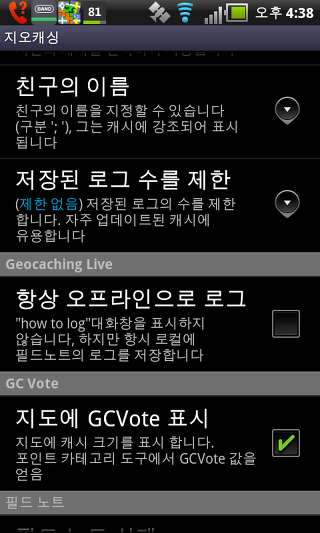 항상 오프라인으로 로그 - 이 설정은 온라인 기록에 대한 모든 가능성을 숨깁니다. 로그는 항상 Geocaching.com 서버에서 나중에 업로드할 필드 노트를 저장합니다. 필드 노트를 생성 , 필드 노트의 성공적인 업로드 후 로컬 필드 노트를 생성합니다.
