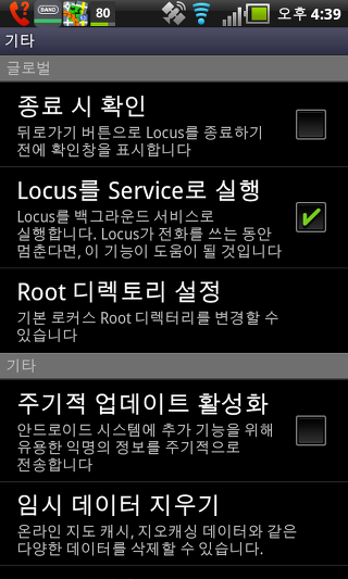 Locus를 Service로 실행 -이 설정은 로커스를 백그라운드 서비스로 실행하여 우선 순위를 높일 수 있습니다. 이것은 전화가 와서 로커스가 커졌을 때, 시스템은 가능한 한 오랫동안 살아있는 로커스를 유지하기 위해 노력할 것입니다.단 백그라운드로 실행되기 때문에 배터리 소모가 빠릅니다.