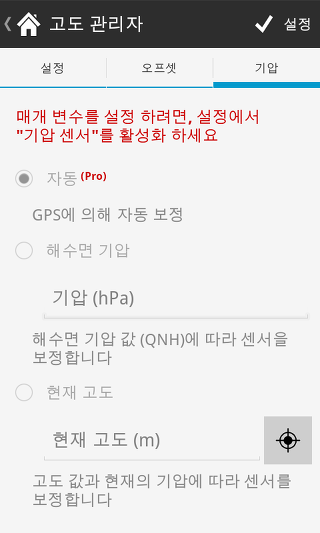 고도 보정 - (일반적으로 지오이드 높이 또는 고도 오프셋 (offset)) GPS 고도에 보정을 정의 할 수 있습니다.이 설정은 고도 관리