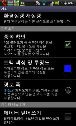 데이터를 덮어 쓰기 - 새 파일을 내보낼 때 이 같은 날짜와 함께 저장되지 않도록 응용 프로그램 (POI, 기록된 트랙)에서 내 보낸 데이터를 덮어 쓸 수 있습니다.