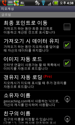 경유지 자동 로딩 - 지도에 캐시를 표시 할 때 이 설정이 활성화 되면, 지정된 포인트도 자동으로 표시됩니다