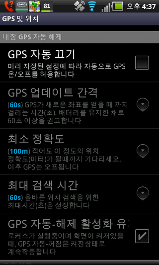 GPS 자동-해제 활성 유지- 로커스가 실행중이며 화면이 켜져있을 때, GPS 자동 꺼짐 활성 및 작동 GPS를 유지