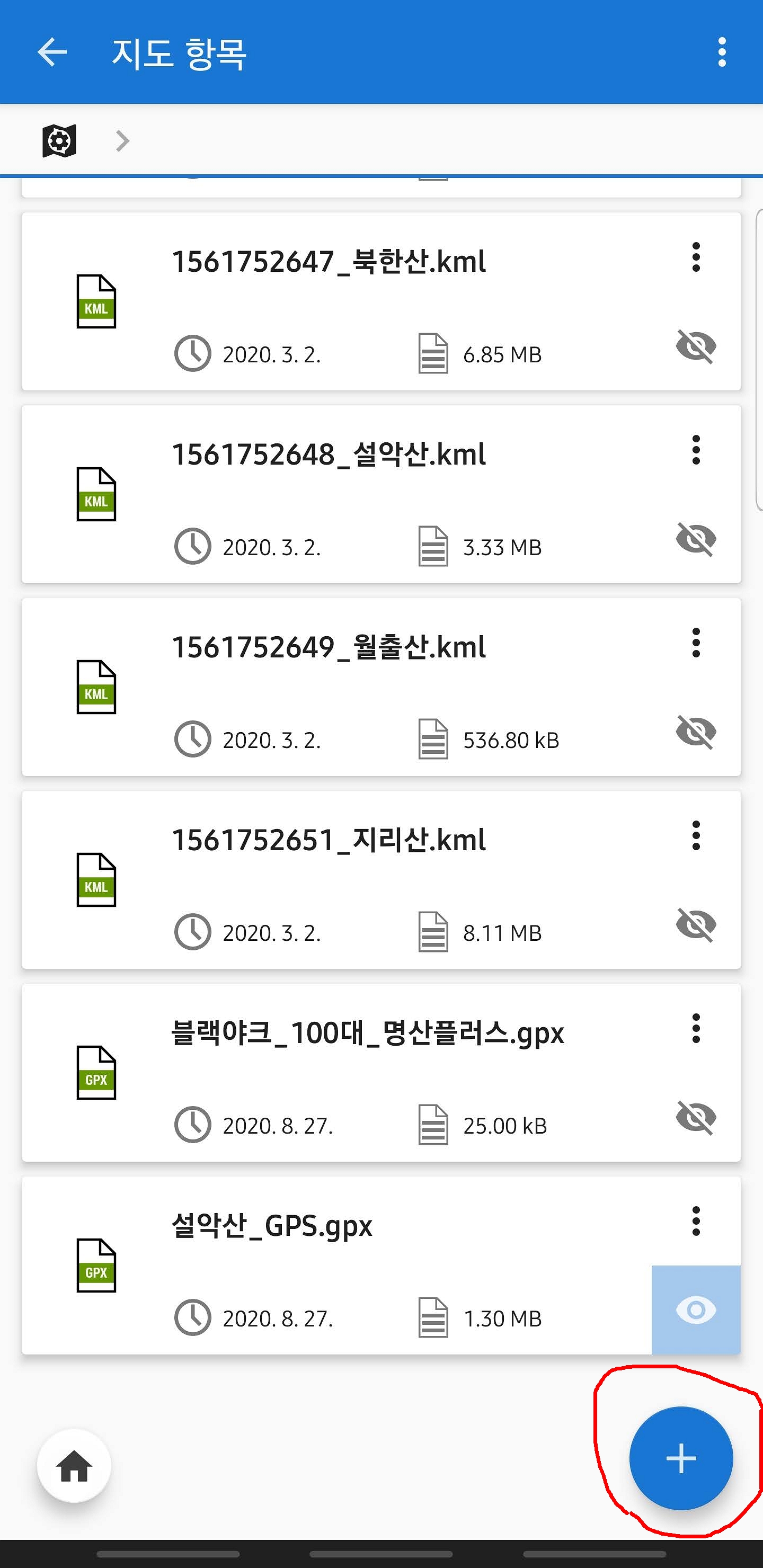 kml 또는 gpx 파일을 locus > mapItems에 직접 넣어도되고 아래 + 부분을 눌러 선택해서 가져와도 됩니다