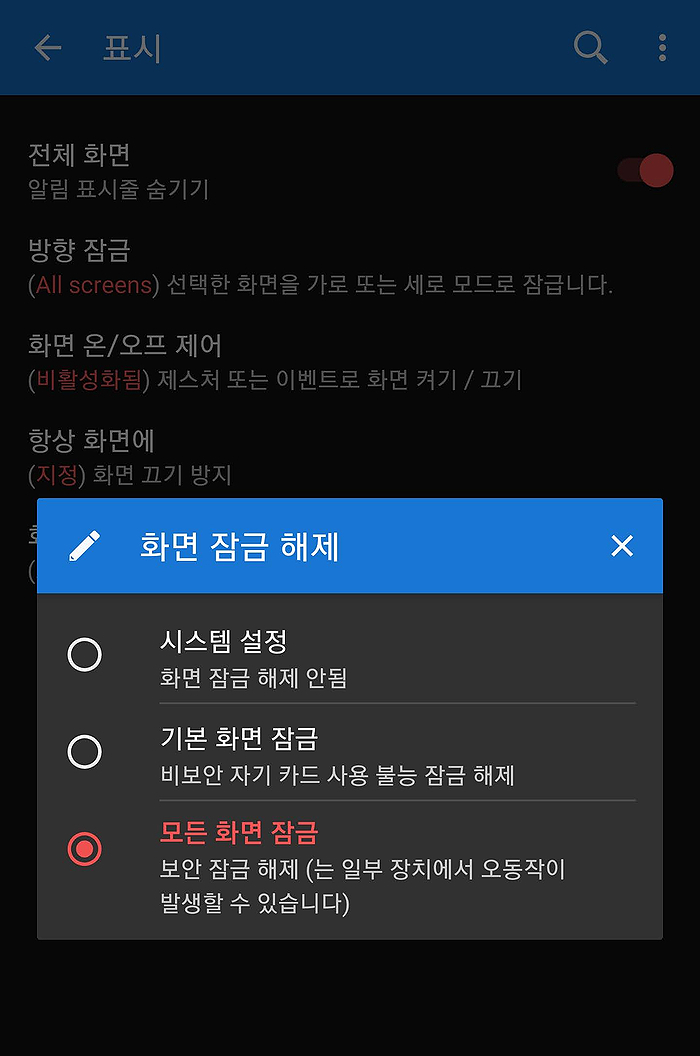 메뉴(왼쪽 위 상단 3줄 마크) > 설정 > 제어 > 표시에서 맨 마지막 5번째 화면 잠금 해제가 있습니다
