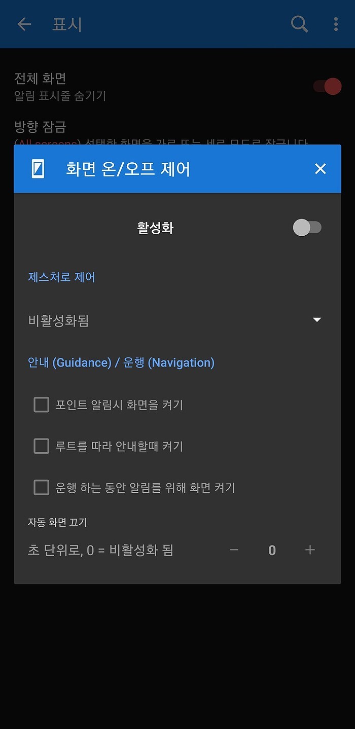 메뉴(왼쪽 위 상단 3줄 마크) > 설정 > 제어 > 표시에서 3번째 화면 온/오프 제어 라는 곳이 있습니다