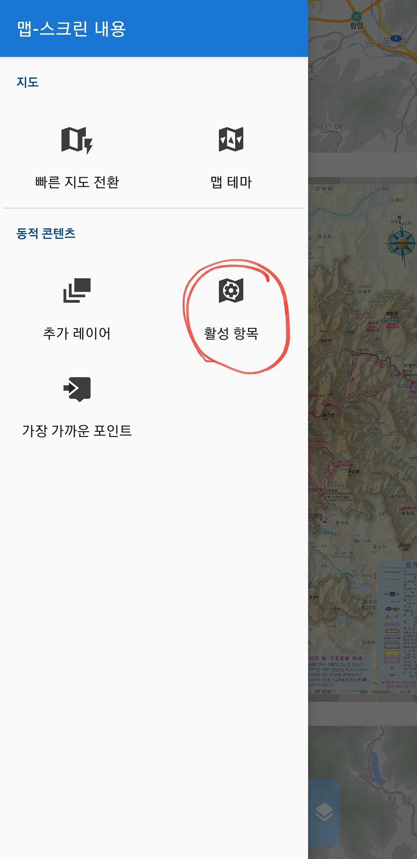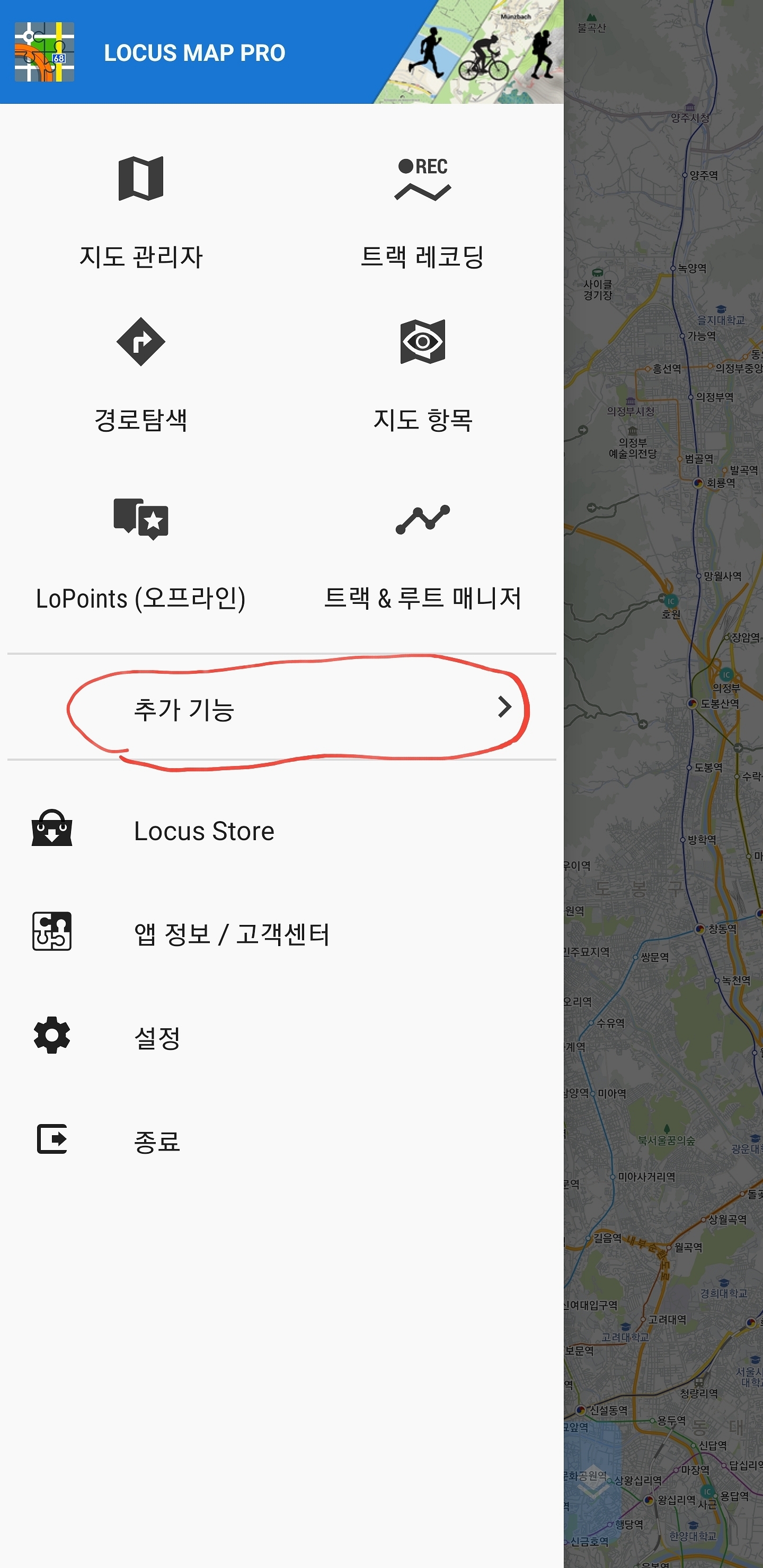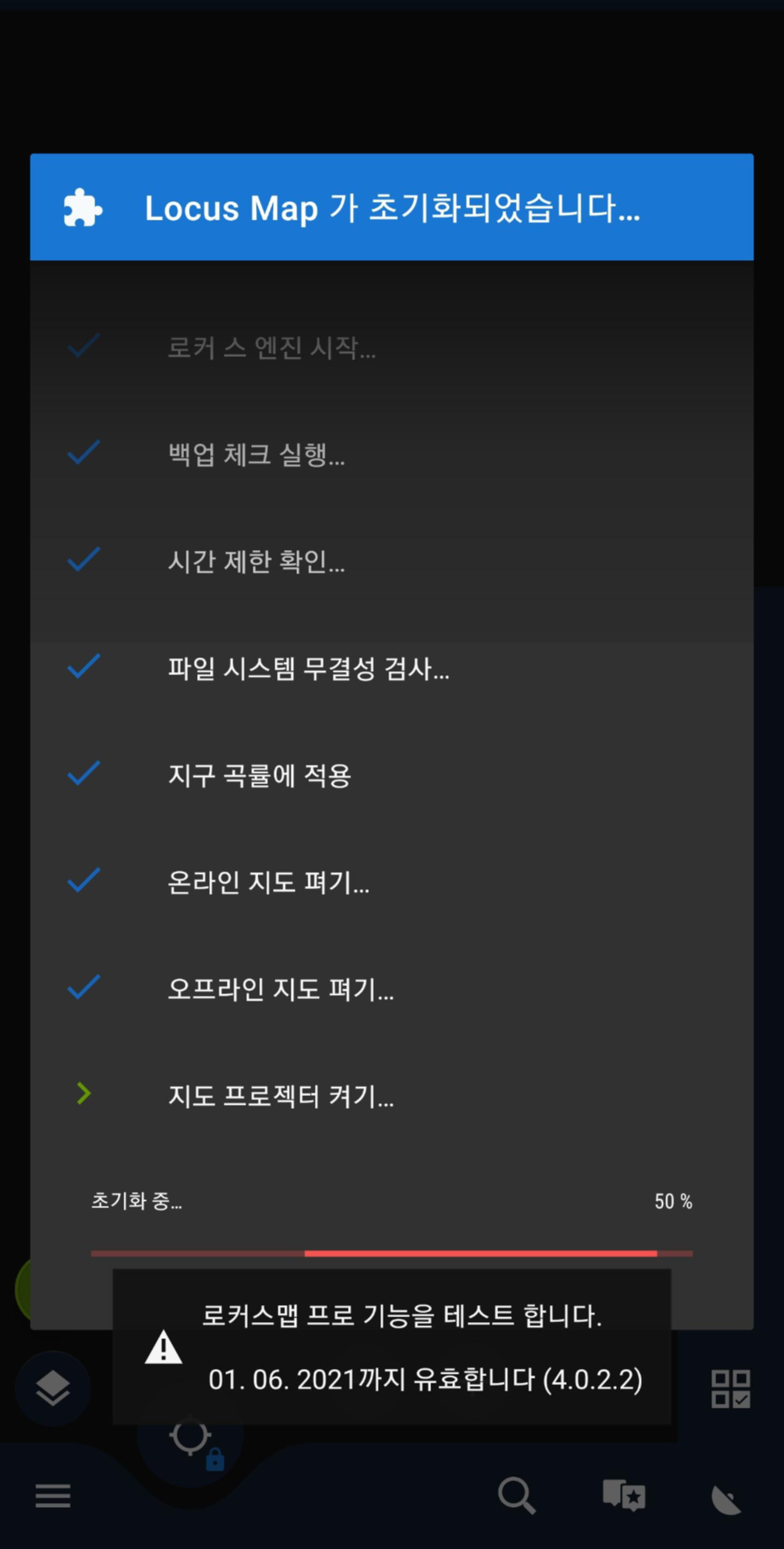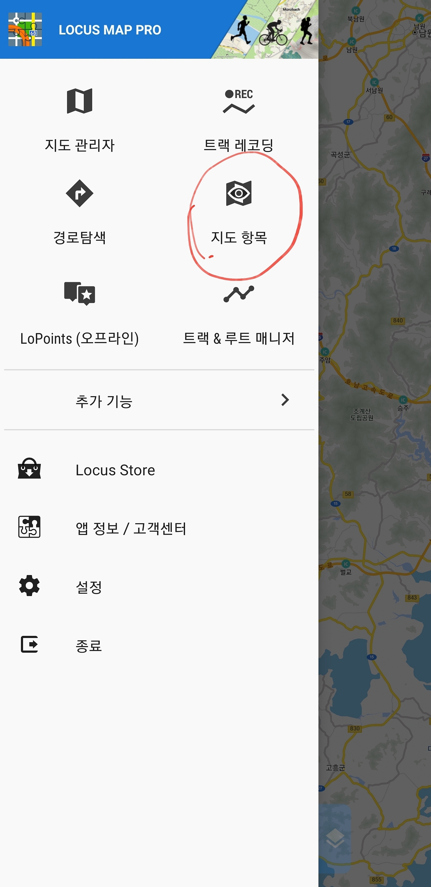 오른쪽 사진처럼 로커스맵을 사용할 때마다 초기화 화면이 나옵니다 그래서 지도를 사용하지 않을 땐 활성화를 꺼야 하는데요 끄는 방법은 메뉴를 눌러서 들어가면 "지도 항목"이 보입니다 아마 이게 안 보이시는 분들도 계실 듯싶은데요 이 부분에서 안 보이시면 아래 추가 기능에 들어가시면 지도 항목이 보일 겁니다