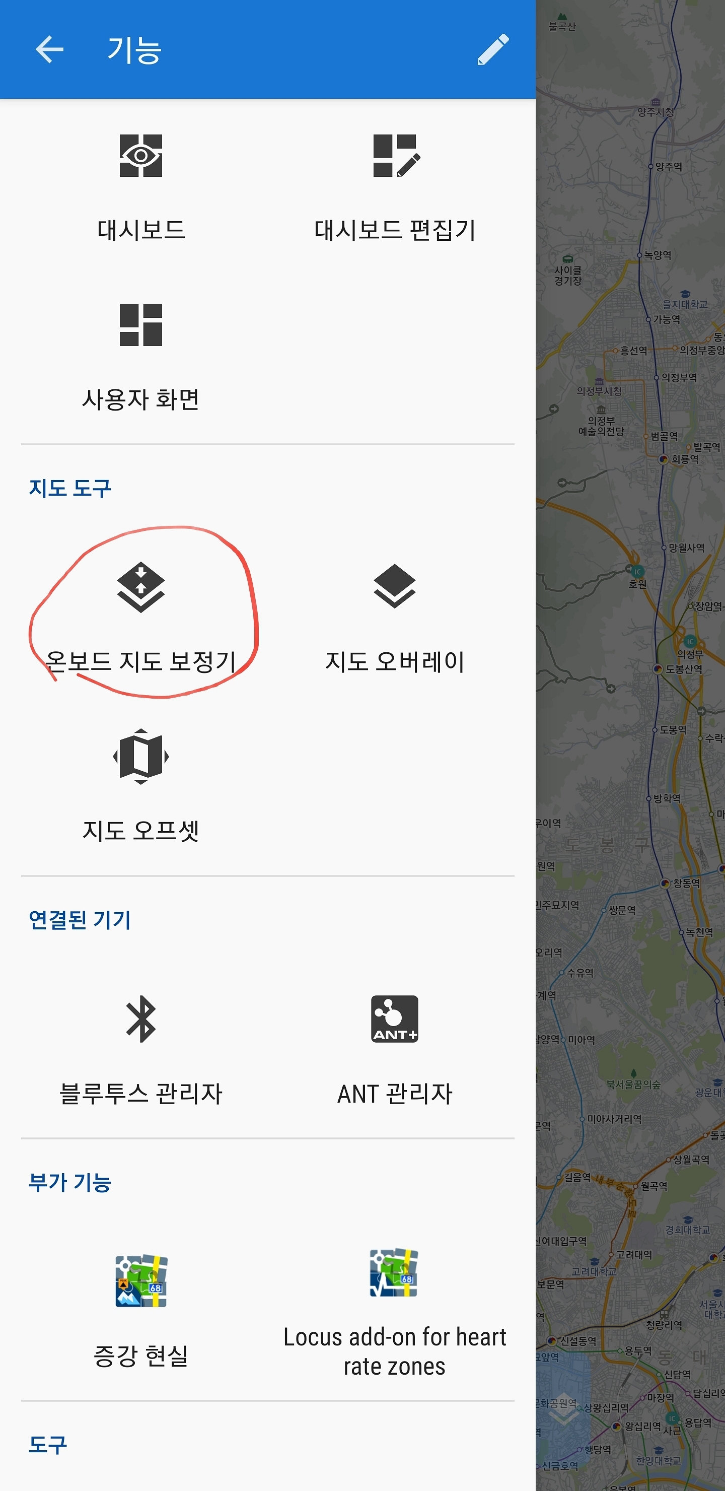 <로커스맵 4는 메뉴(왼쪽 하단 3줄 마크) > 모든 기능(오른쪽 하단) >지도 도구 > 온보드 지도 보정기>