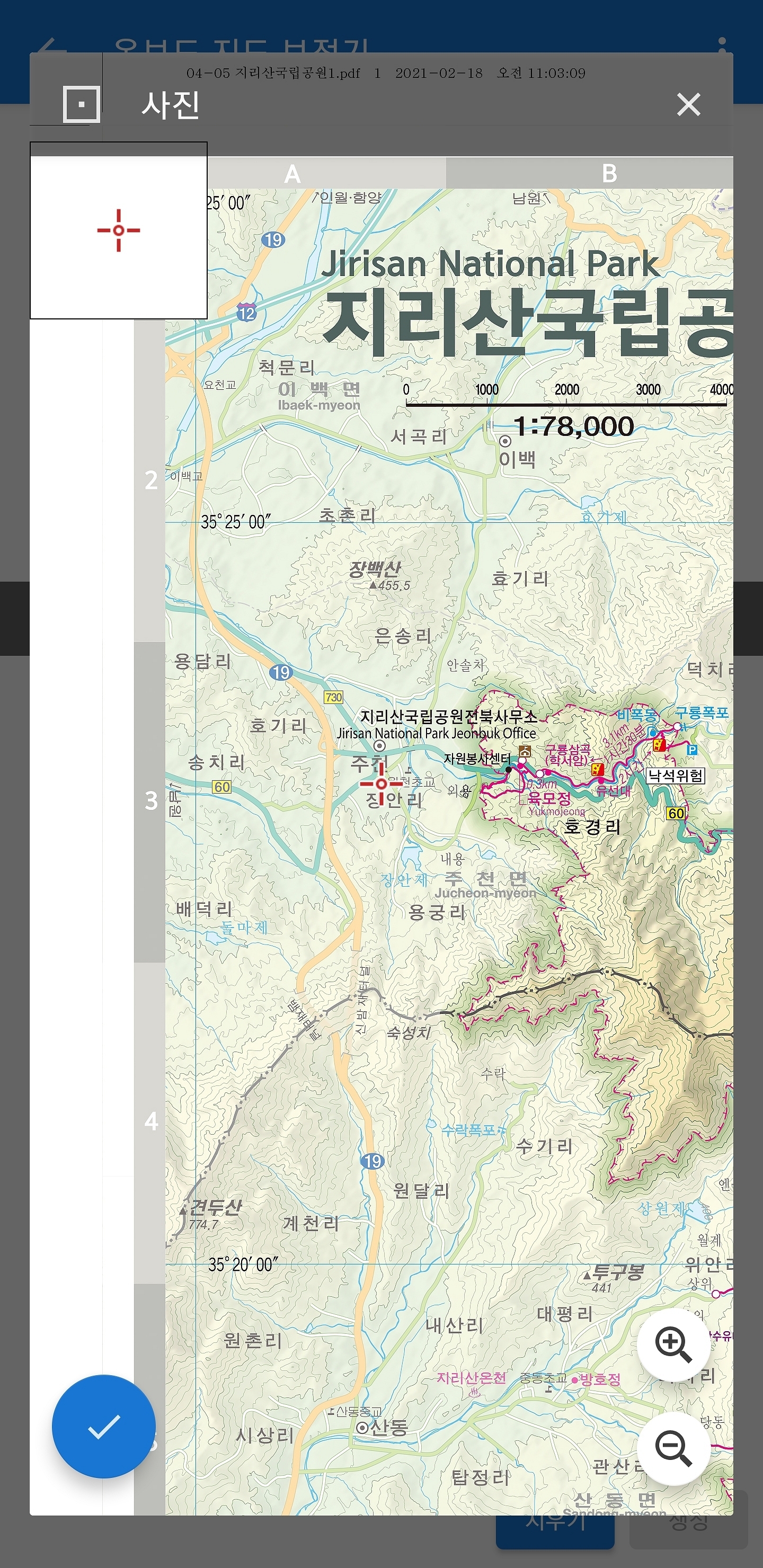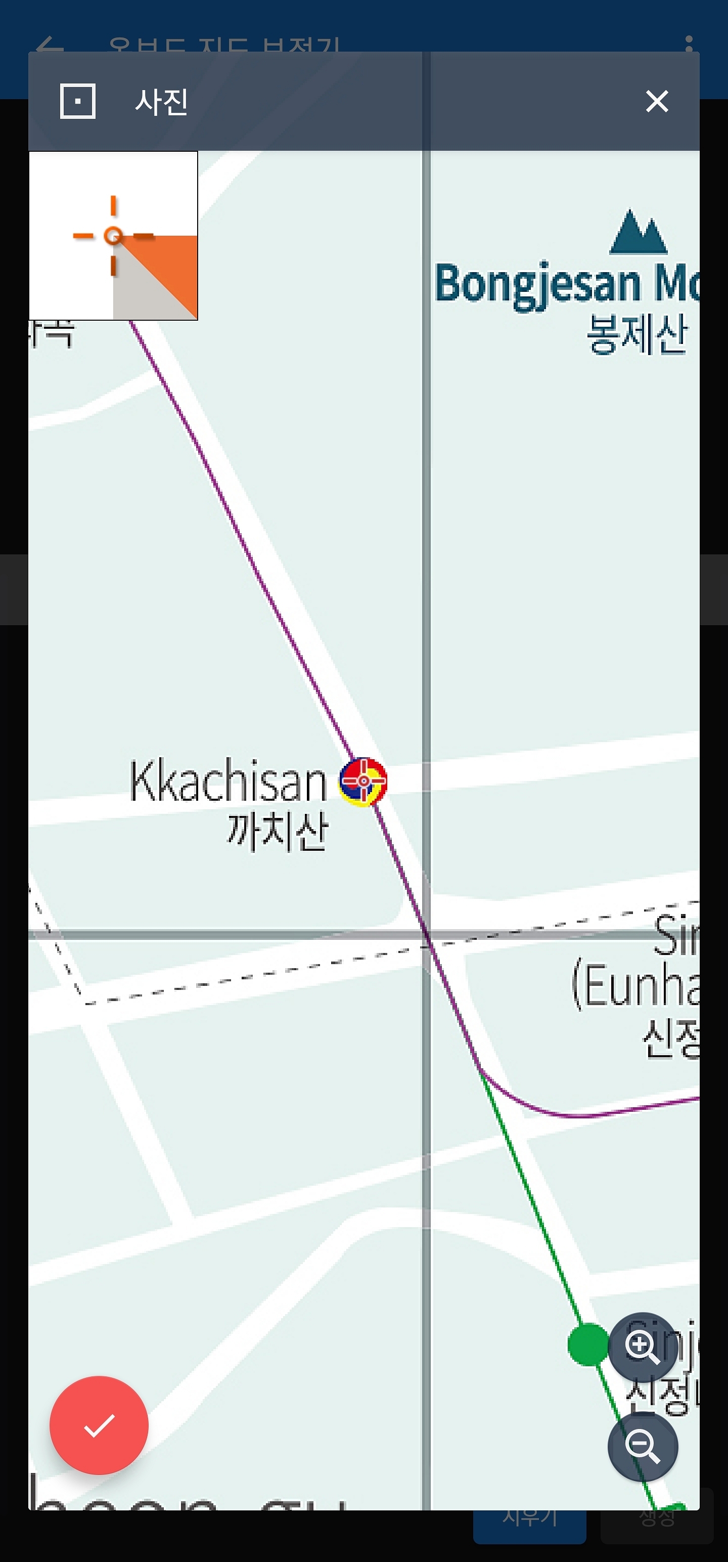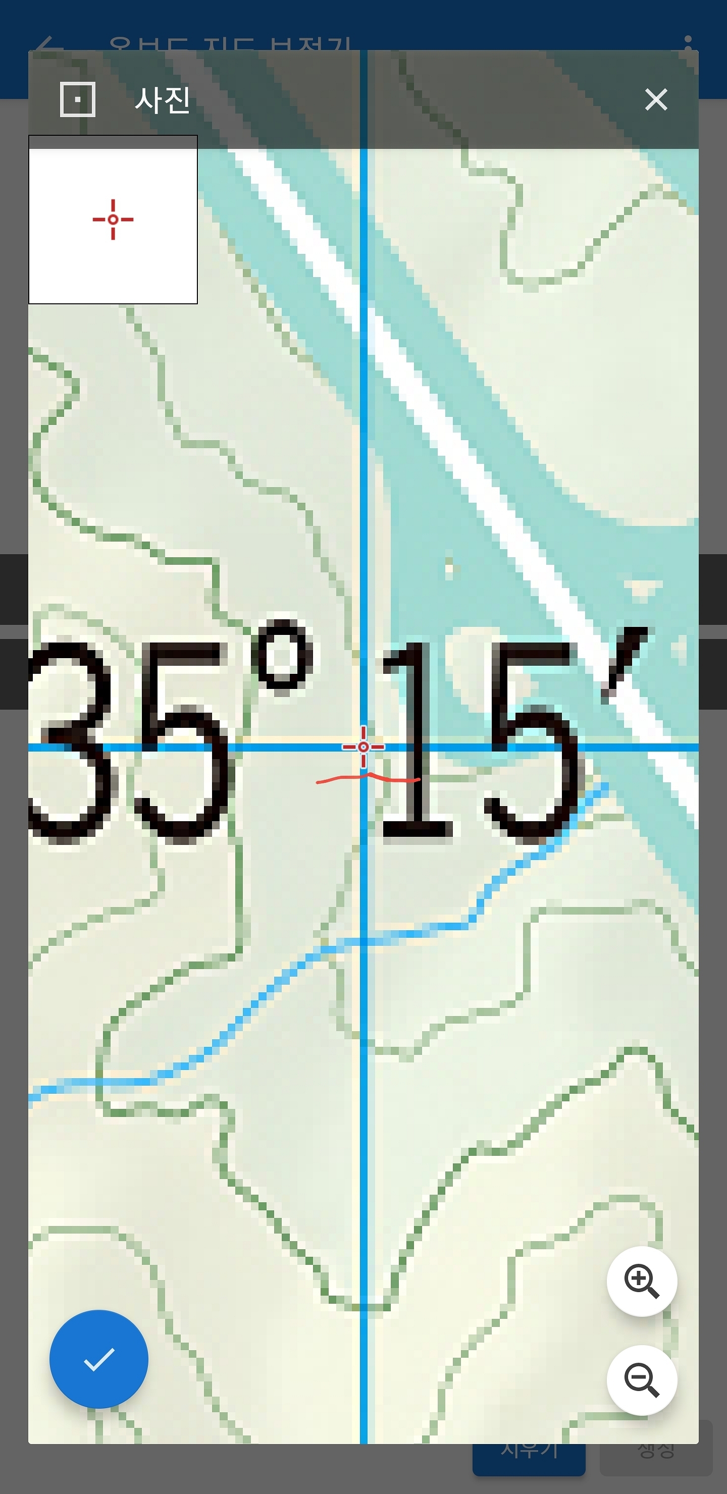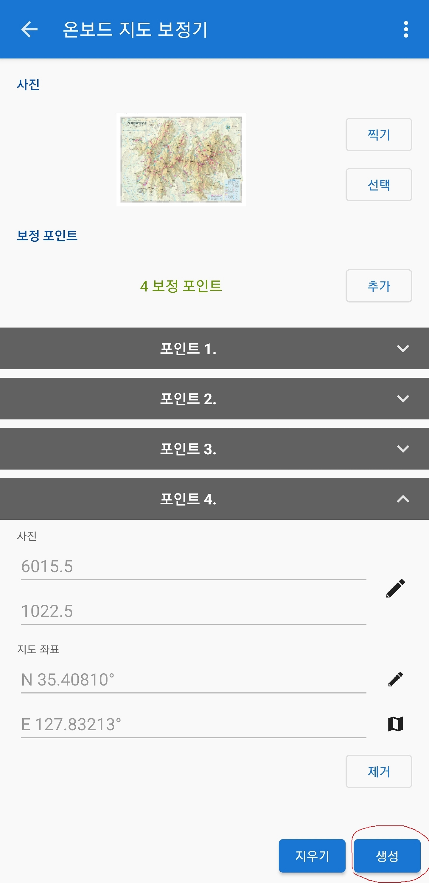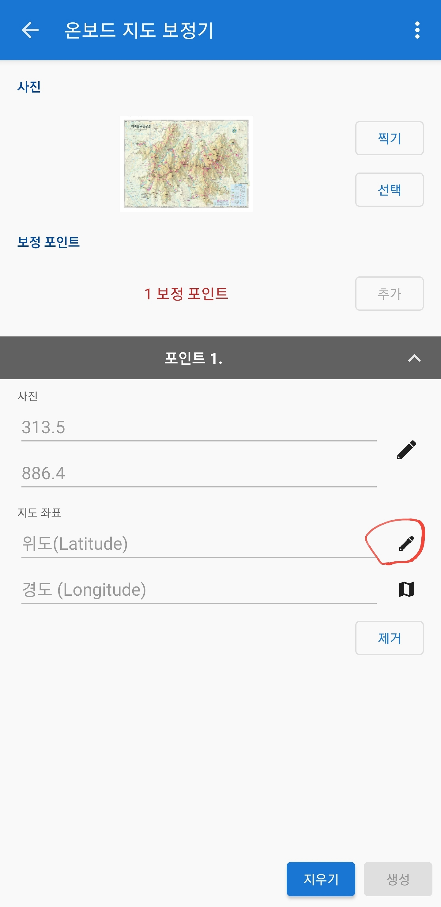 두 번째 지도 좌표 옆에 연필마크(동그라미)를 선택하시면 사진 속 지도 좌표를 가지고 보정할 수 있습니다