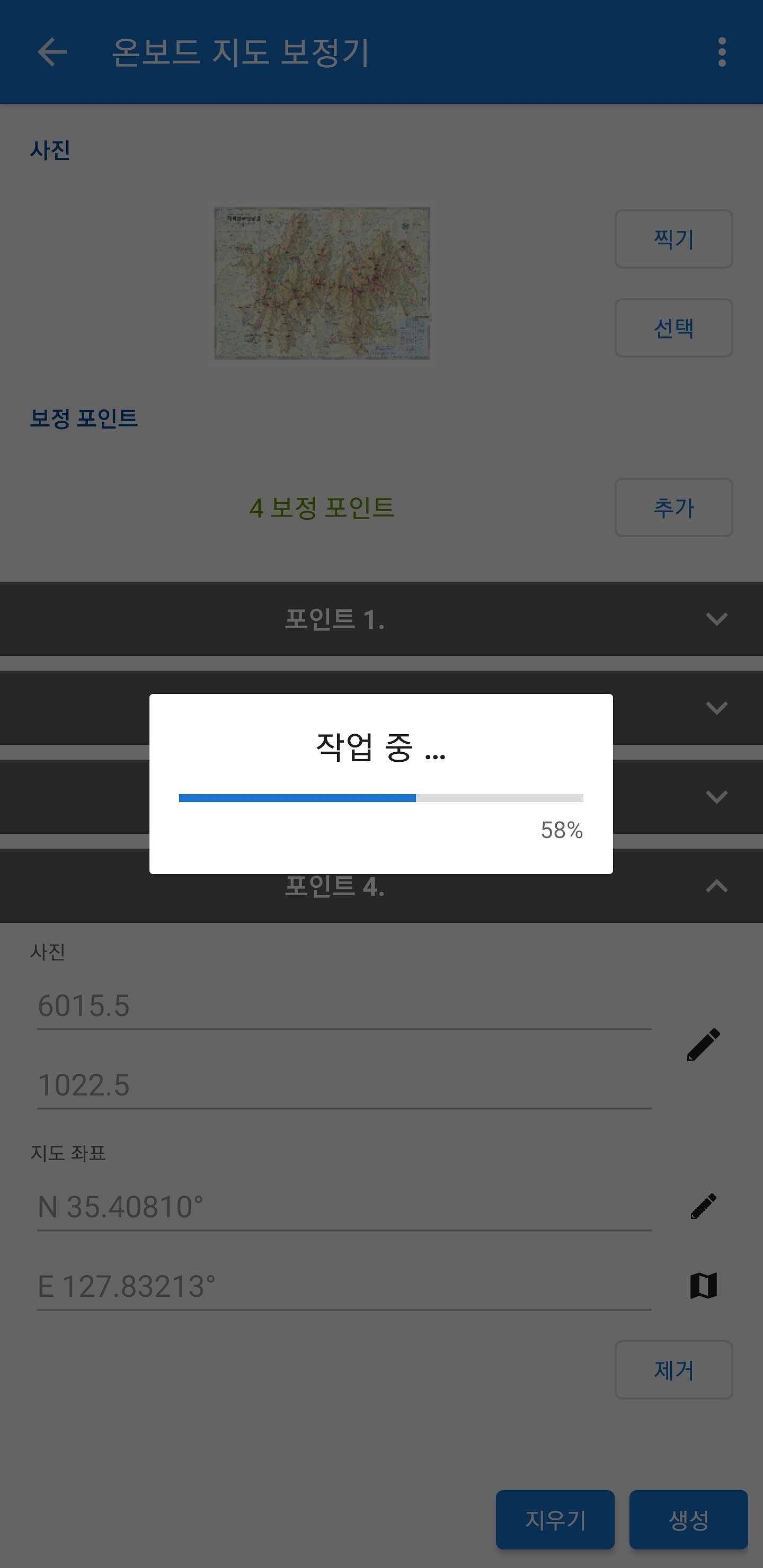 생성을 누르면 그림 용량에 따라 그리고 스마트폰 성능에 따라 만드는 시간이 다릅니다 아마도 제가 샘플로 드린 지도는 고화질 지도이기 때문에 시간이 좀 걸릴 겁니다