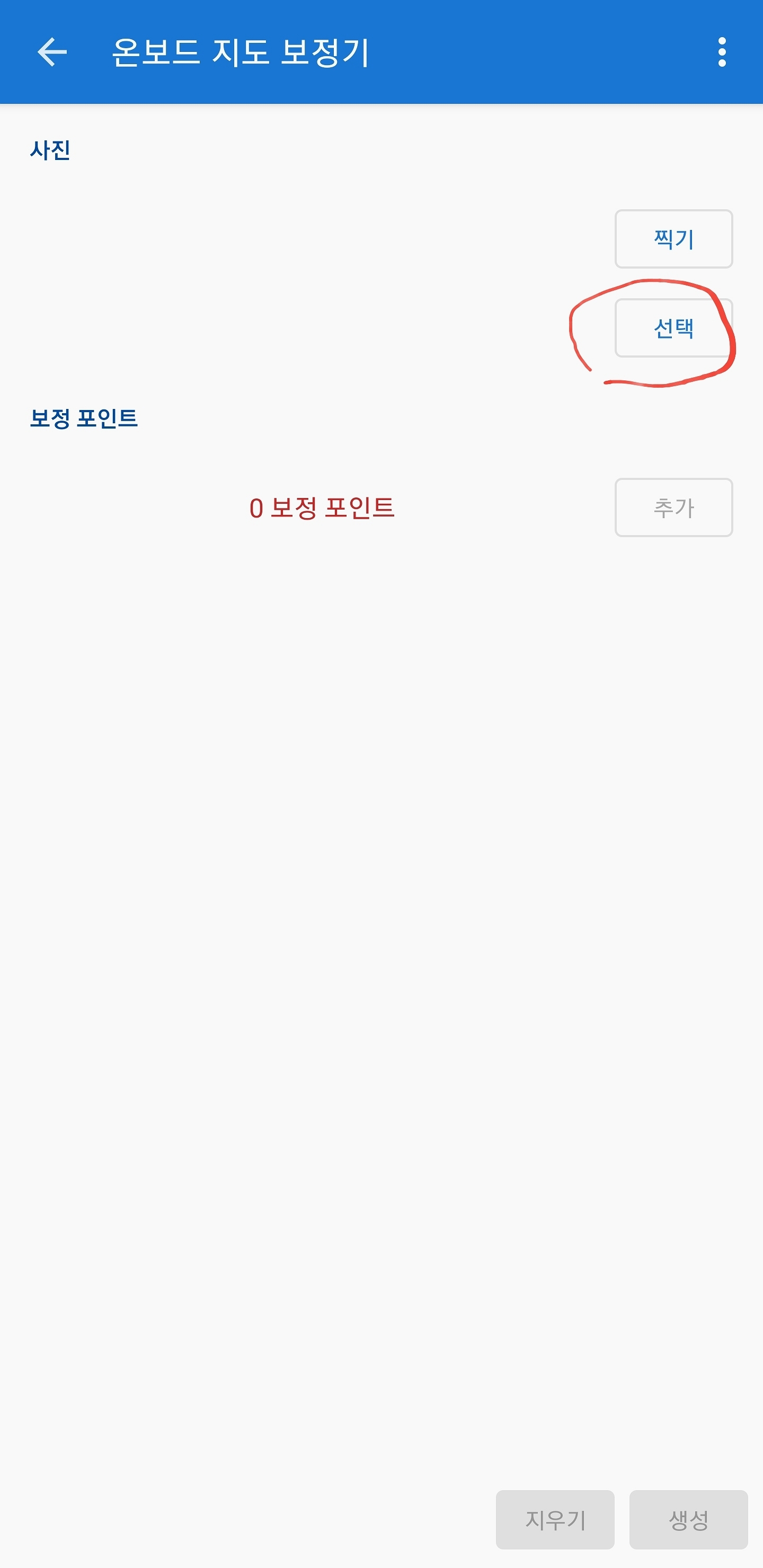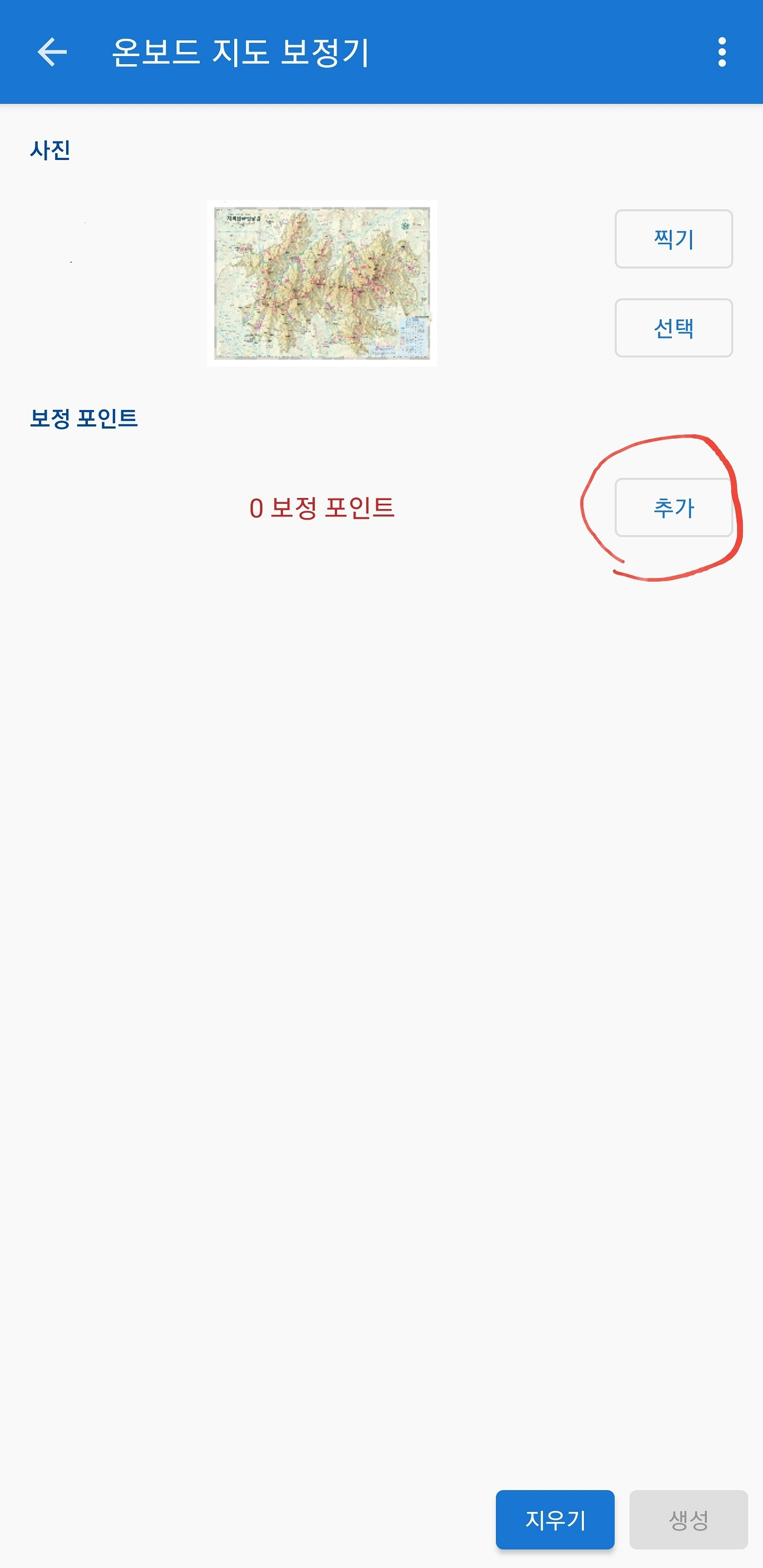 이렇게 보정 기록까지 저장이 되셨으면 왼쪽 사진 아래 "지우기" 버튼을 눌러 다 지워도 됩니다 이렇게 지우면 또 다른 지도를 만들 수 있습니다
