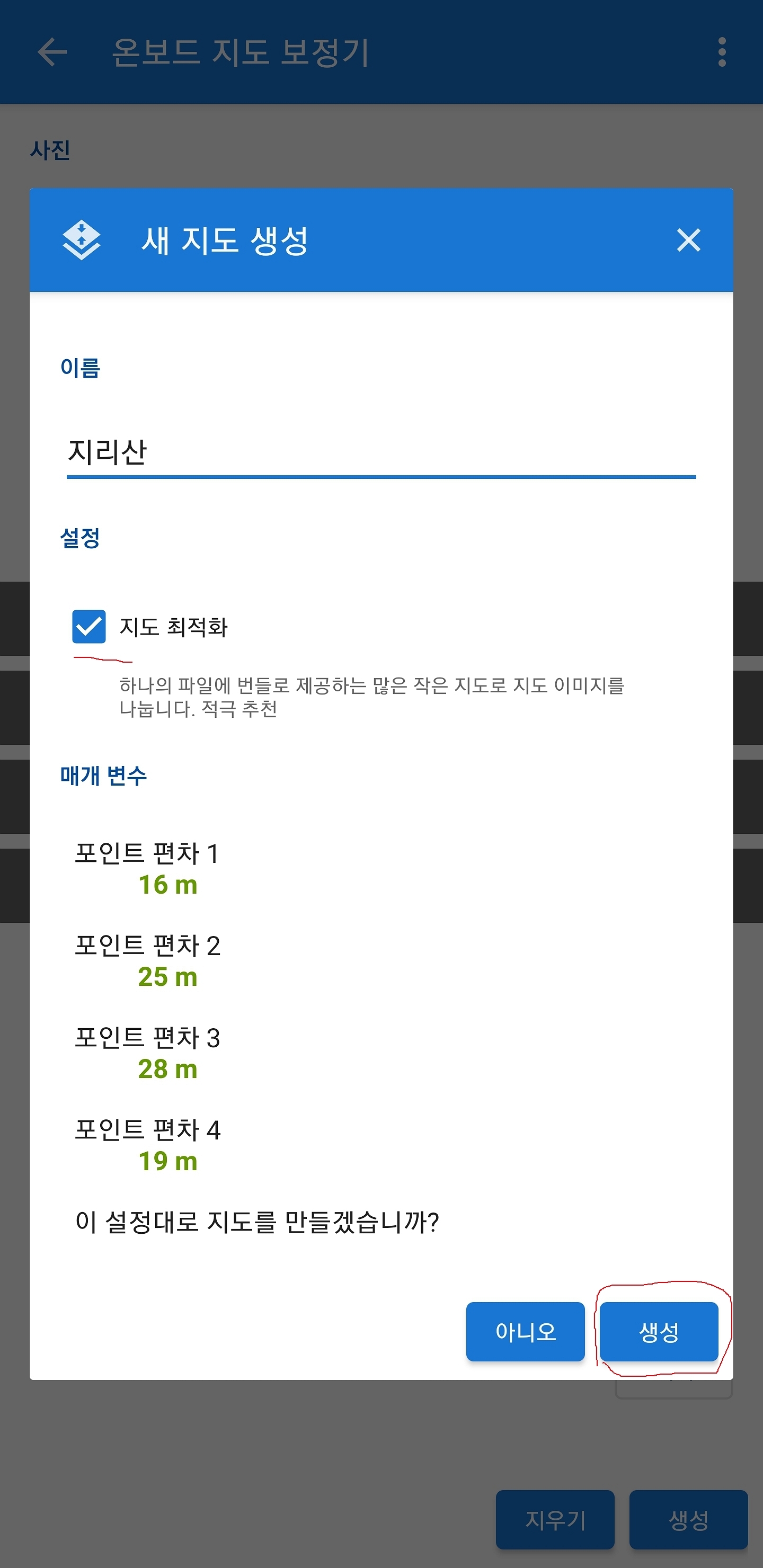 4개의 포인트 보정이 끝나면 사진 속 아래 생성 버튼을 누릅니다 그러면 이름을 쓰는 창이 뜨는데요 보시면 지도 최적화 옵션이 있는데 이건 꼭~ 체크하십니다 매개 변수를 보시면 편차에 대해 나오는데요 보시면 편차가 좀 있죠 이건 일부러 이렇게 제가 만든 건데요 좌표로 만들면 이렇게 나오진 않습니다 암튼 편차가 심하면 아니오를 눌러 다시 만들어야 합니다(그림에 따라 다르겠지만 좌표가 있다면 0~3m 이내가 좋습니다 하지만 10m 안팎으로 오차가 나기도 합니다)