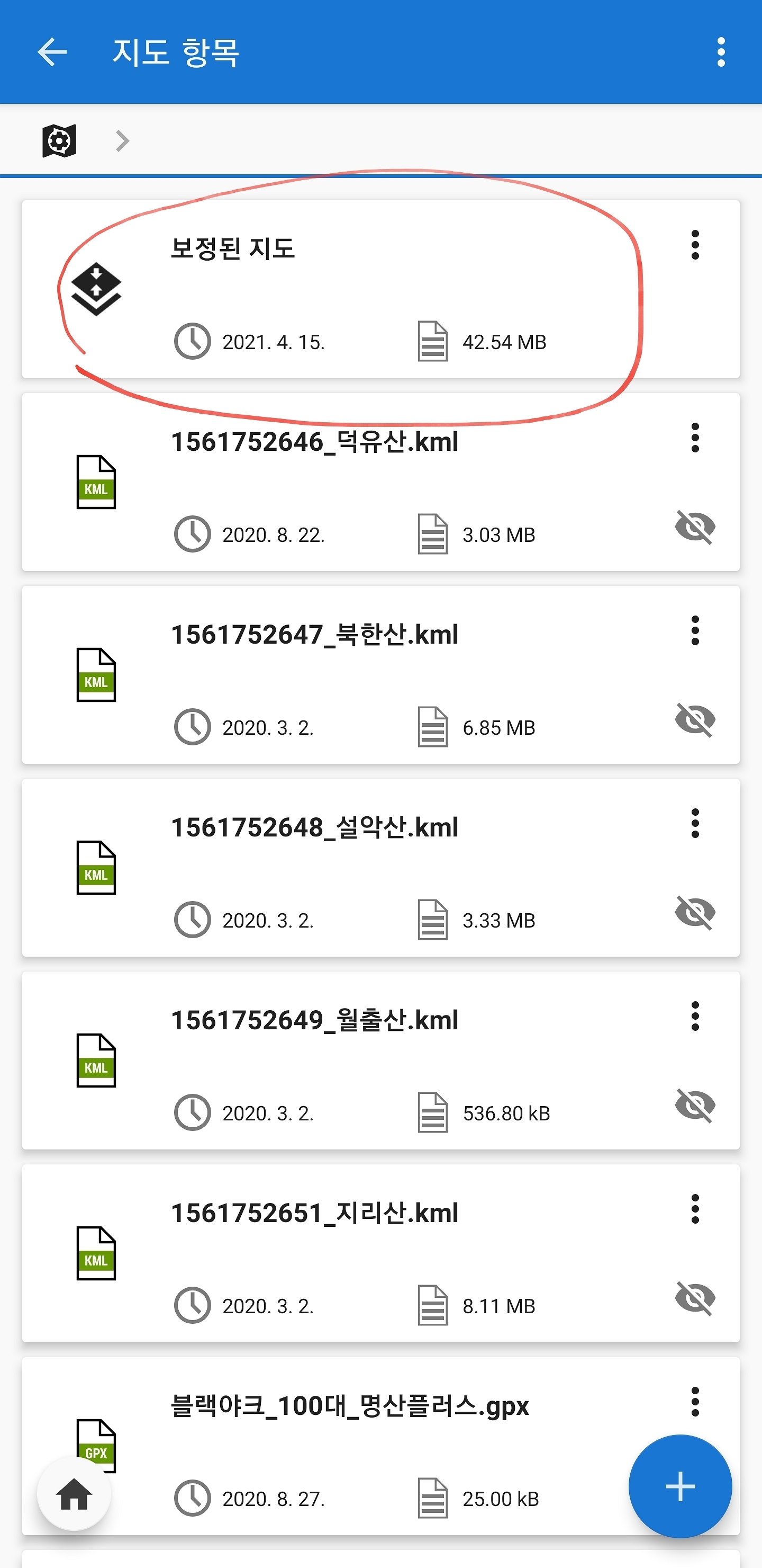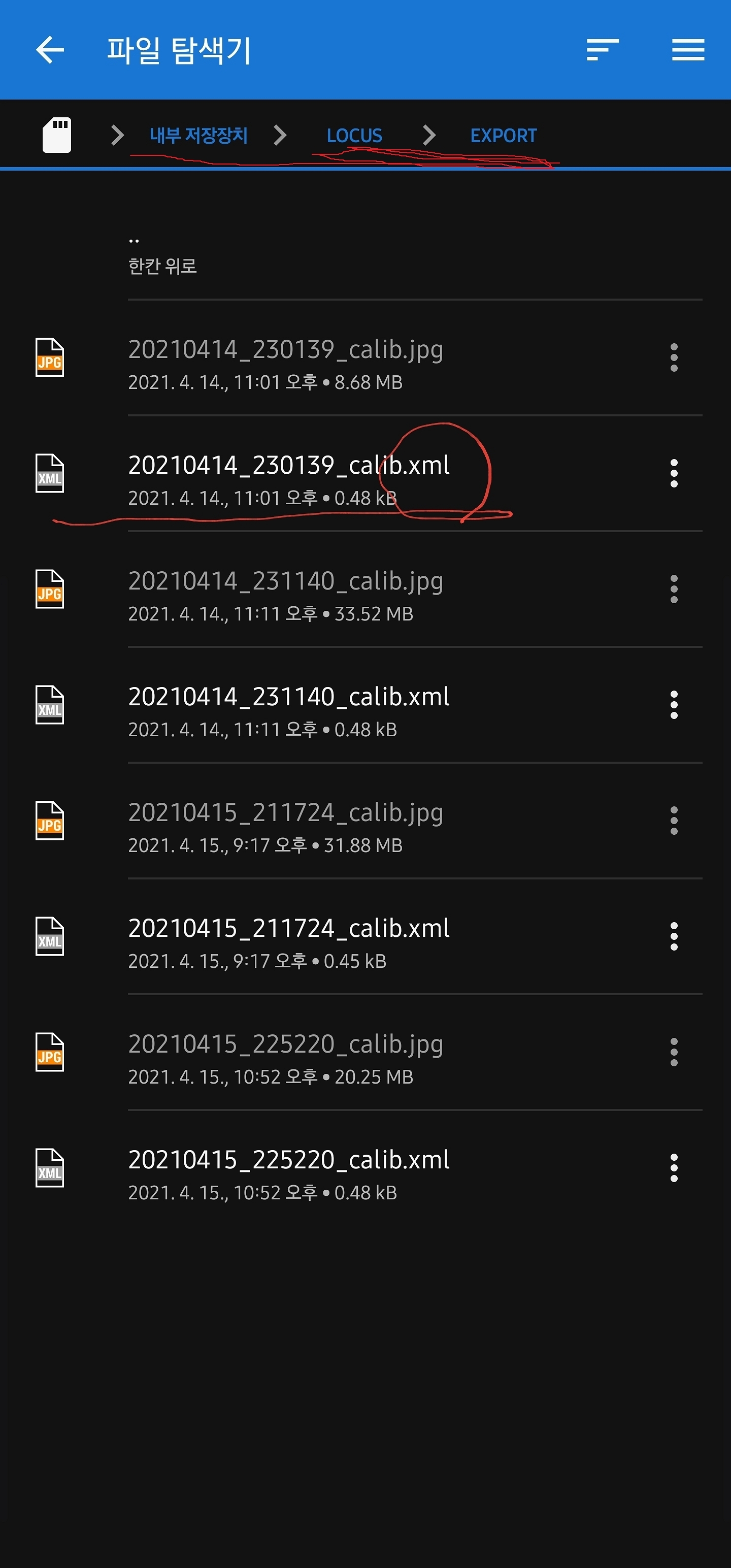 온보드 지도 보정기에서 내가 보정한 기록을 저장할 수 있는데요 상단 점 3개를 누르면 보정을 저장 할 수도 있고 가져올 수도 있습니다 기록은 오른쪽 사진 상단에 나온 폴더에 기록이 되고 불러오는 건 동그라미 친 확장자(.xml)만 불러오시면 됩니다