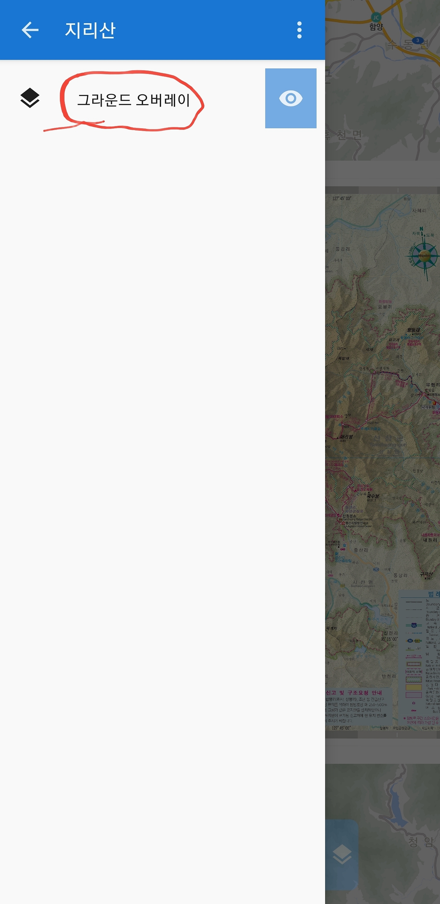 활성 항목을 눌러서 들어가서 보시면 지금 만든 지도가 보이는데요 옆에 눈깔 마크를 누르지 마시고 동그라미 친부분을 누르면 투명도를 조절해서 배경지도와 겹쳐서 사용할 수 있습니다